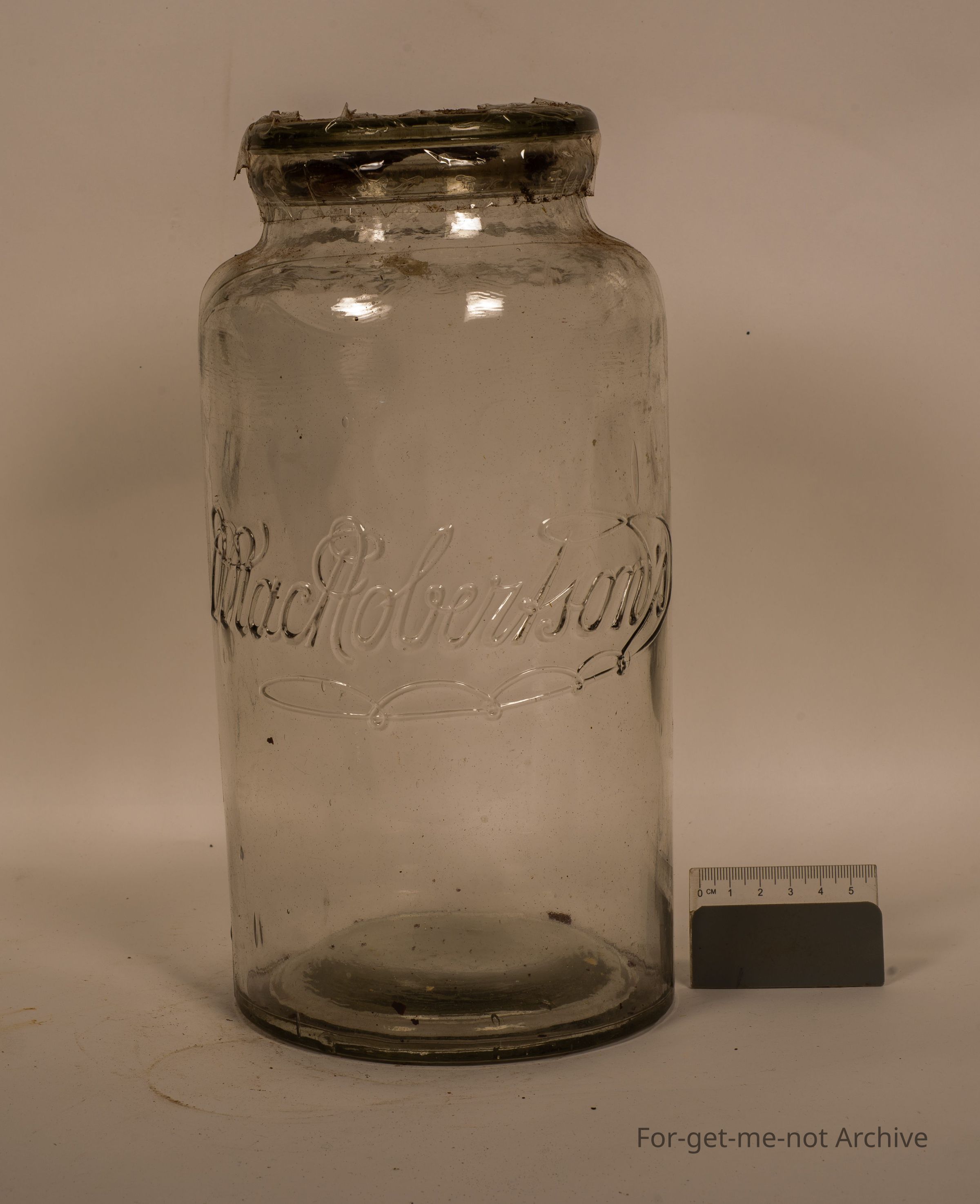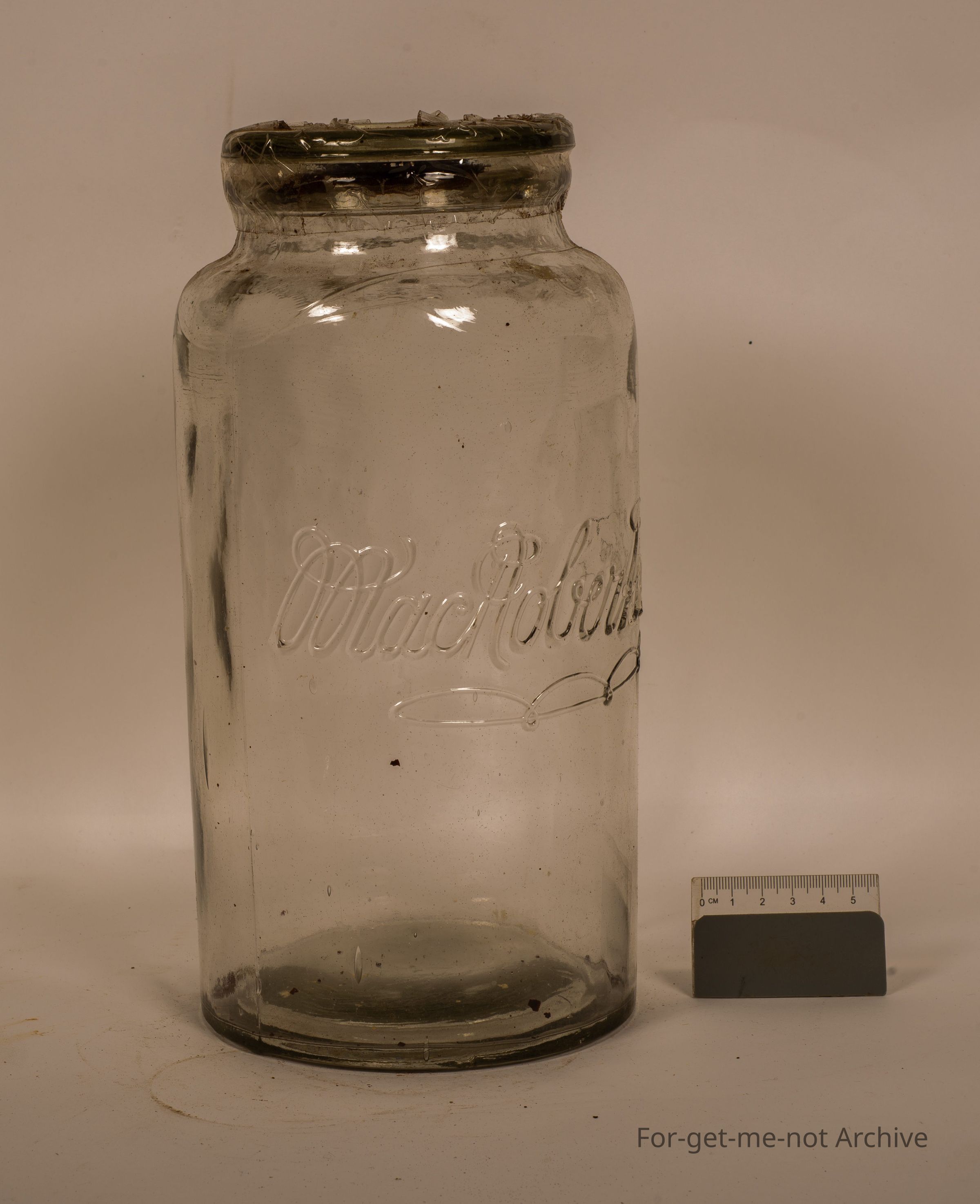 Glass sweet jars. This is a large one This is heavily embossed with the original MacRobinson signature. A very delightful graphics. This has the original lid in excellent condition.Collection
