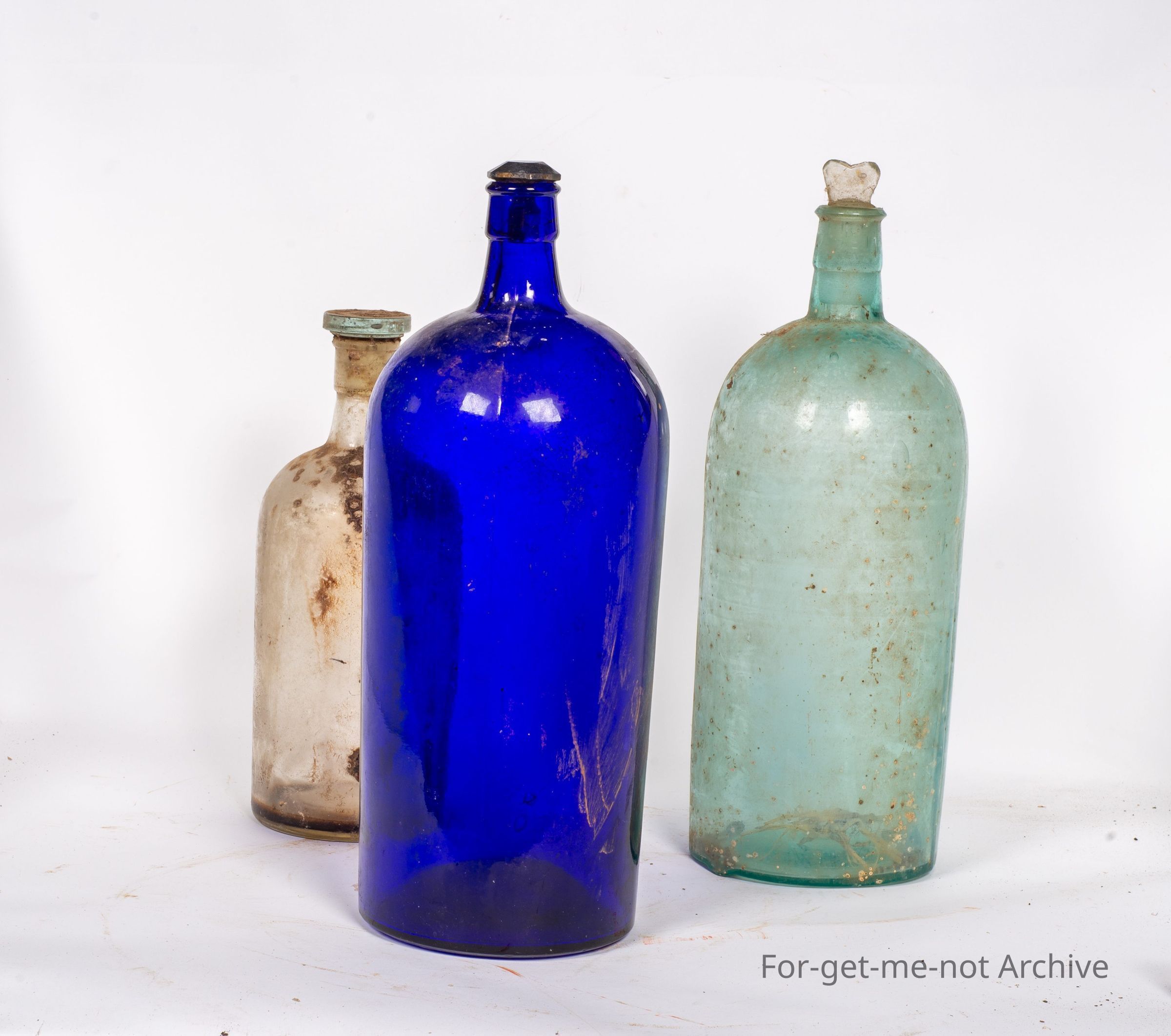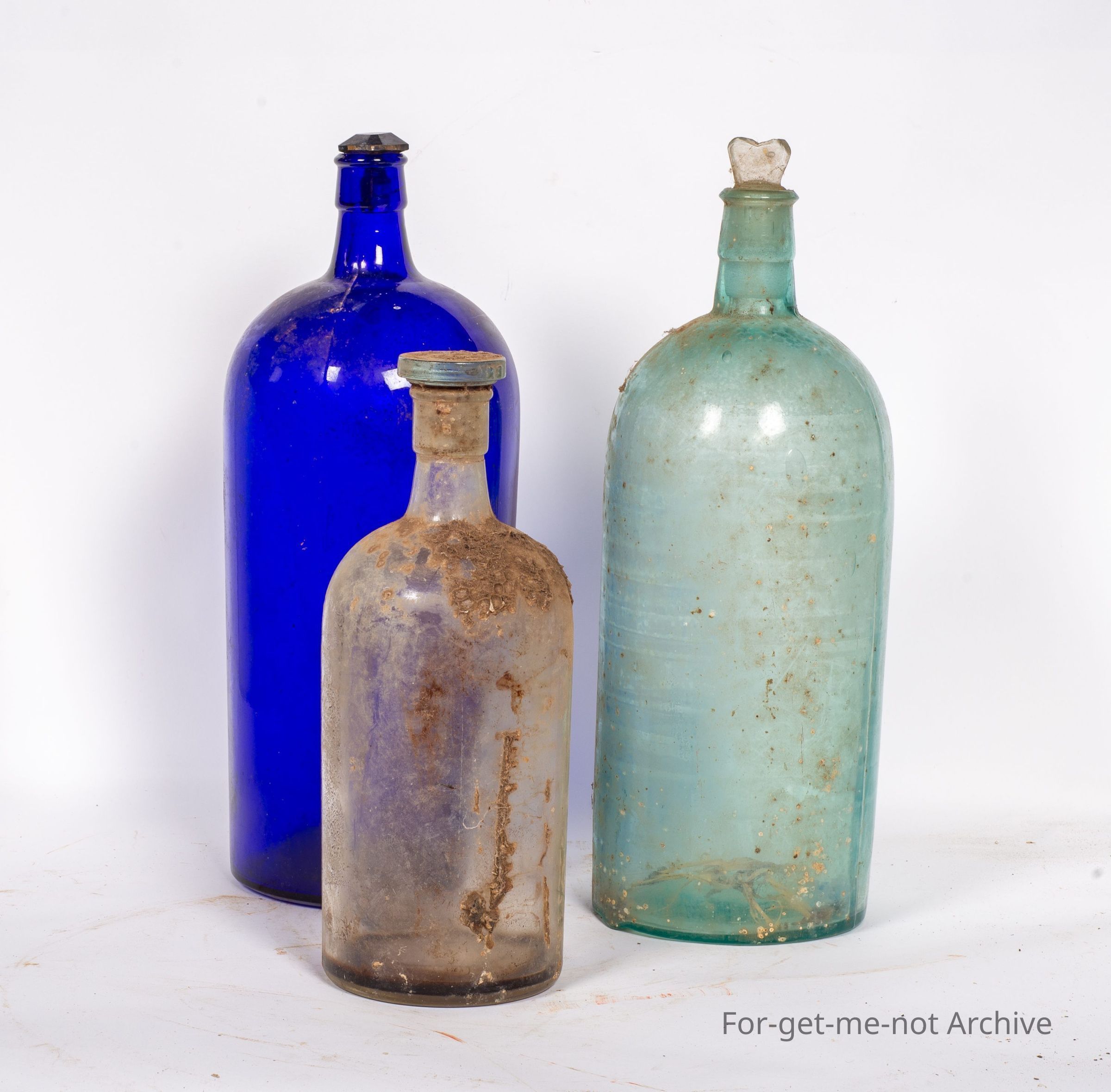 These are 3 chemist jars, 2 of equal size, 1 blue, 1 a pale green, and the third one is a clear glass one. They all have a glass stopper.