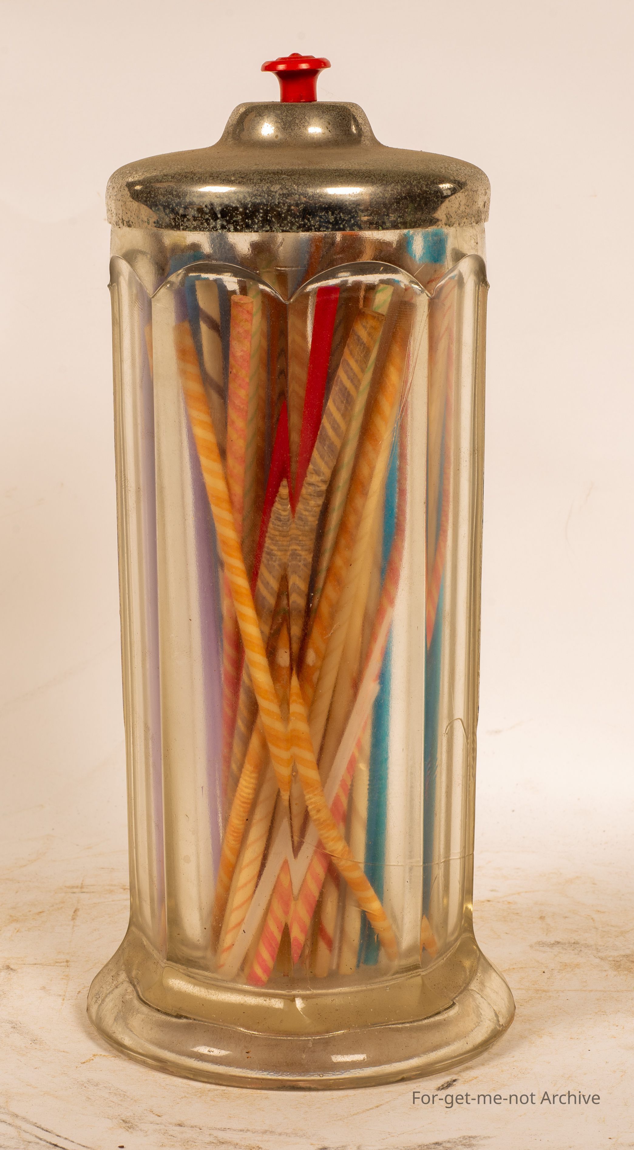 This is a glass straw dispenser, metal lid. This is for holding the straws for milkshakes or any other milk bar drink. This is quite a desirable piece. Not easy to find. This one's in excellent condition. Filled with straws.Collection