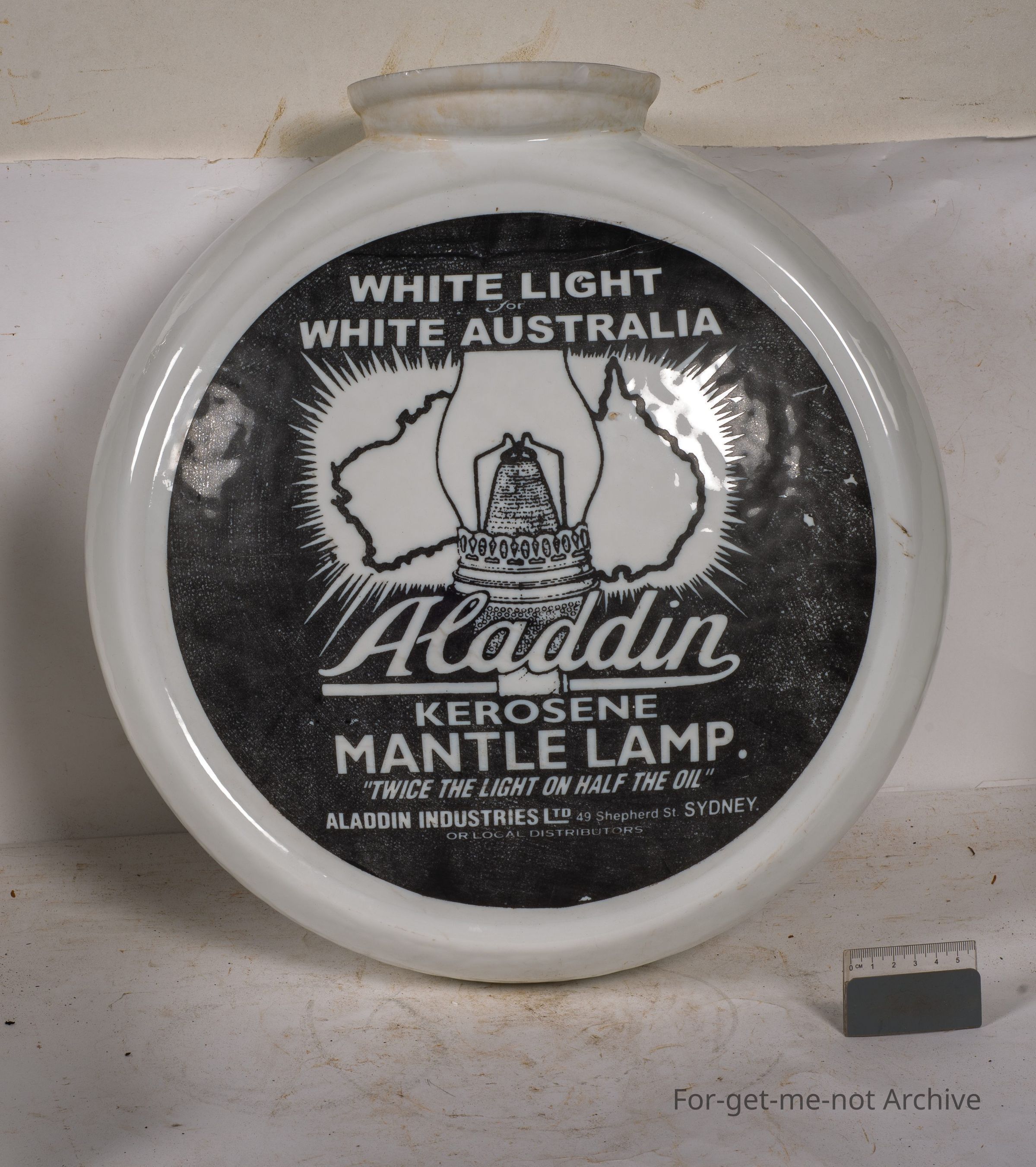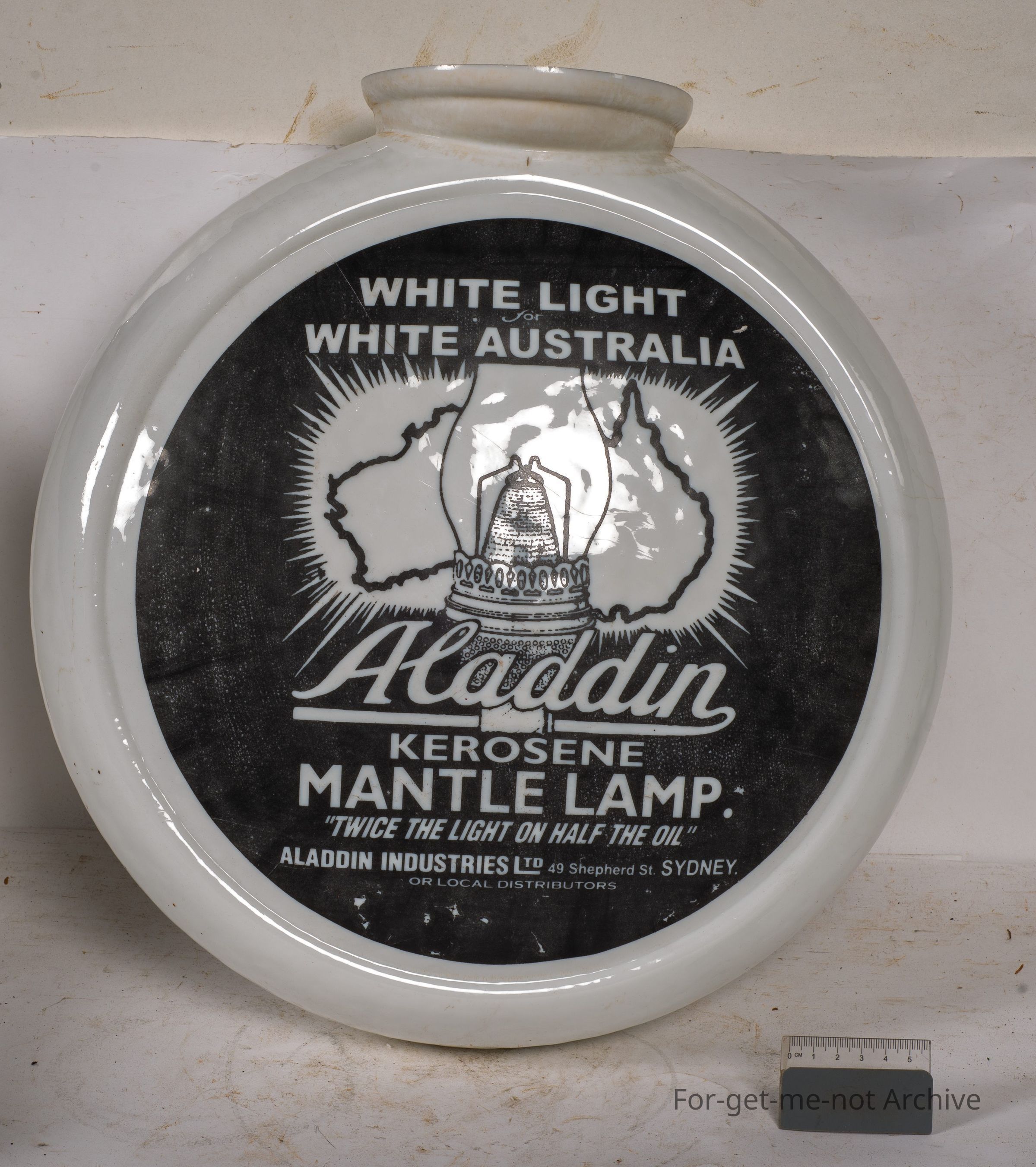 Sangeet Collection. This is a glass globe. This is a glass globe advertising Aladdin Kerosene Mantle Lamp and Map of Australia in the background. These things are quite heavy. Made for Aladdin Industries Sydney. The white light for white Australia.Collection