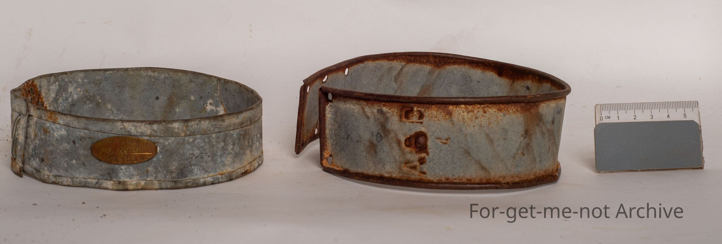 These are 2 tin goat collars from the Blackall Shire in Queensland. A little copper shire plaque tacked into the tin. The owner's identification and the goat number is also, stamped into the tin work. Very hard to find. These were once common, in the outback areas because goats milked on dry feed where a cow wouldn't.Collection
