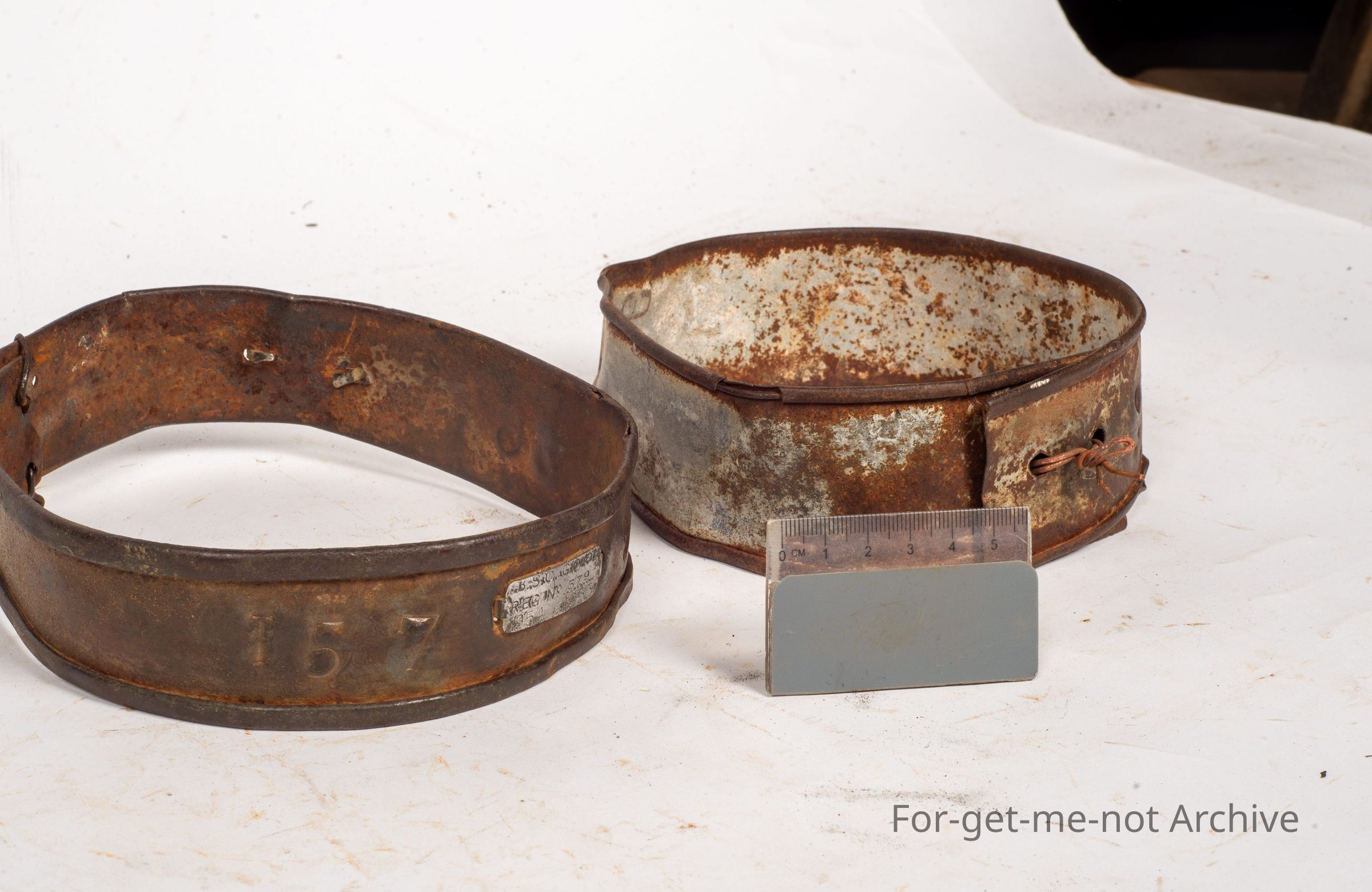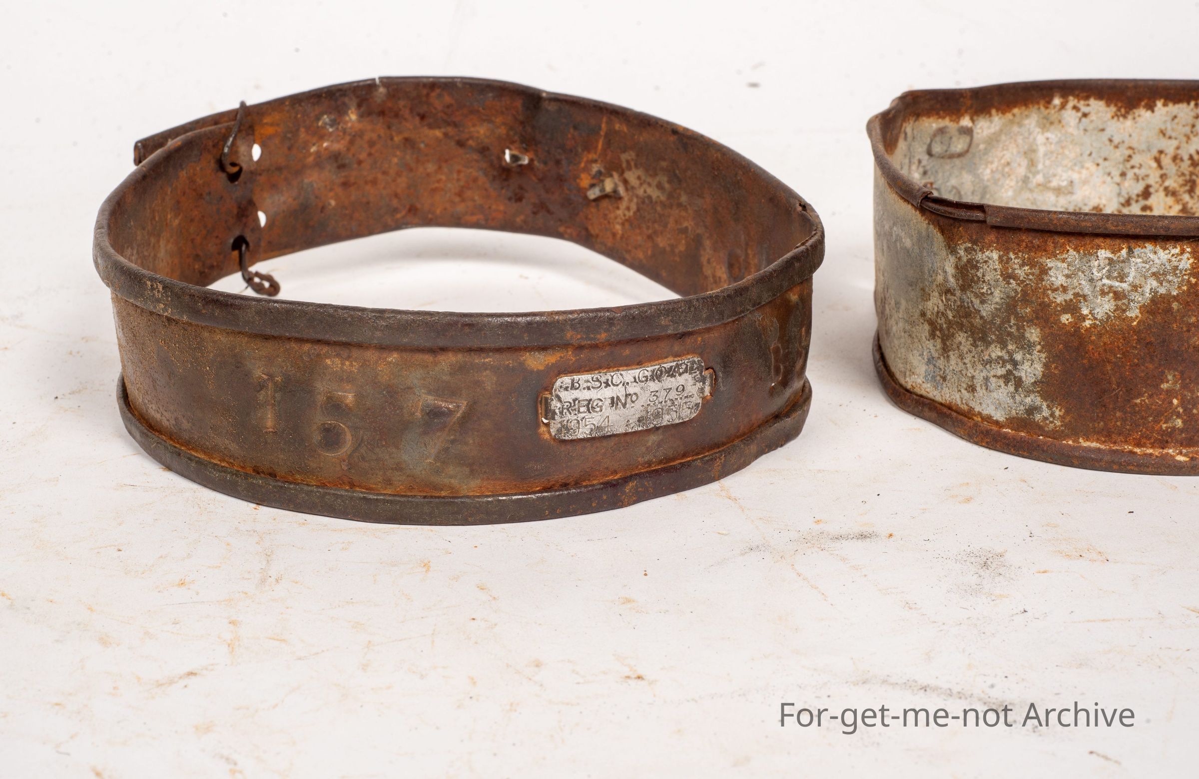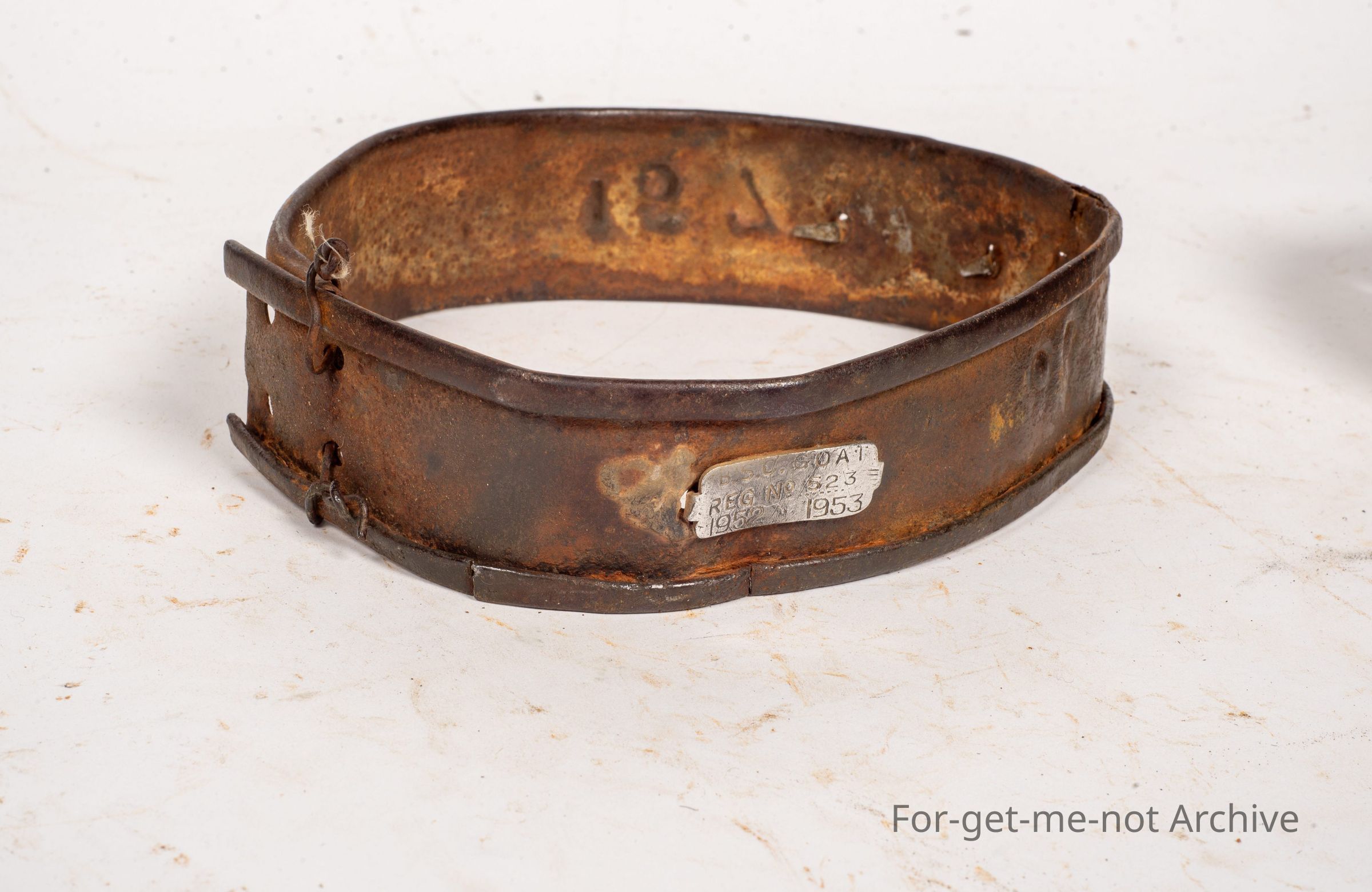 These are the tin collars worn by goats in Western New South Wales and Queensland when they were put on to the town common. The identification of the shire was on a little plaque, clipped into the tin work. The, identification of the owner was stamped into the collar itself. The fee had to be paid every 3 or 6 months as part of using the common. Very hard to find,Collection