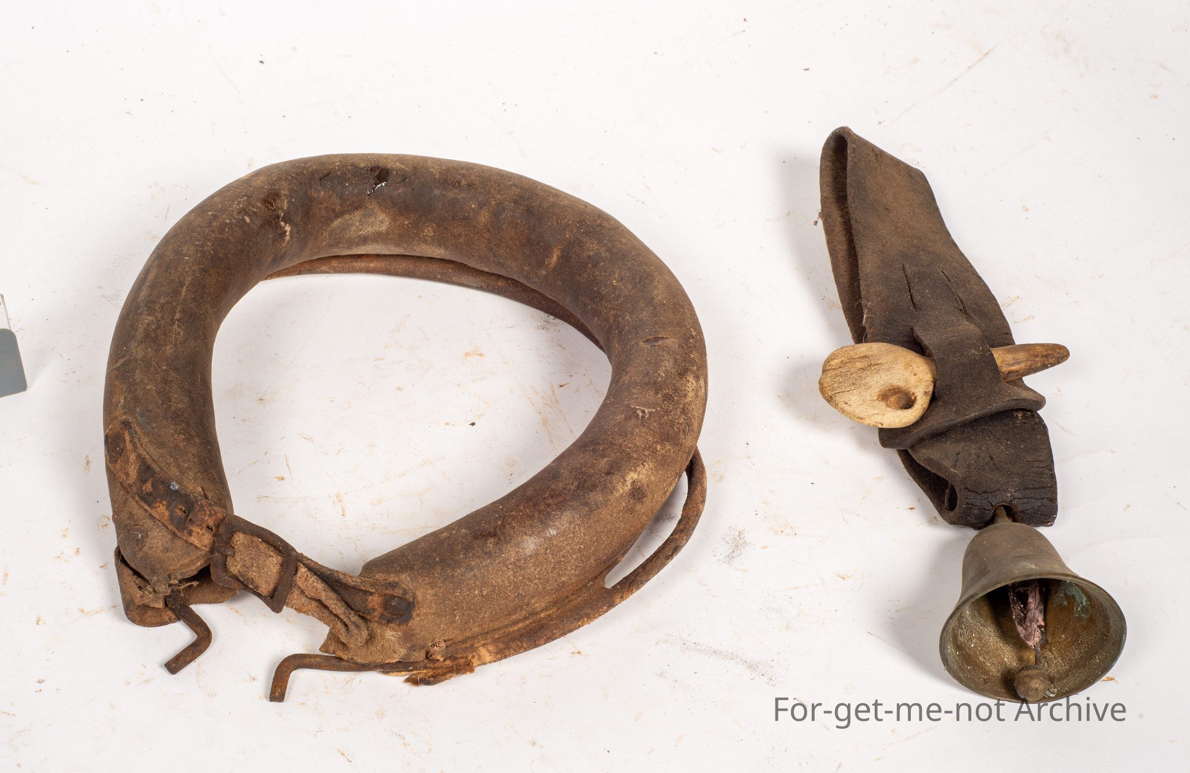 , This is the collard that went around a goat that was put in a cart around the neck. Also with it is, goat barrel, the beautiful bone, keeper on the leather strap around the neck. Both these items are extremely rare to find from the period when goats were used commonly by kids.Collection