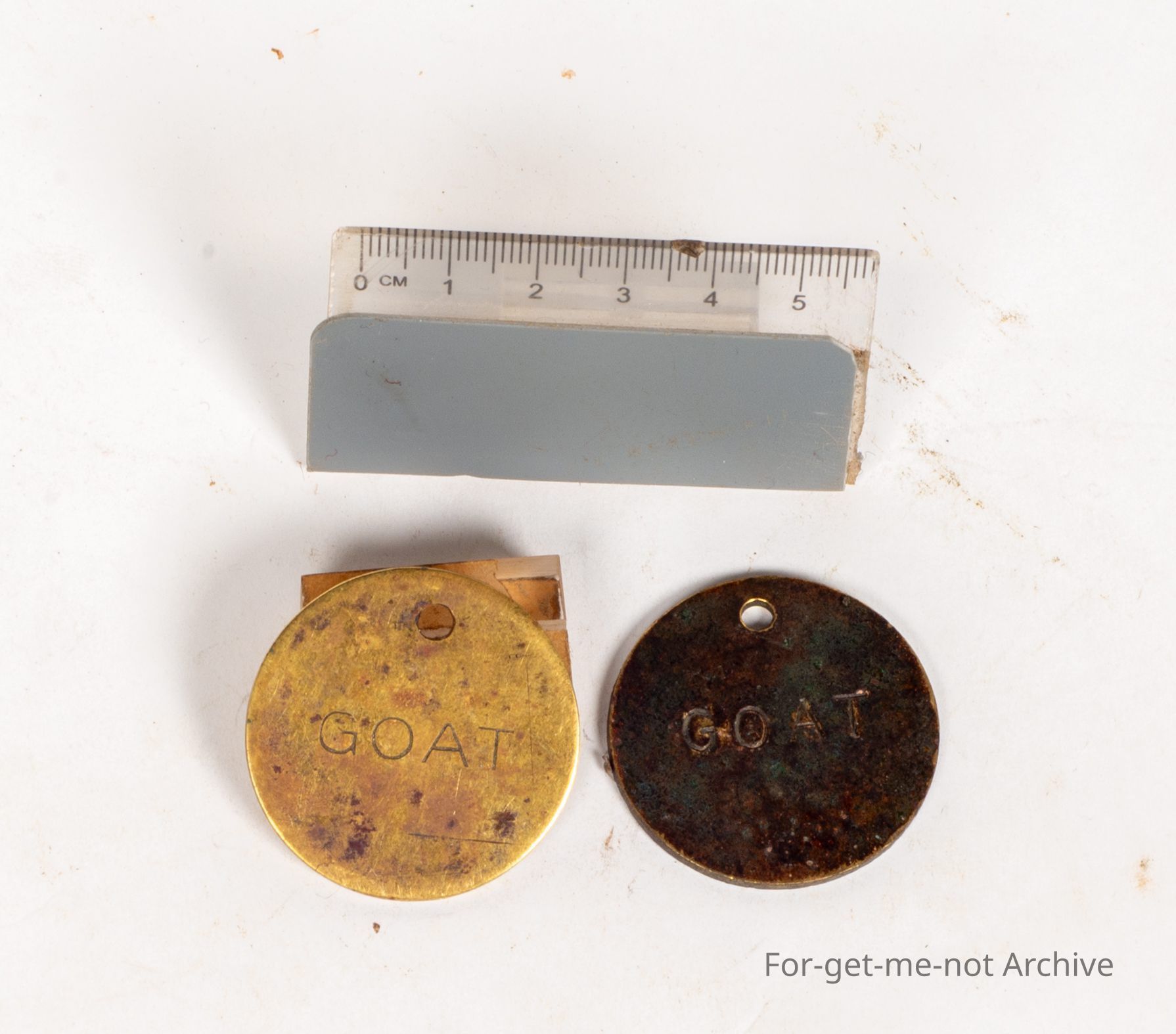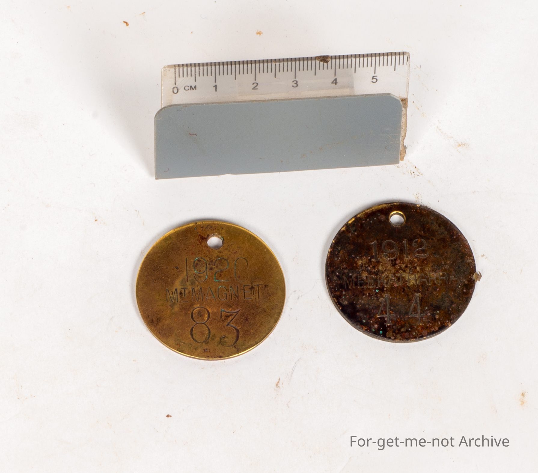These are 2, circular tags of brass for the registration of a goat in Western Australia. The first one, Meekathara 1912 stamped goat. The second one, Mount Magnet, 1920, stamped goat. Very rare pieces.Collection