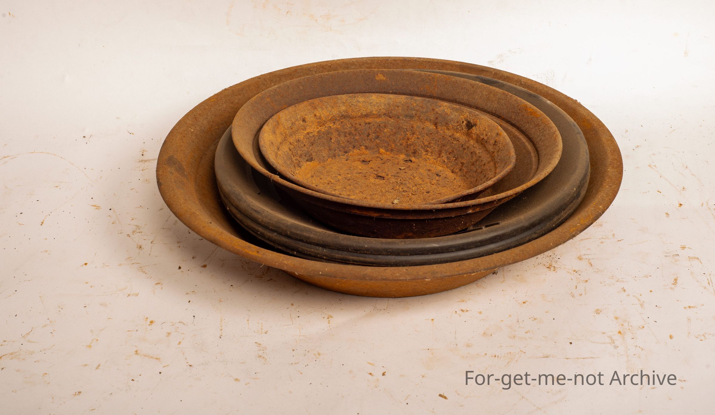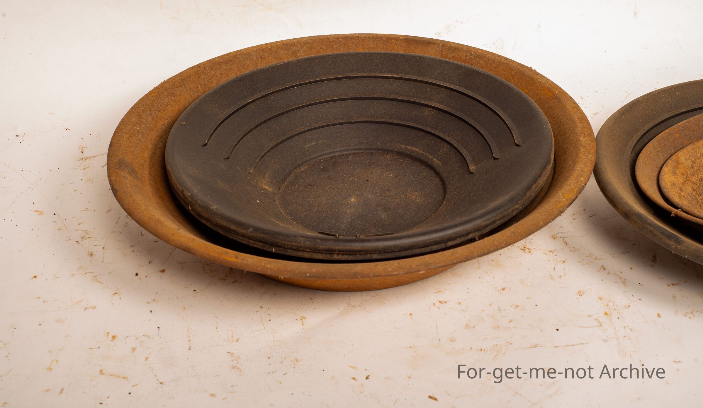 These this is a group of gold panning dishes, some metals, some couple of modern plastic ones, various sizes, all with the gold catching rim,