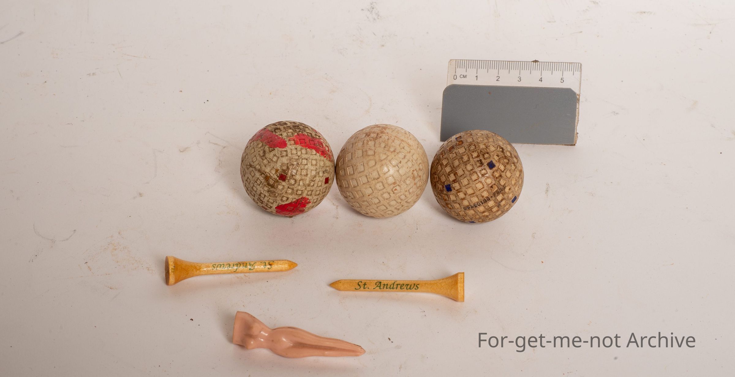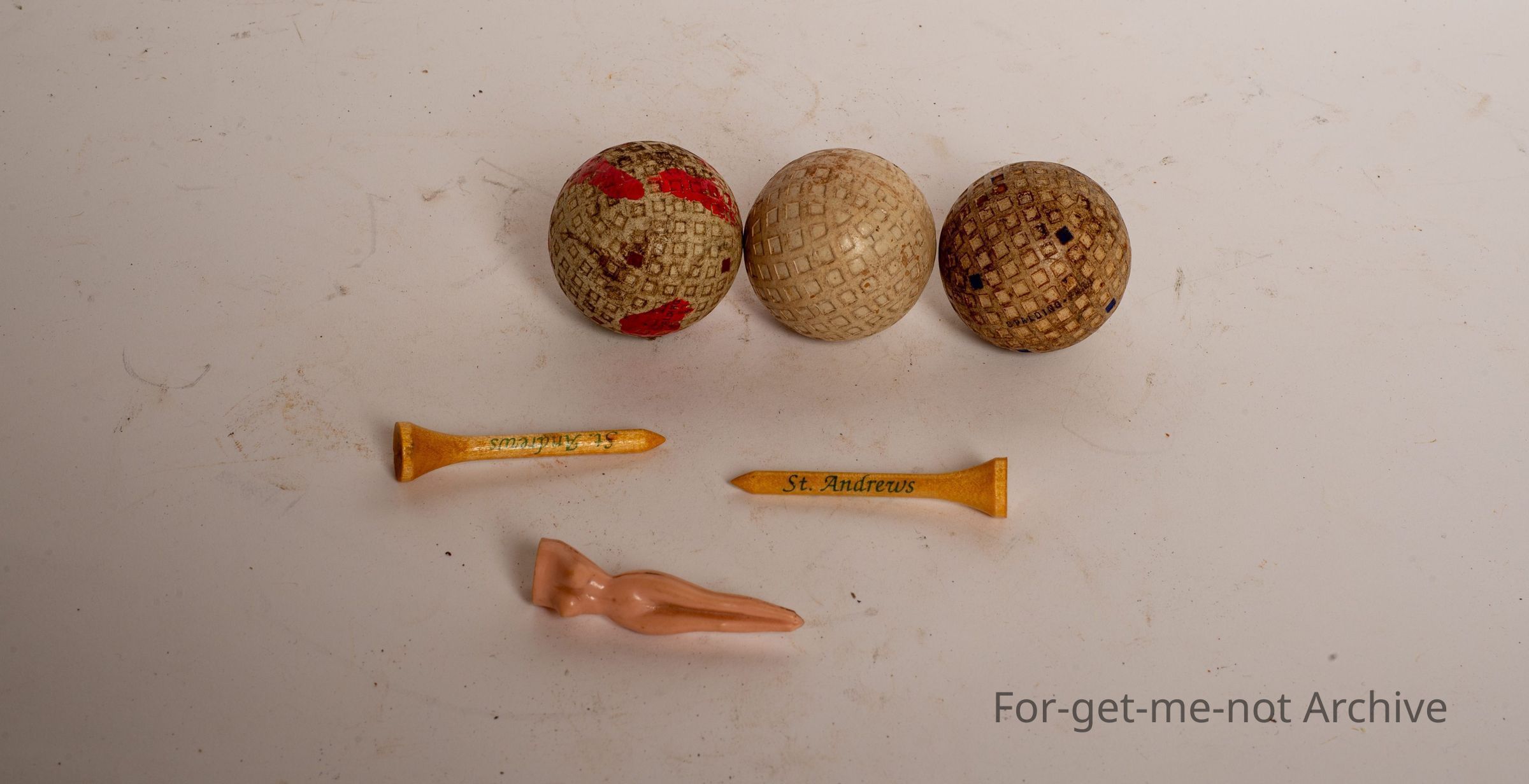3 1920s golf balls called square dimples. Very hard to find. These 3 are in very good condition. As well as the golf balls. There's 3, tees. 1, a comical one, of a half naked woman. Another one says Saint Andrews. Well, the other 2 are both wooden ones from Saint Andrews in Scotland. The group of 3 golf balls and 3 good teesCollection