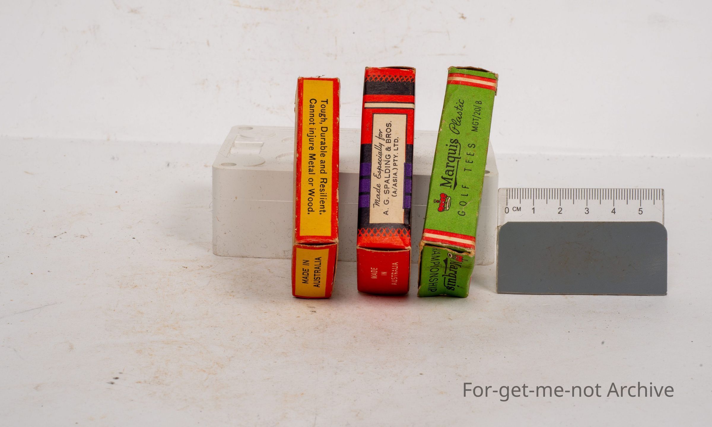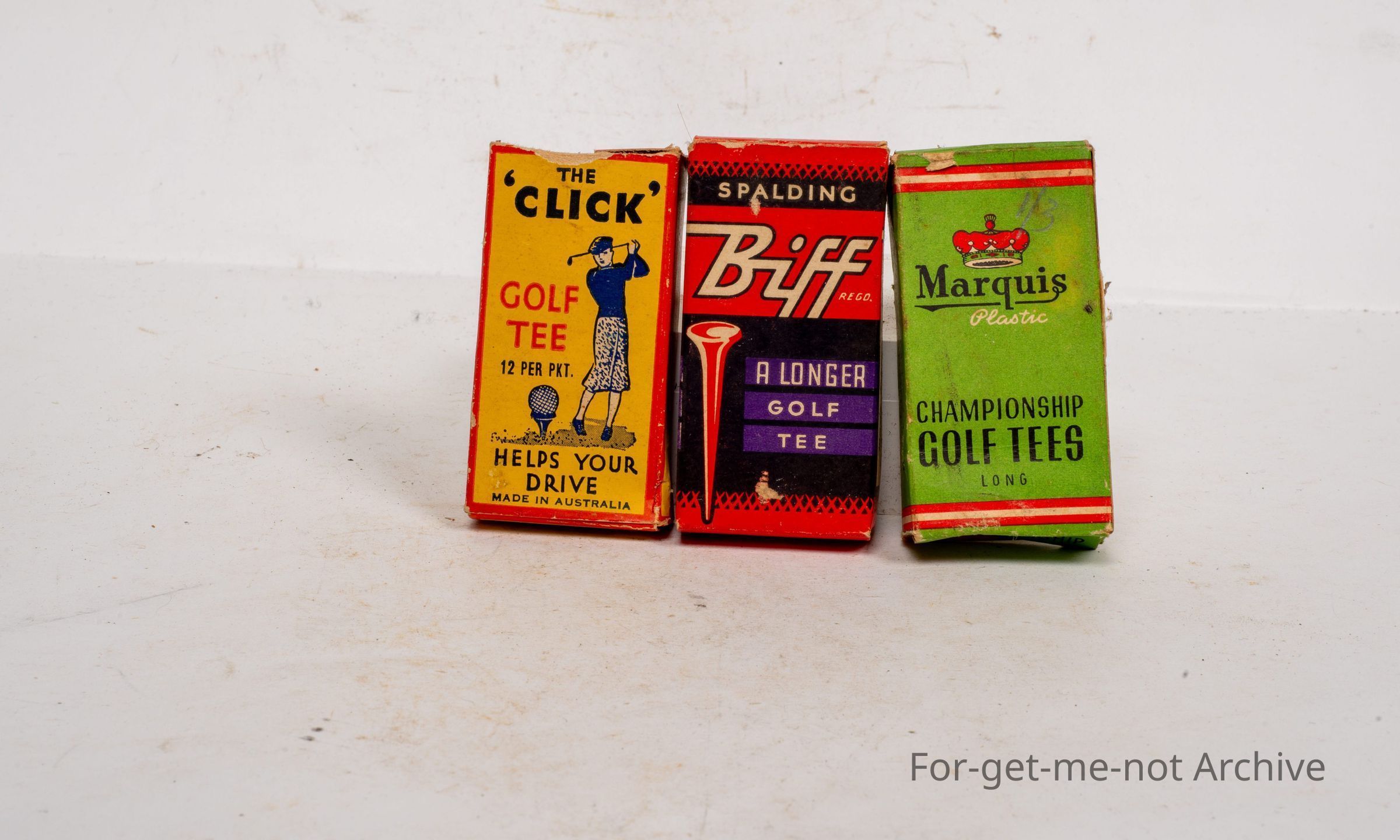 3 cardboard boxes of golf tees. 1 called Biff Spalding. The other one is called Marquis. The third one is called Click.