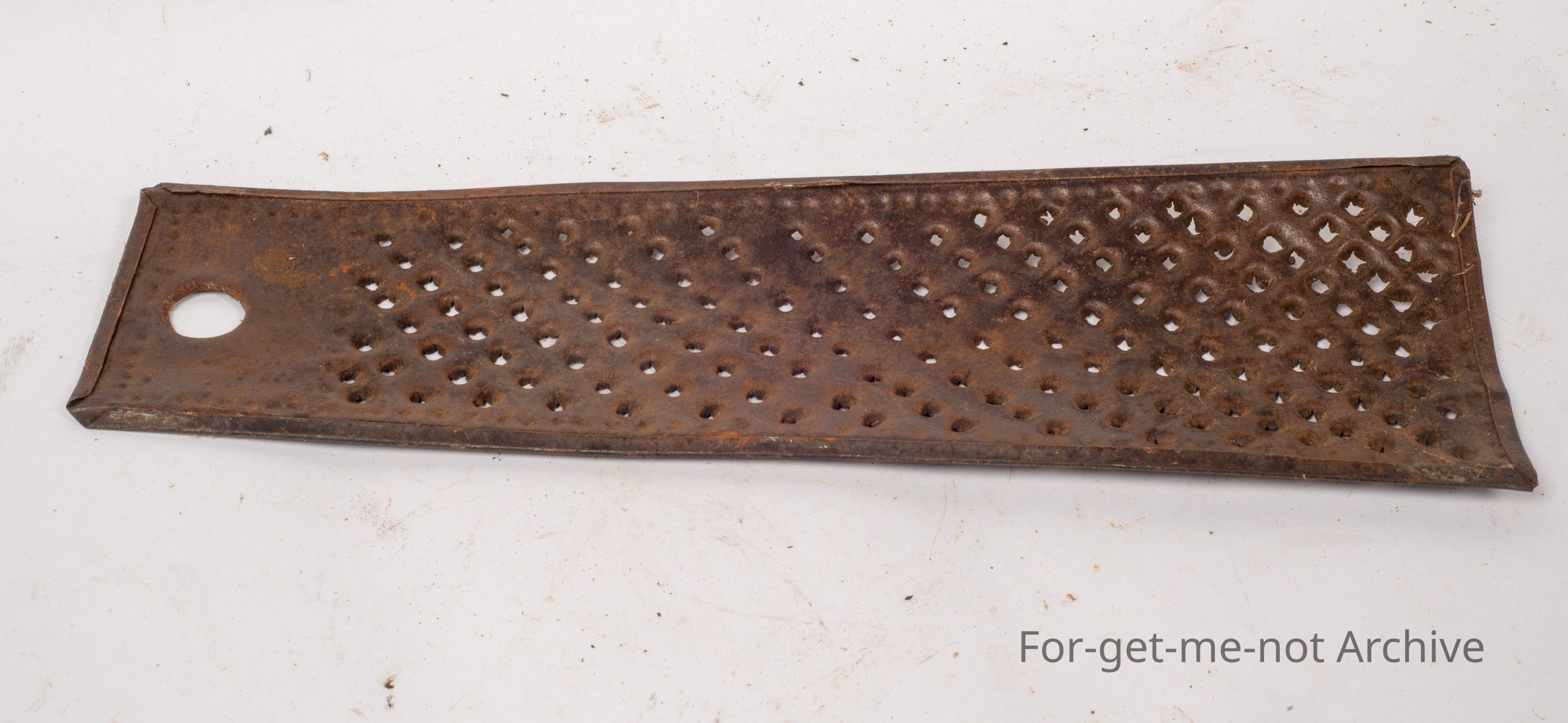 A wonderful example of improvisation from the Depression era. This is a piece of tin with the edges folded in. It has been shaped, into a curved piece and it has nails in a pattern perforating the whole surface to turn it into a grater for the kitchen. This is a wonderful piece of improvisation.Collection