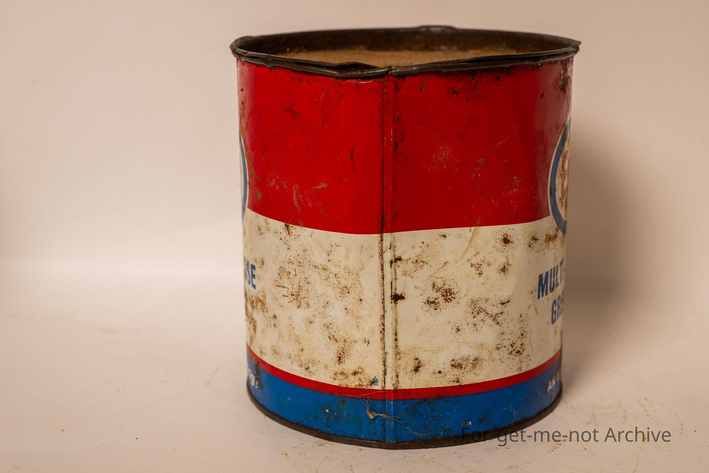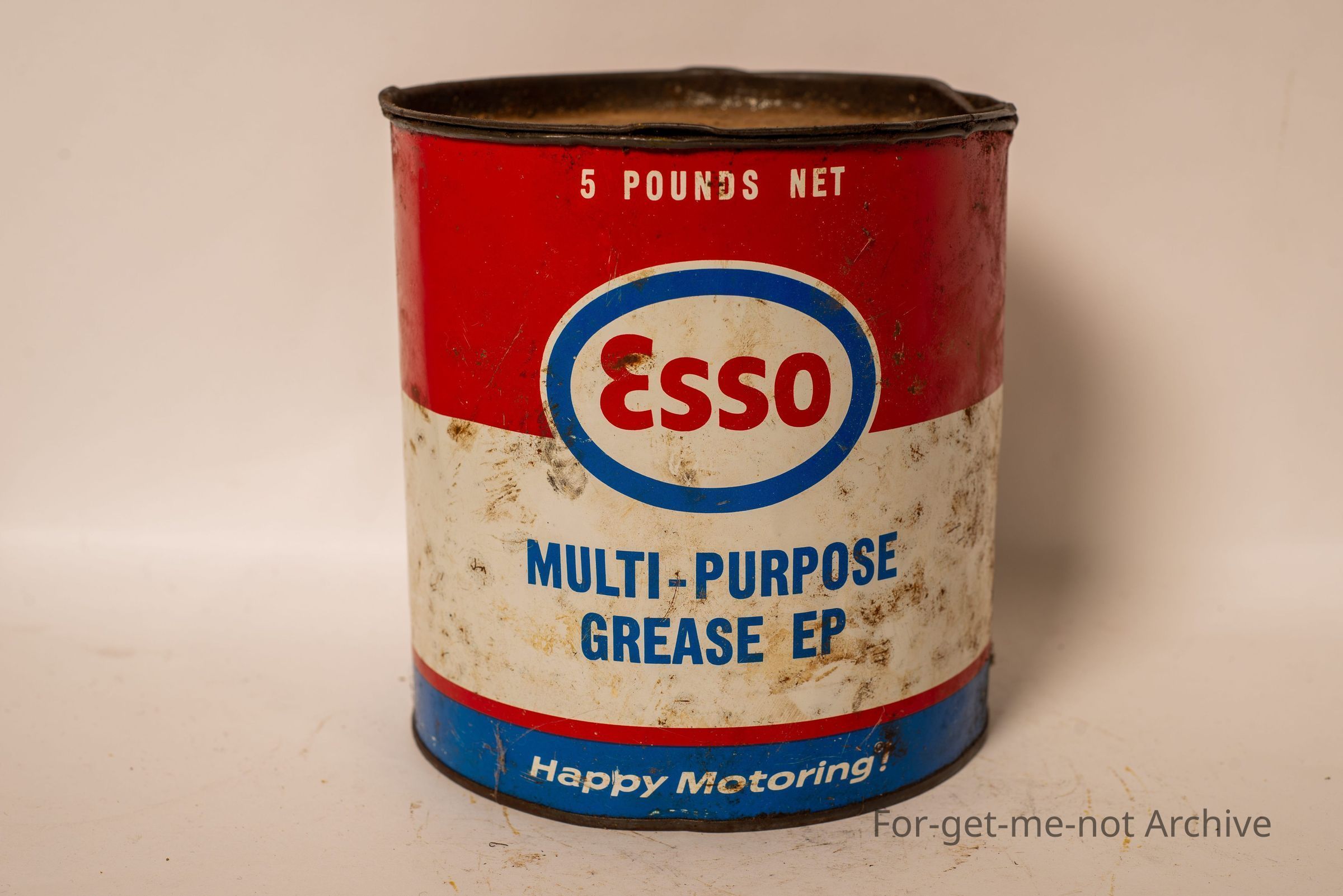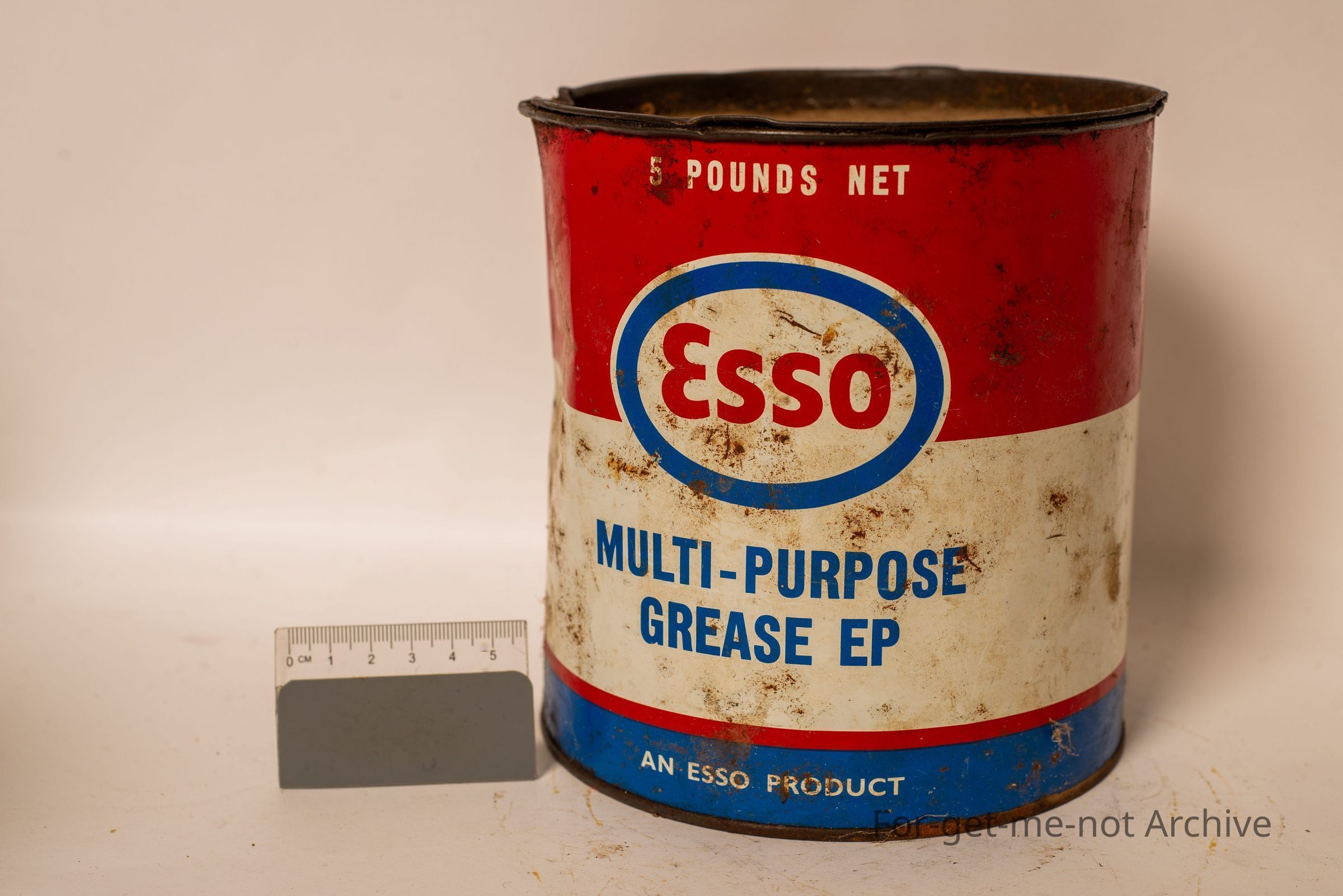 Esso , multipurpose grease, 5 pound capacity. No fading on this. Still quite good. Reasonable shape