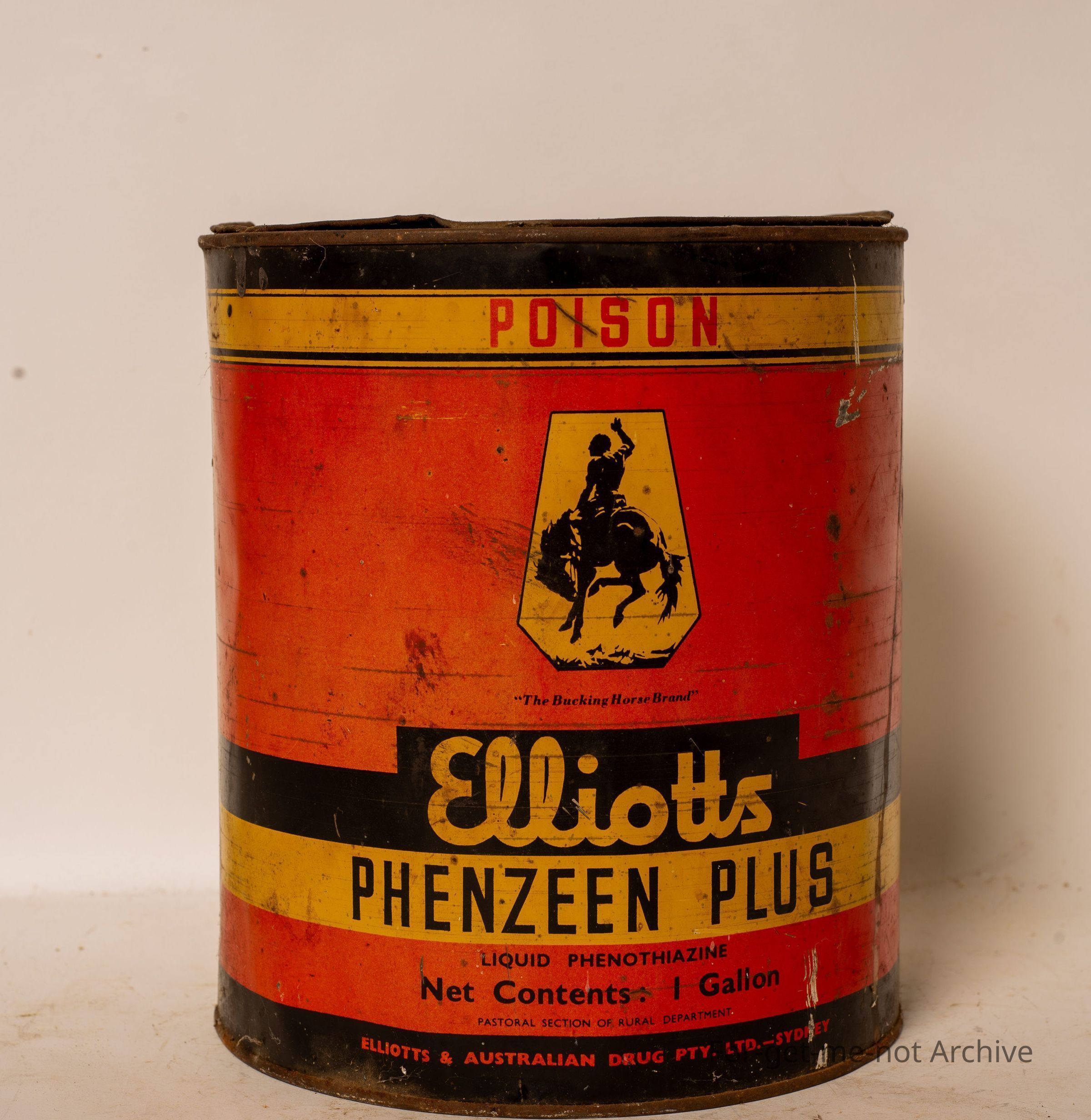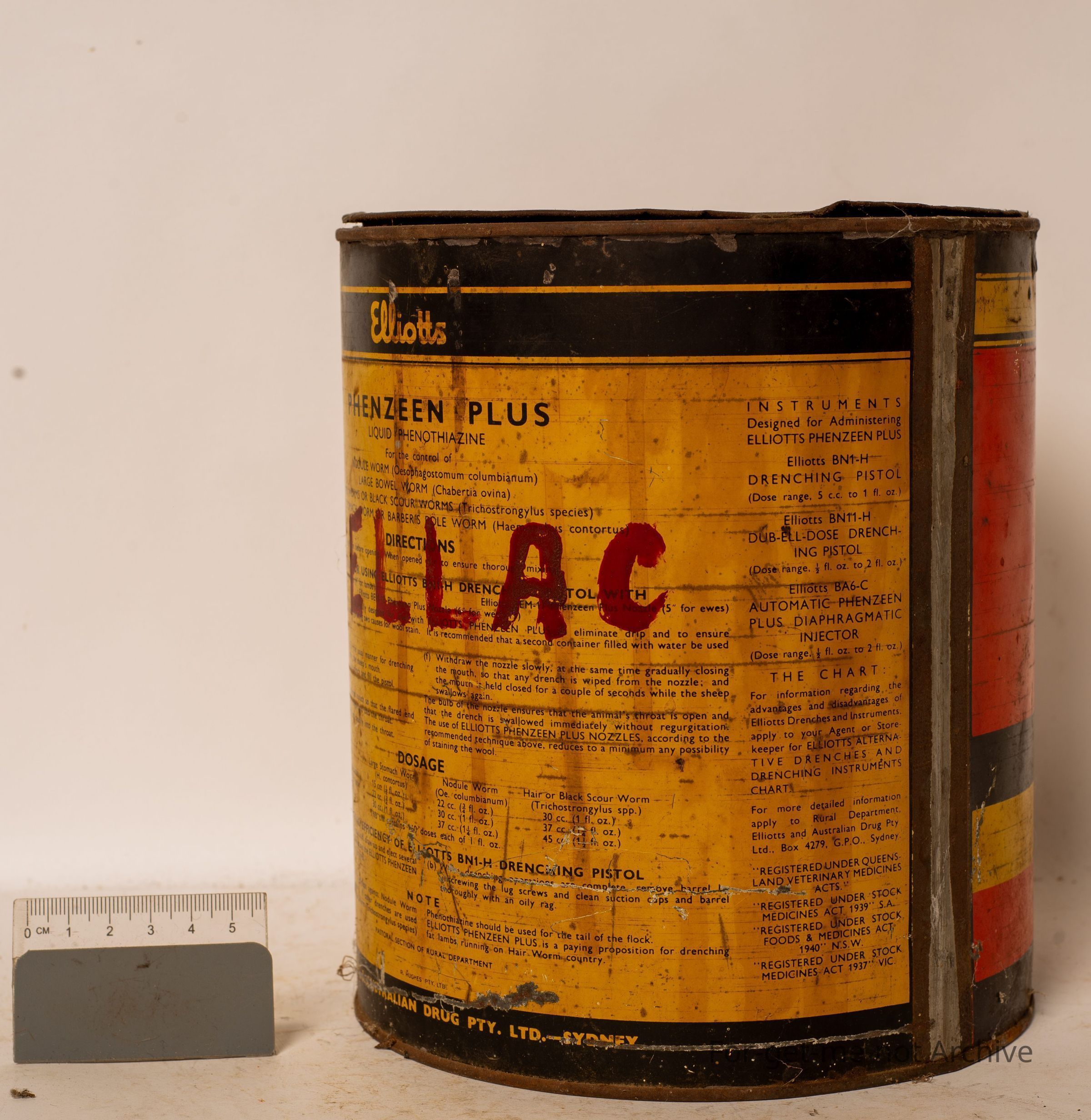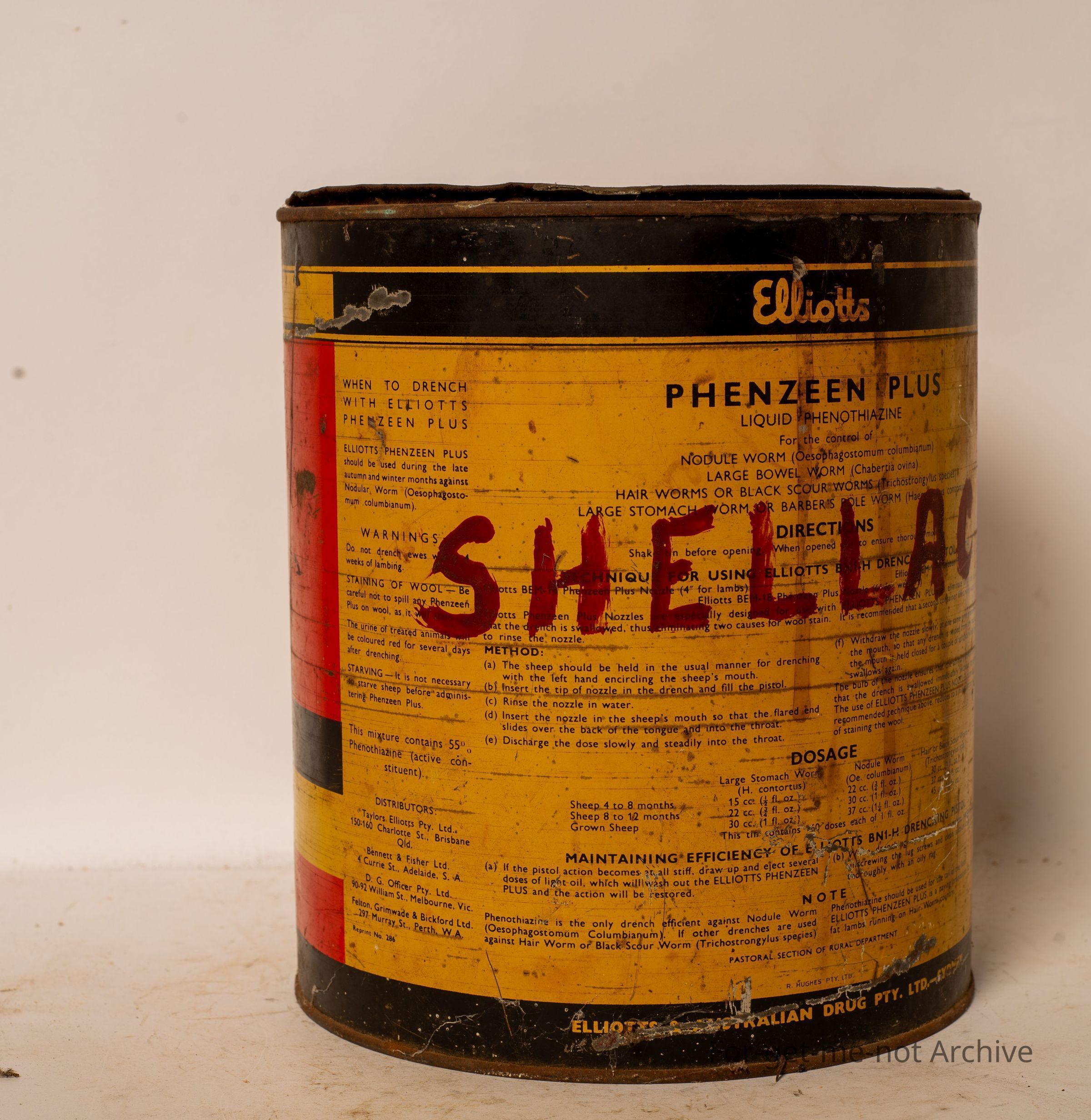Is a tin of Elliot's Phenzeen Plus Sheep Dip for Sheep. This product was renowned for leaving unbleachable stains in the wall. Pretty good condition.