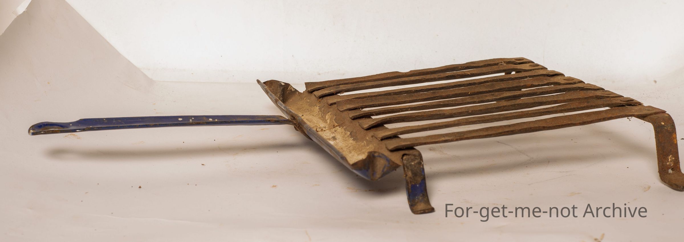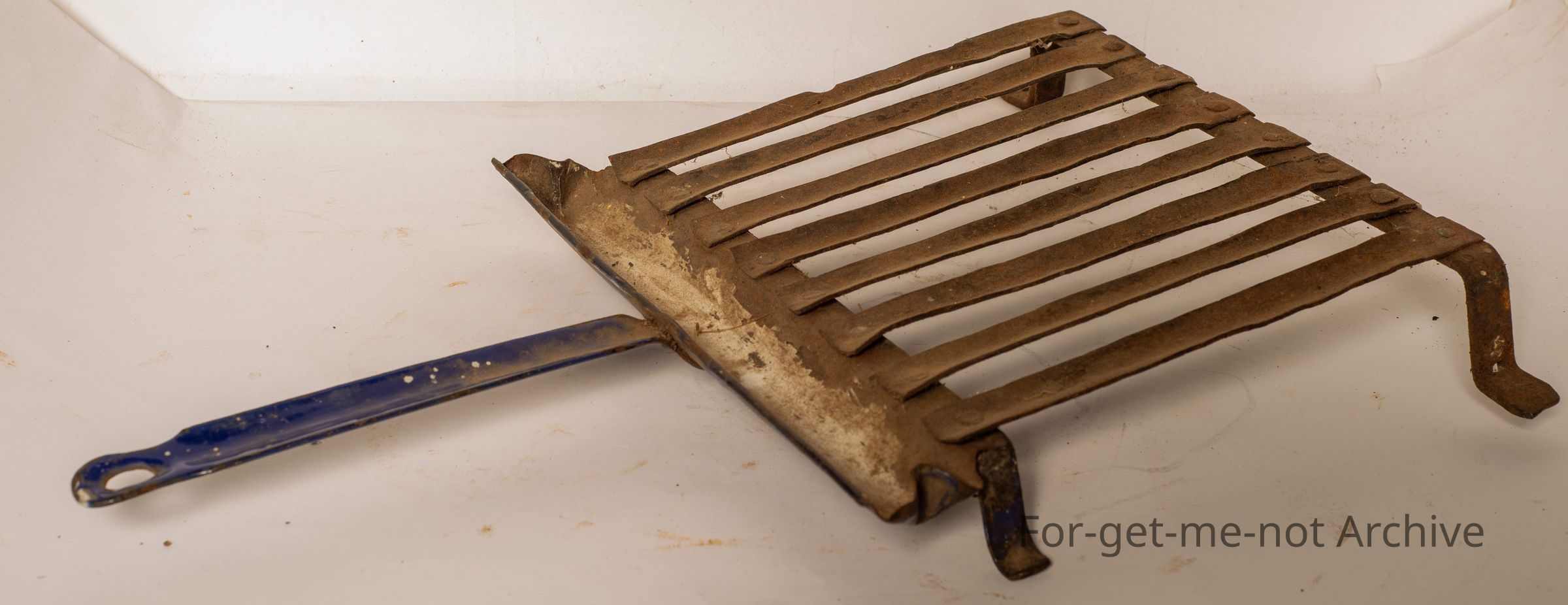 This is a grid iron with fat catcher. This is, an enamelled one, enamelled fat, trough, enamelled handle. The four legs are still there, in pretty good condition. These are going back in all the time.Collection