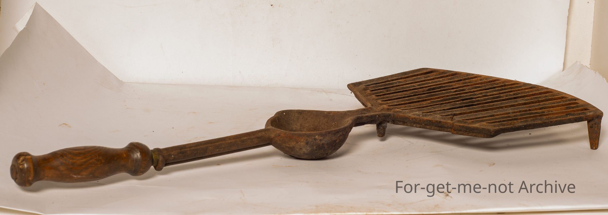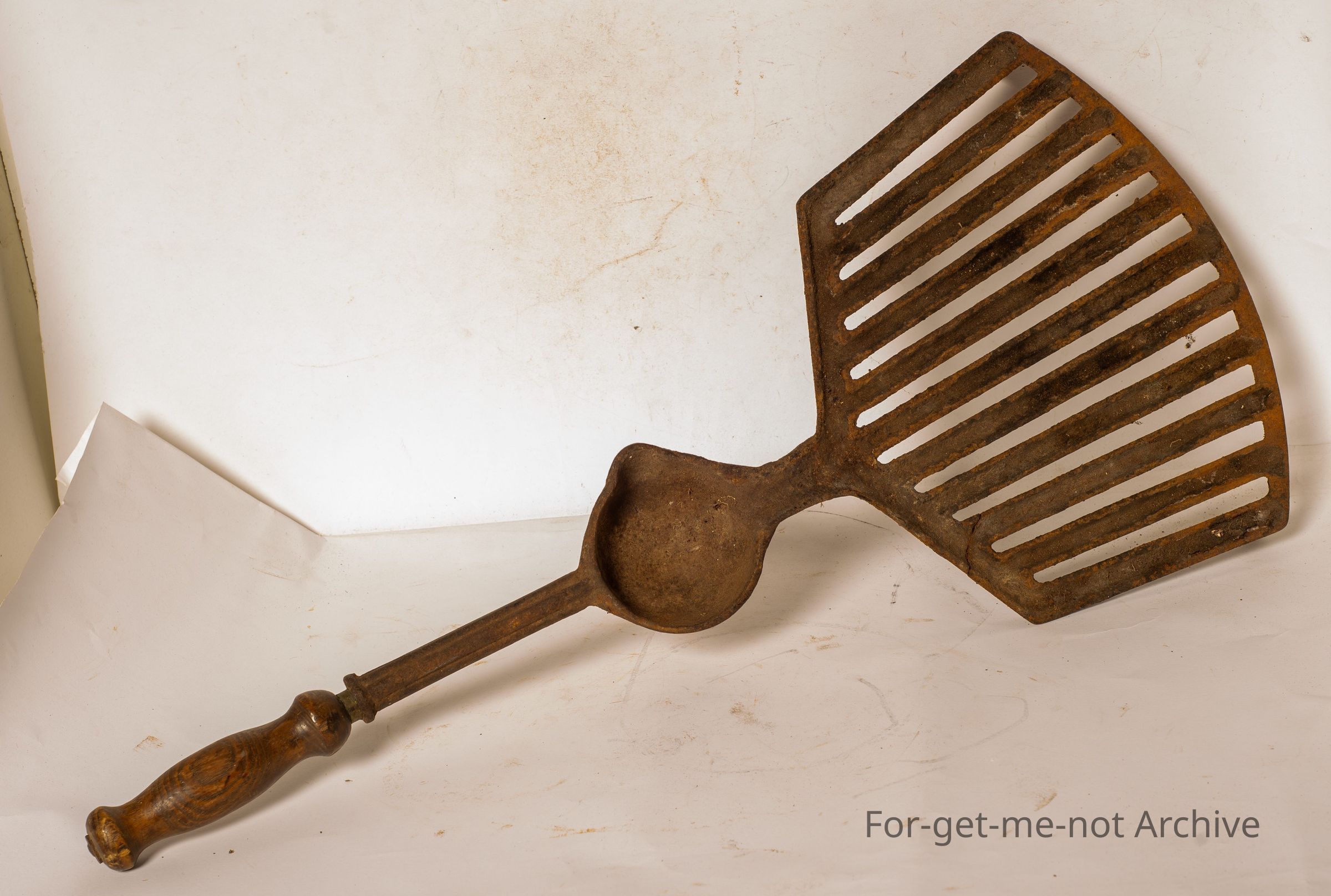 This is a cast iron, griddle iron with fat catcher fluted to the bowl for catching the fat. this is a very early one. Wooden handle. Quite ornate. Many of these are broken but this one is still in 1 piece. No manufacturer's name, but a nice item for cast iron Kitchenalia.Collection