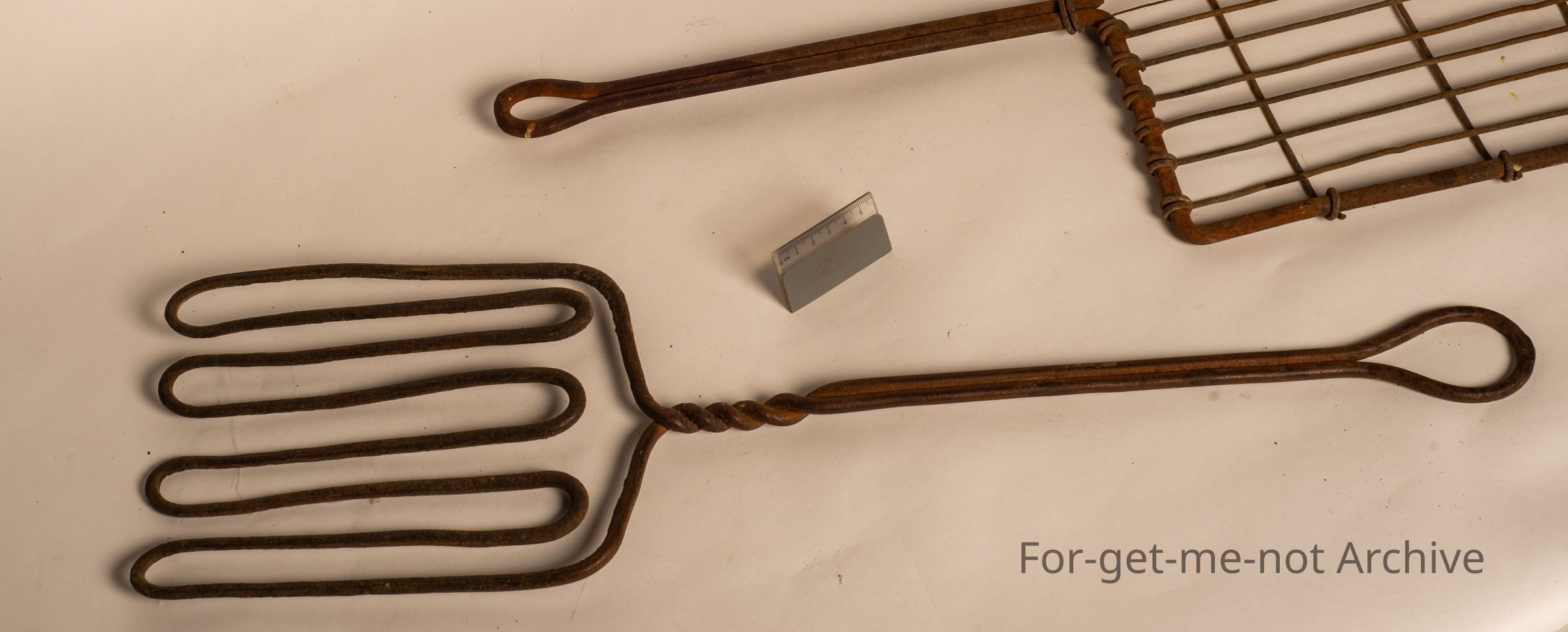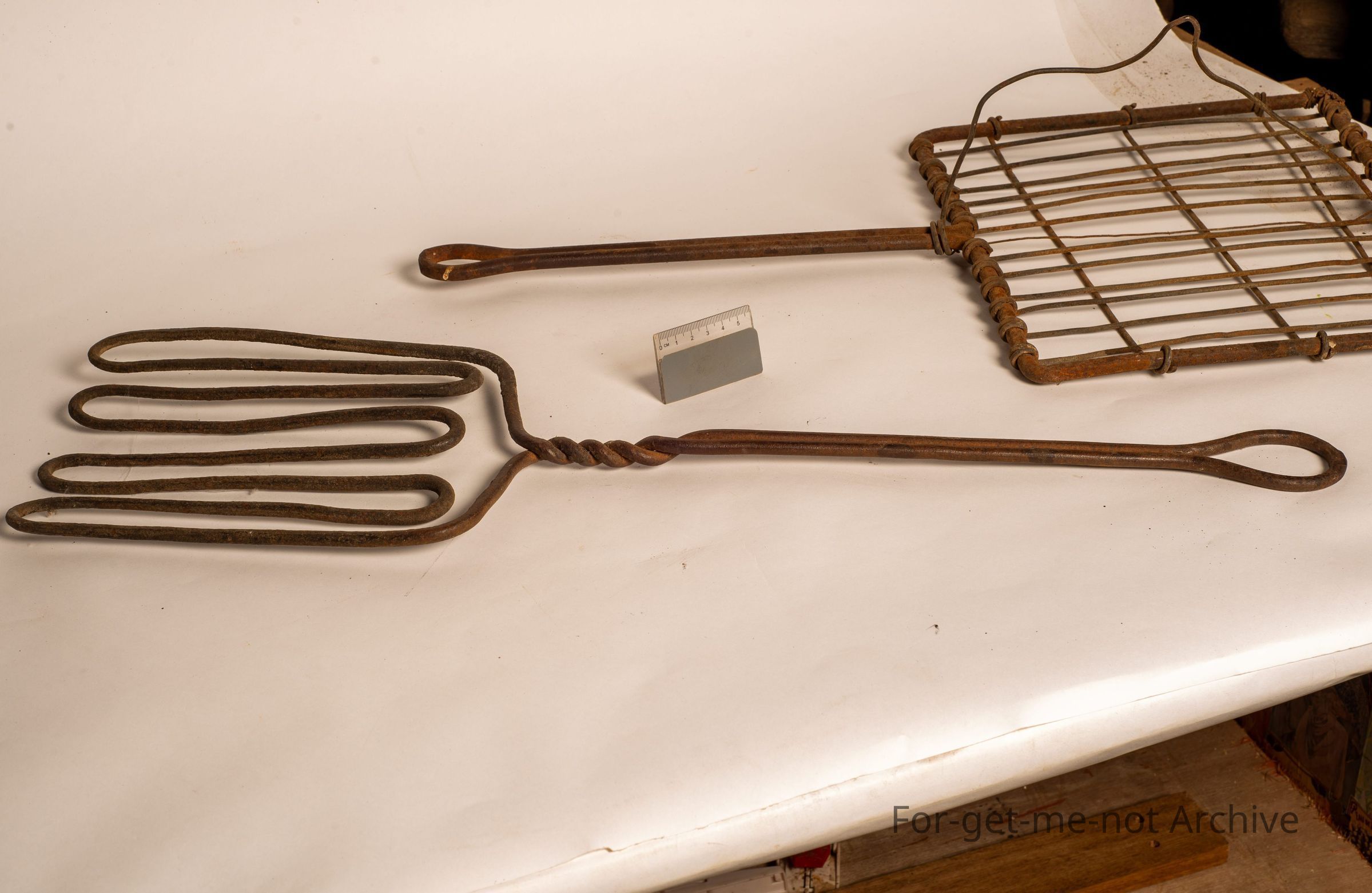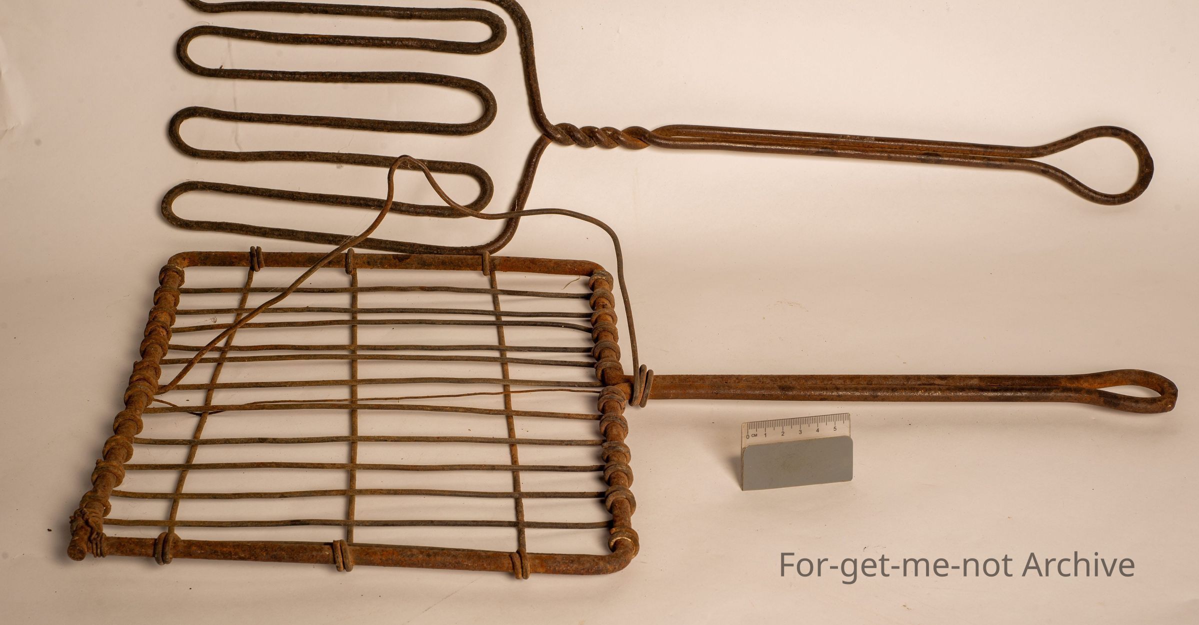 These are a couple of beautiful bushcraft, griddle irons from a very early period. One is made out of a single strand of bent wire heavy gauge. You can't even see the join in it. The other one is all homemade as well. Both classic pieces. The rectangular one has a hanger so that you could hang it above a campfire. Beautiful early bushcraft pieces,Collection