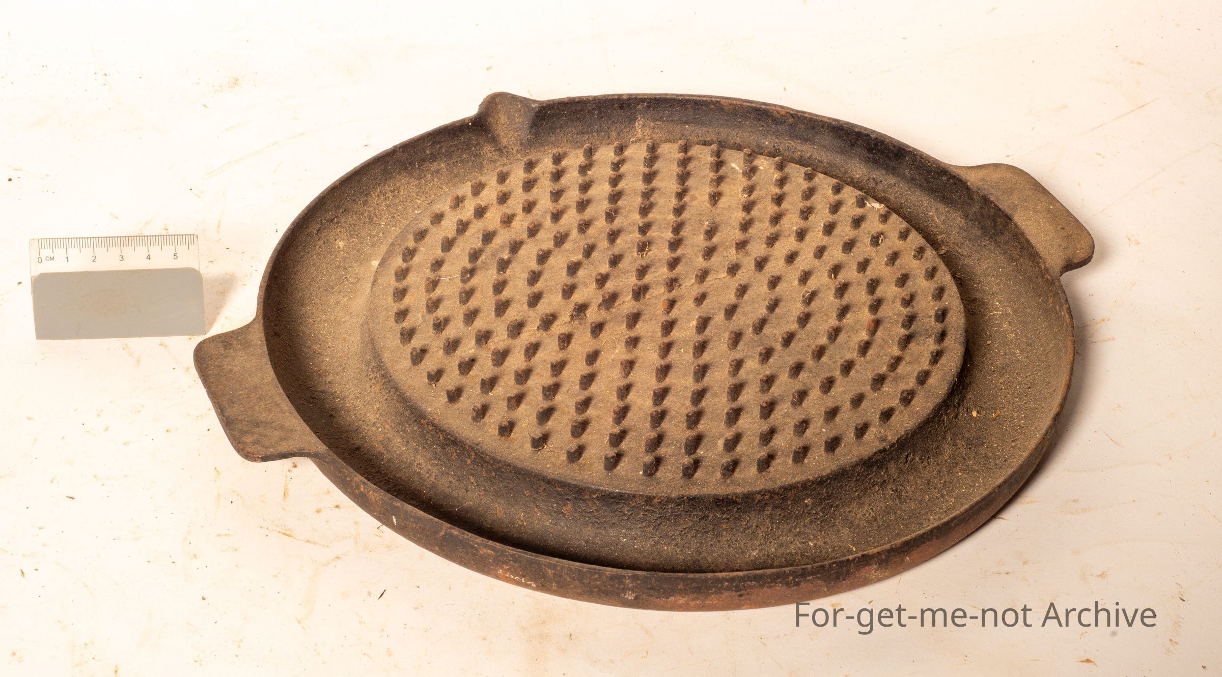 This is, embossed in the back. Davis Universal Cooker has little raised, pivots to keep the meat or whatever with a fat catching circle around the outside with a pourer.