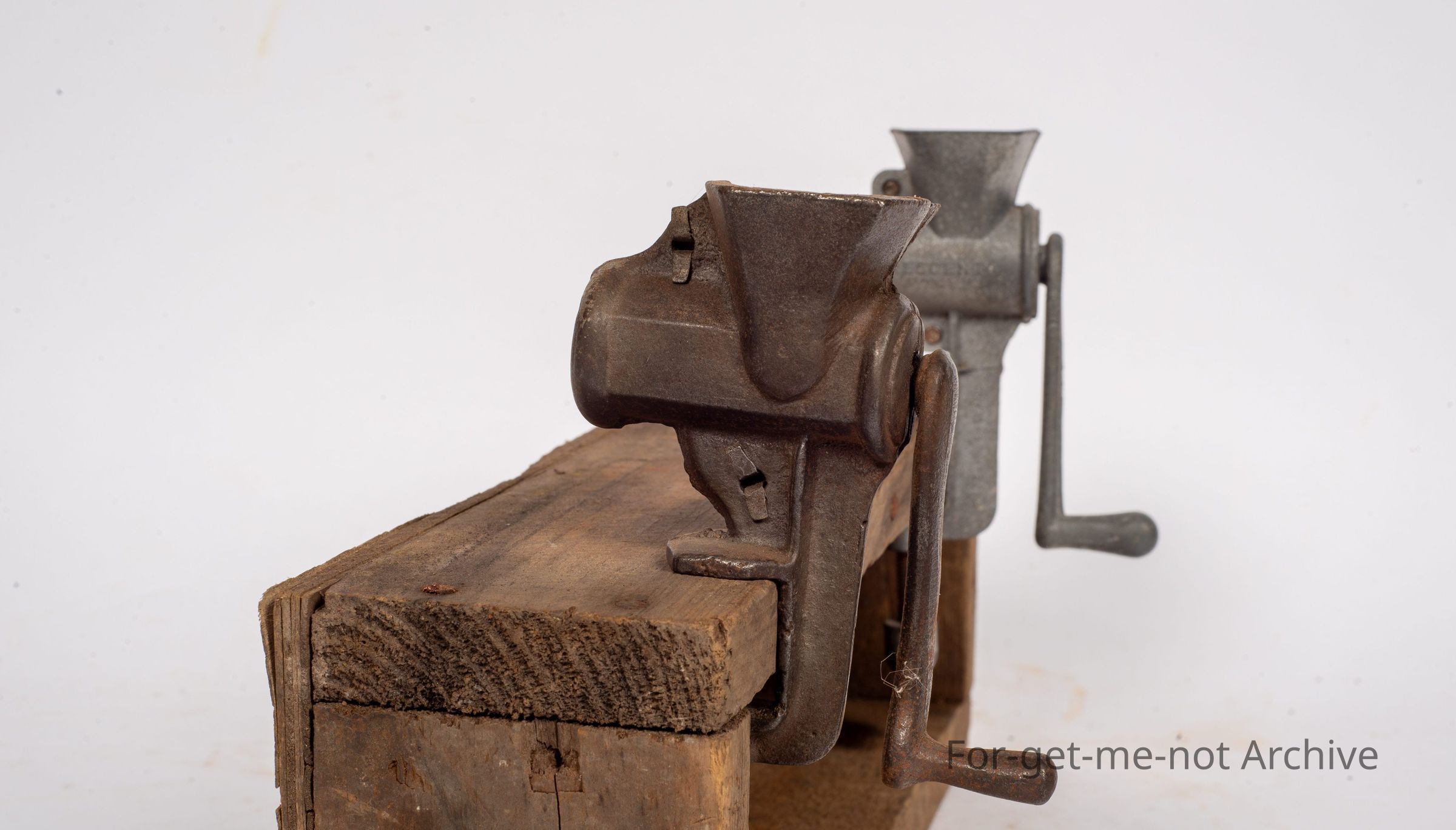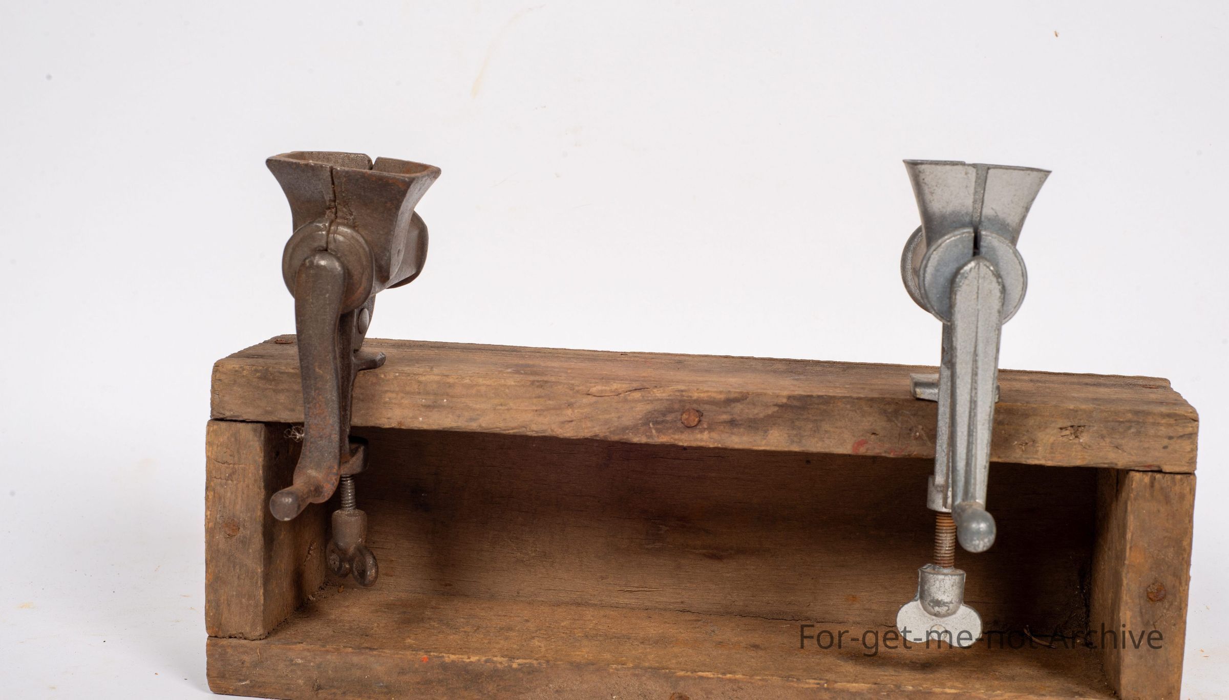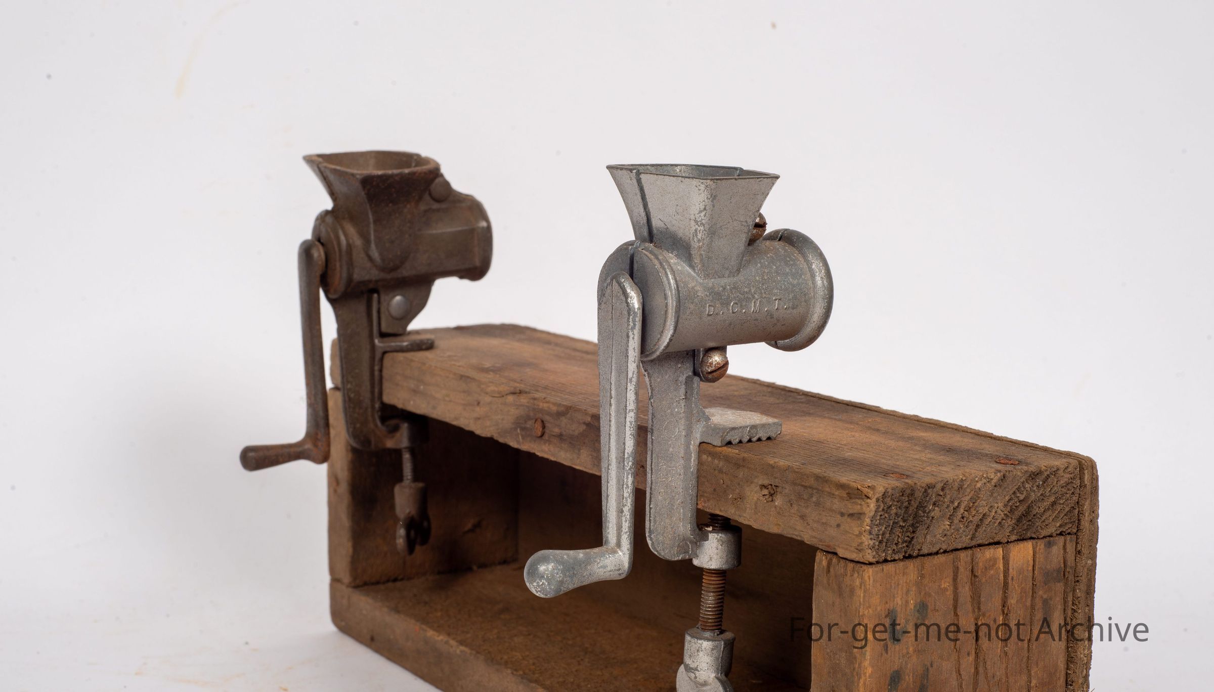 A pair of meat, meat grinders, 2 different metals. 1 steel, the other one is an alloy. Both look quite similar. Attached to a piece of wood for display purposes. a pair.
