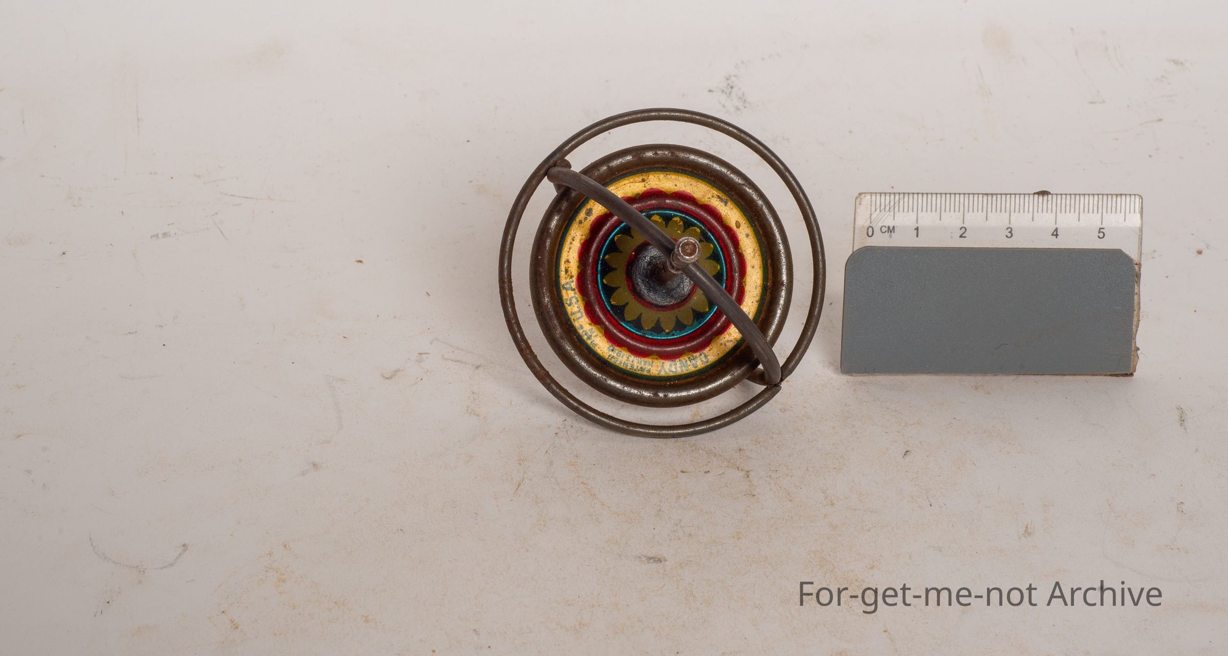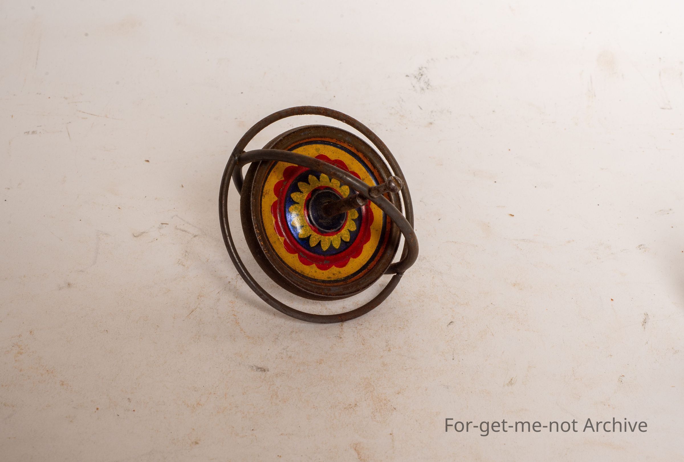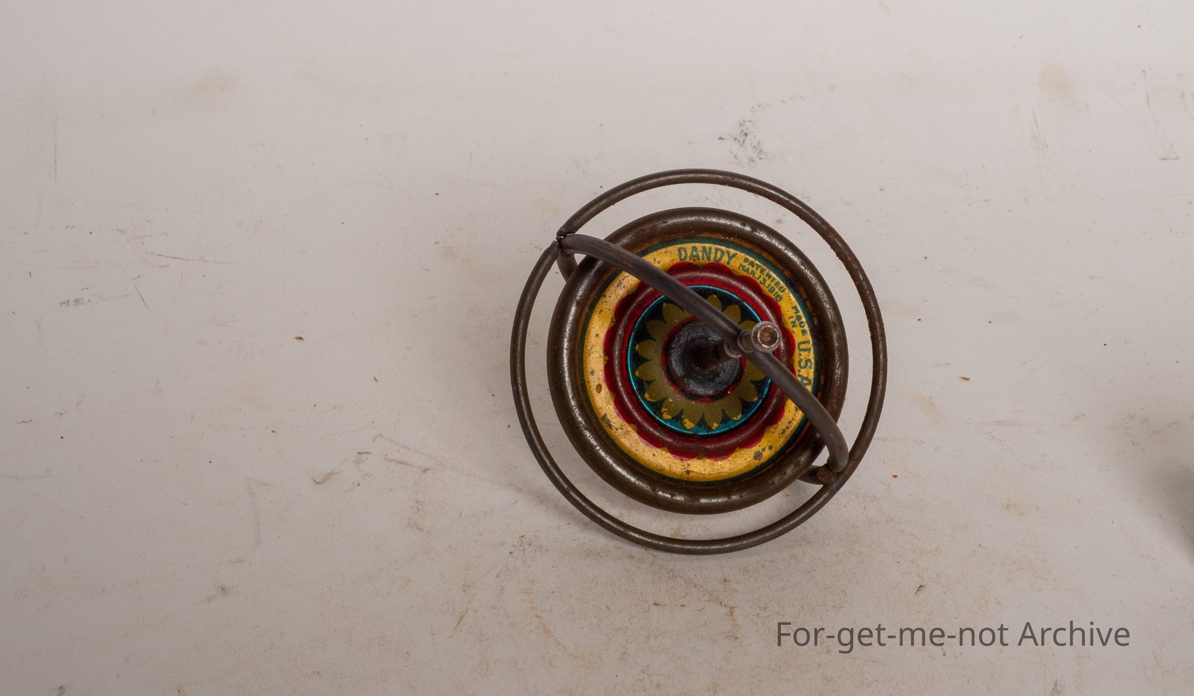 This is a beautiful little kid's toy called a gyroscope, made in the USA, patented March 13, 1918, in lovely condition. A little hole in the shaft for putting string and then you pull it and it sits there spinning like a top. Glorious pieceCollection