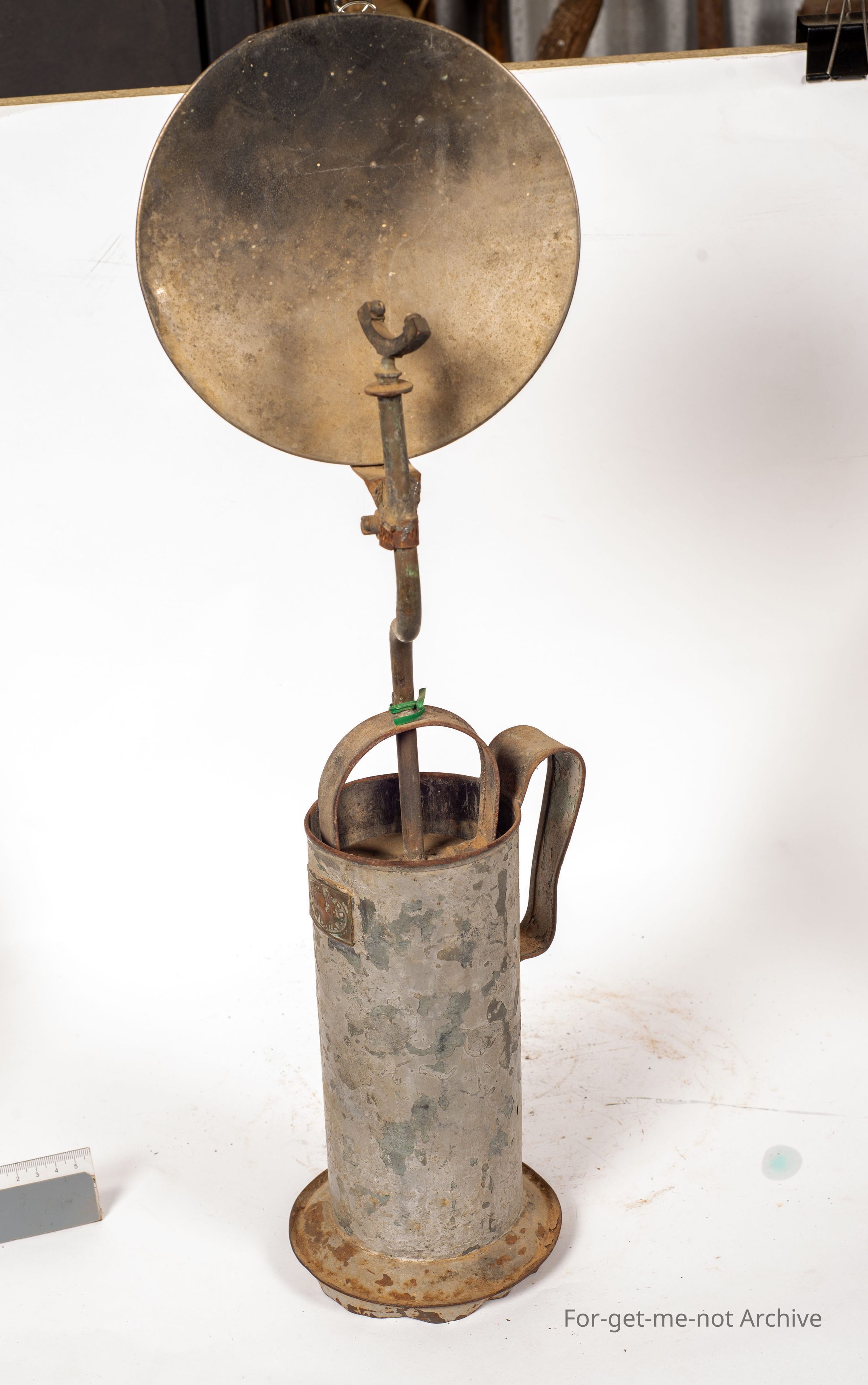 This is a carbide light, with a reflector, a handle, the tube is there. Beautiful little maker's plaque, which states, manufactured by H. Hibberd, Maker, Roma in Queensland. This lamp was purchased at Walker. A lovely piece to find, rare to find the makers an Australian maker's plaque on a carbide light.Collection