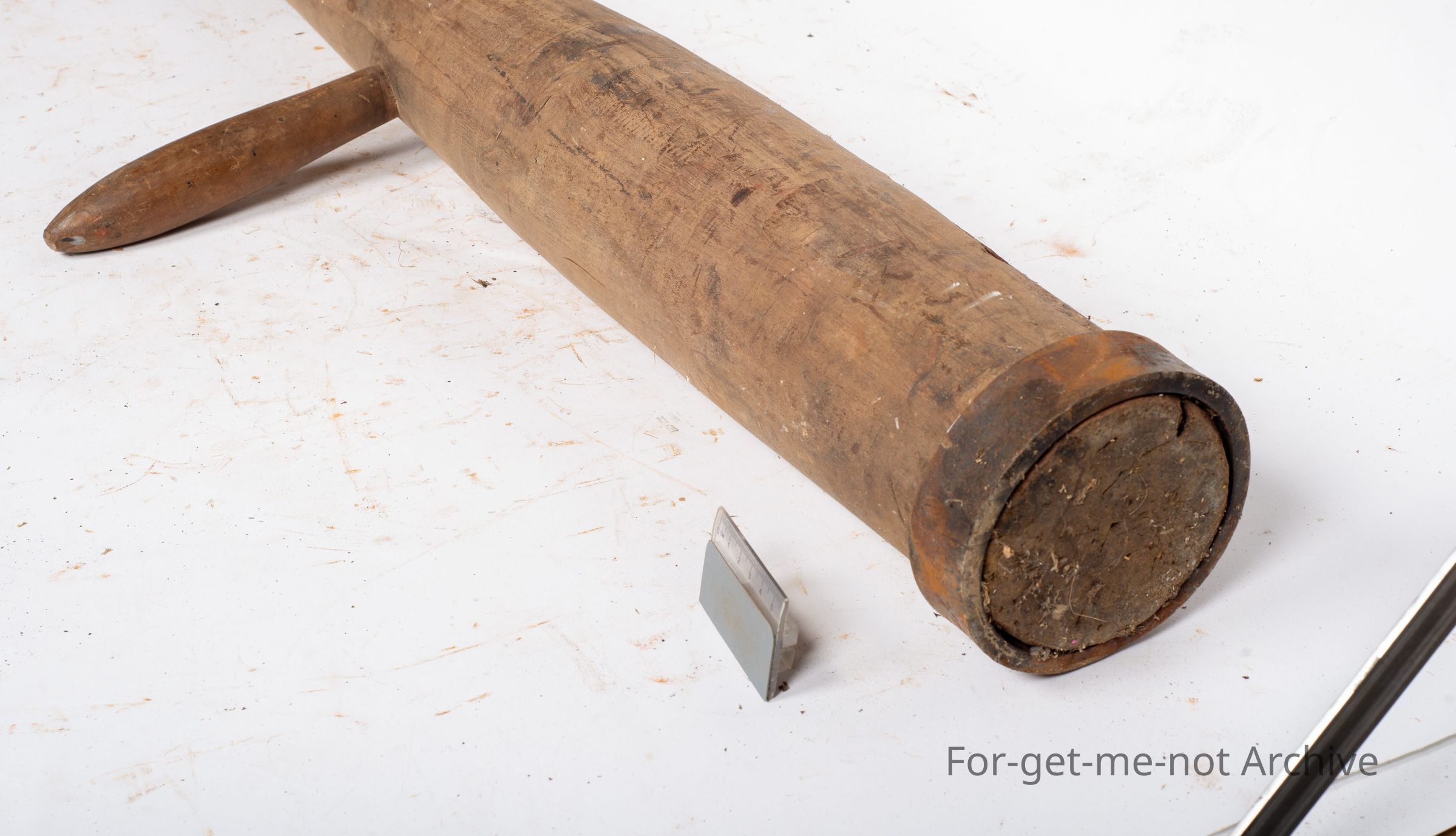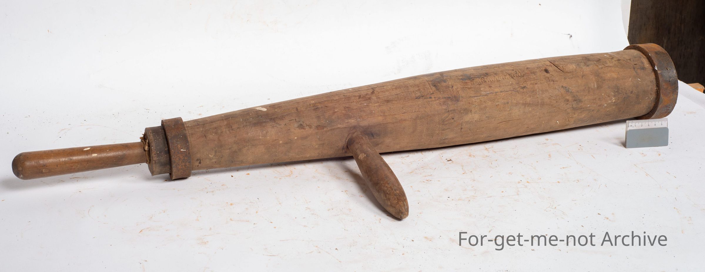 This is a piece that was believed to have been used in a winery for squashing grapes in the very early days. Handle on the top, another one protruding from the side. It has a, an iron ring to keep it in shape at the bottom. Quite a heavy piece of timber.Collection