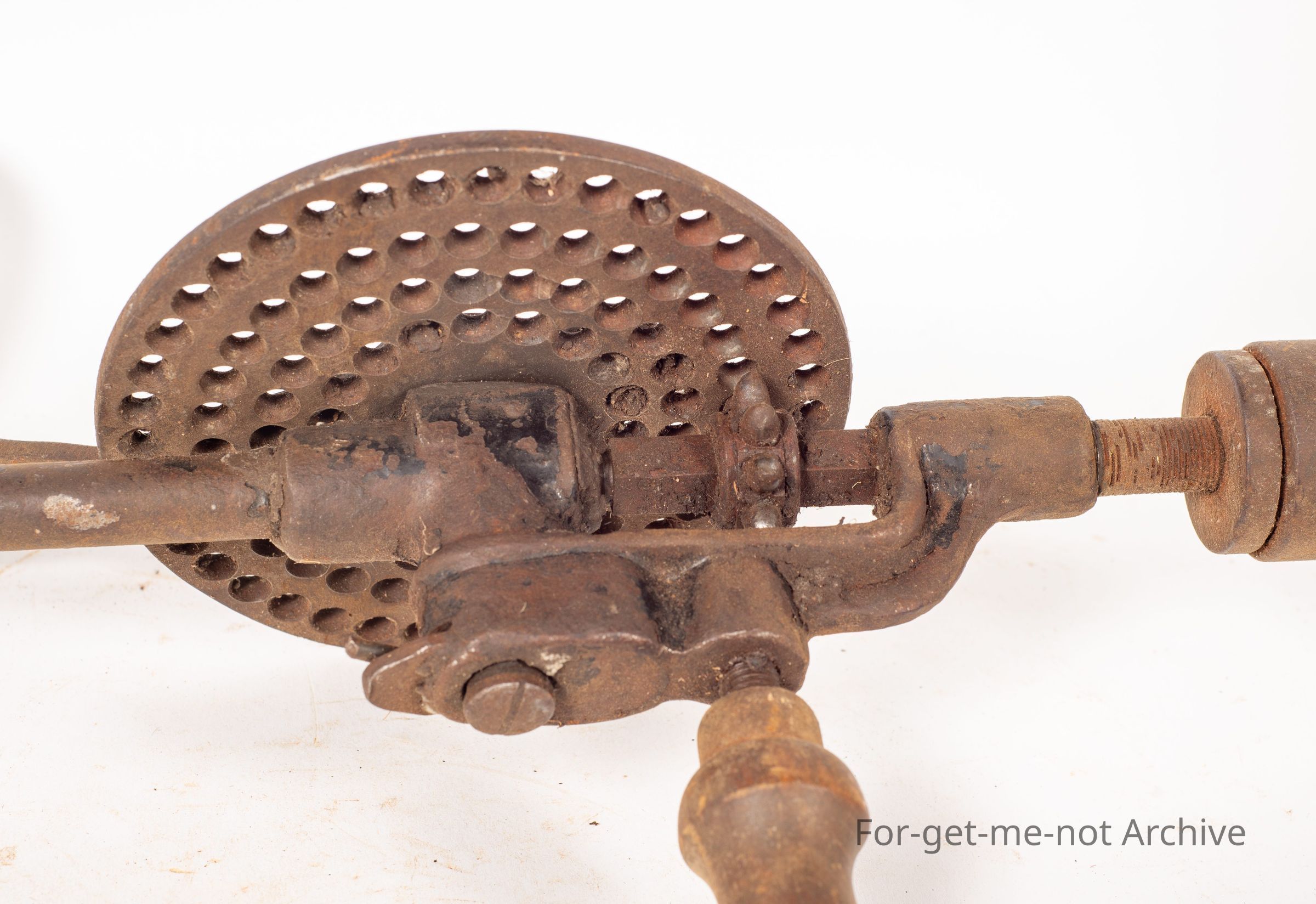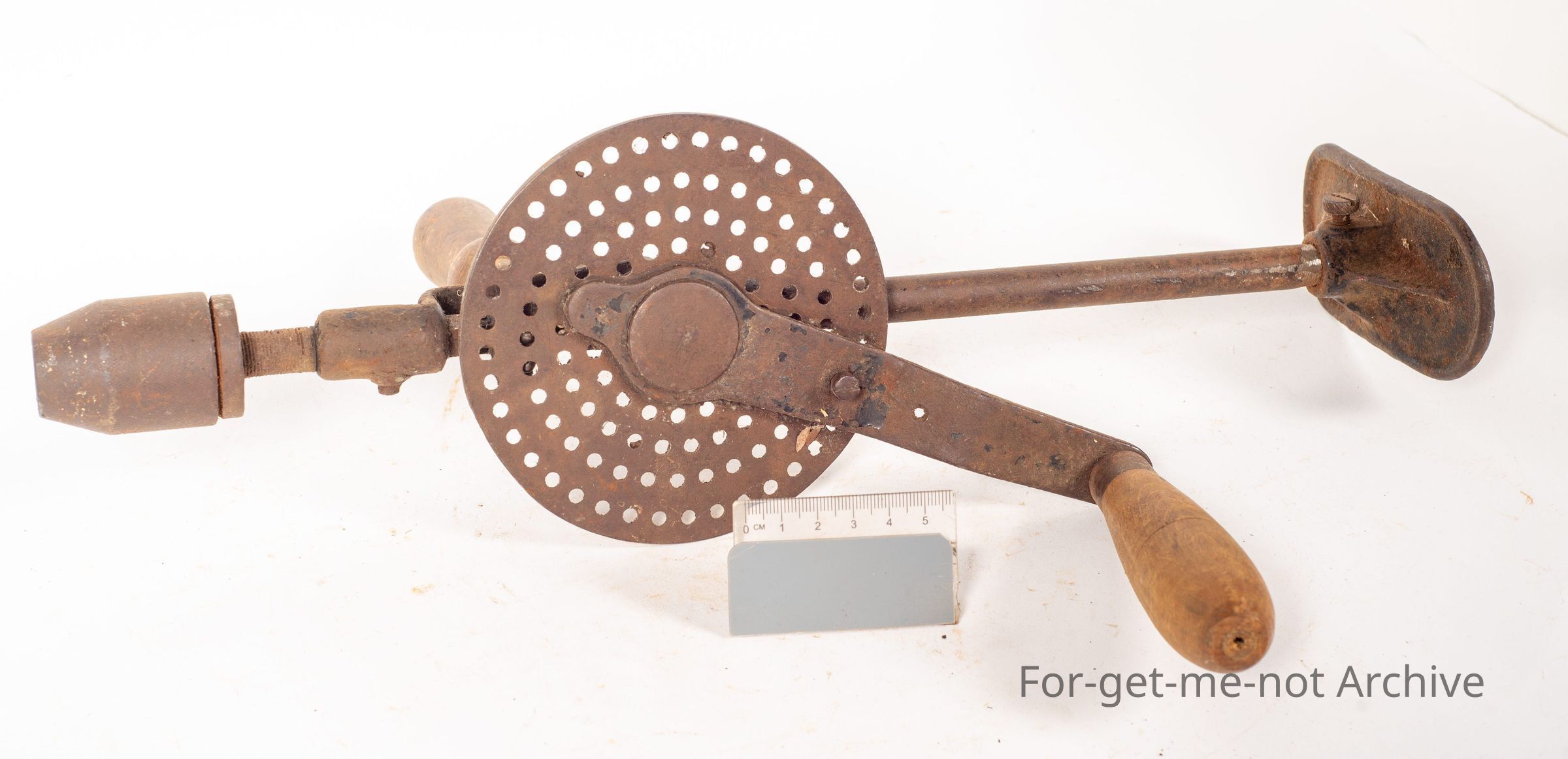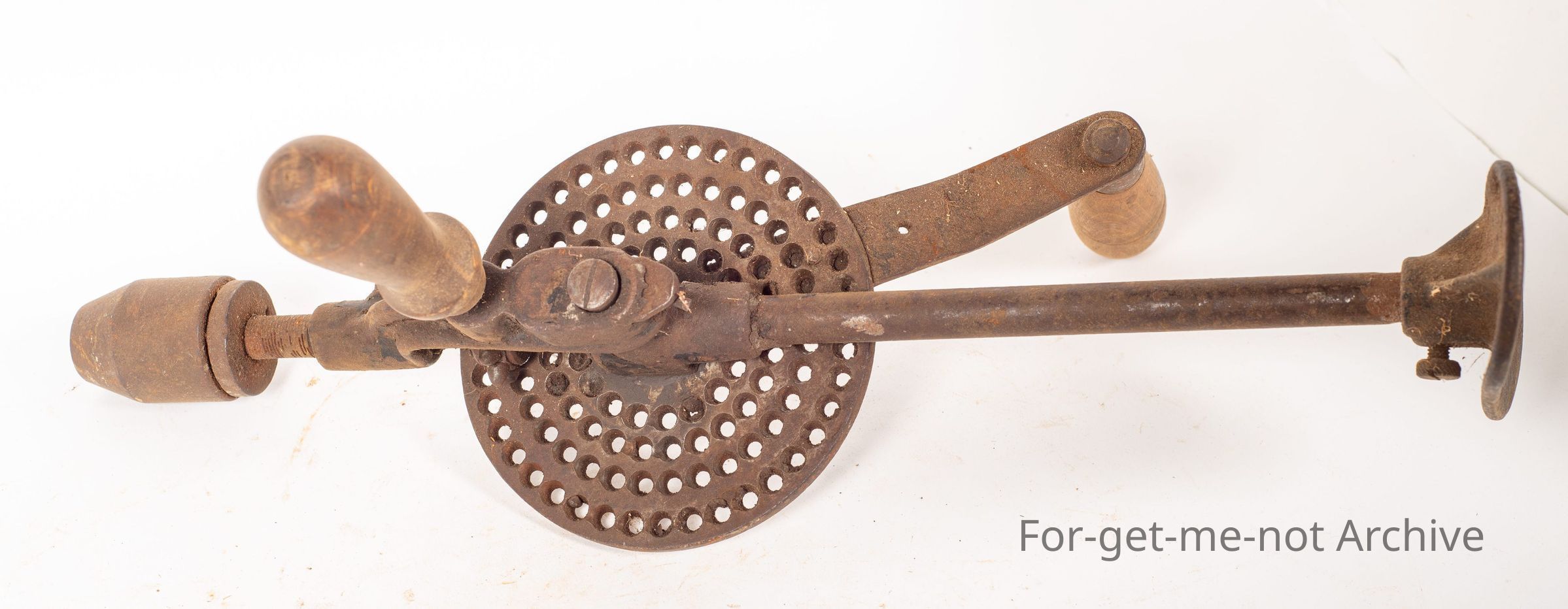 This is a hand drill with a bit of difference. It has a calibration wheel worked into the handle, so that the speed of the rotating chuck can be varied. Side handle to add extra pressure. Not a common one to see at all.Collection