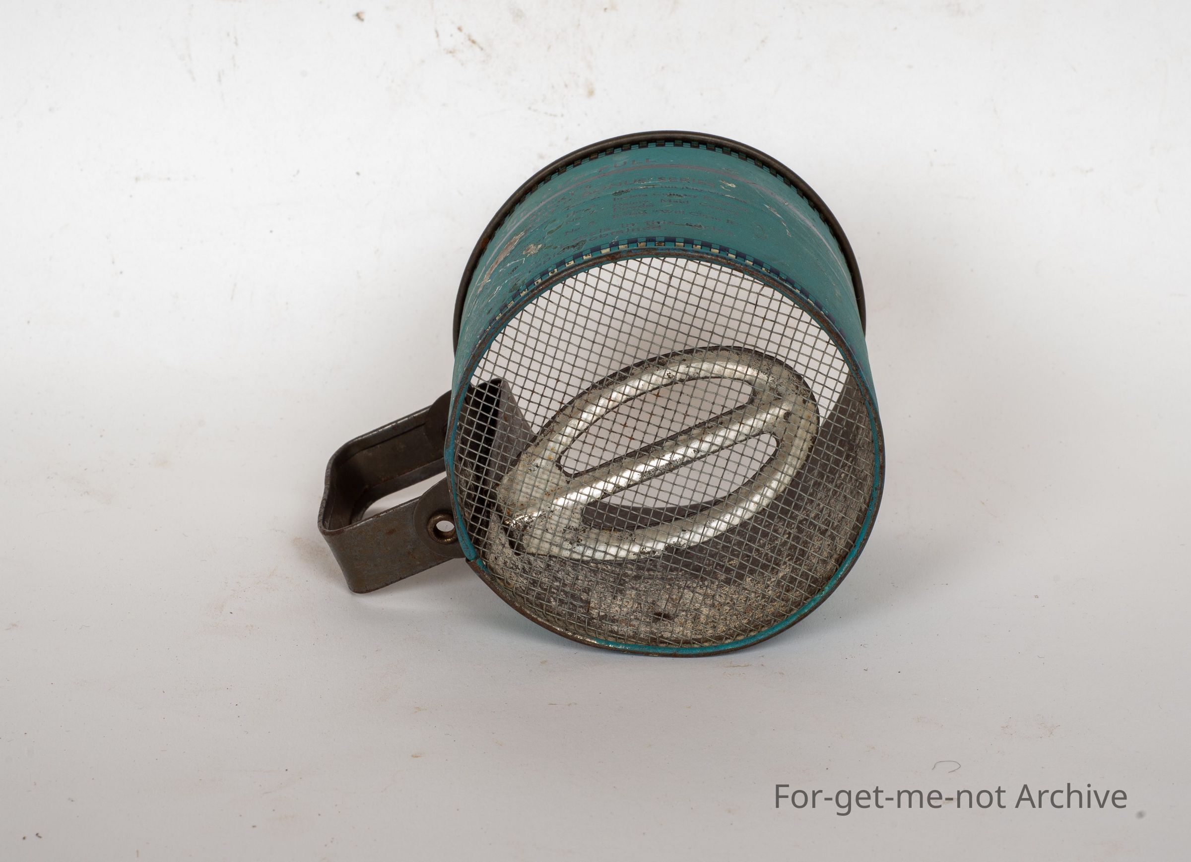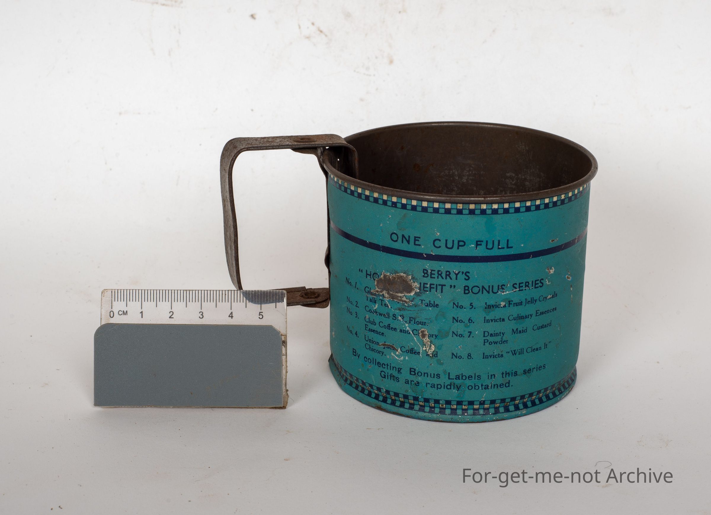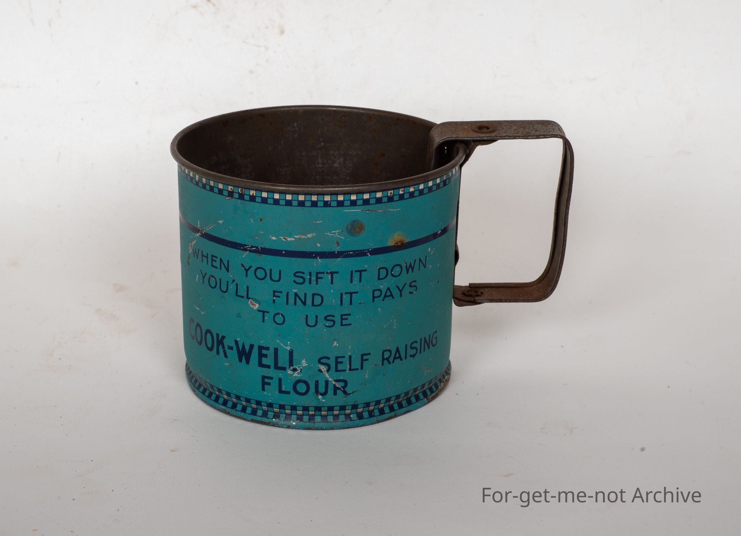 This is a small handheld shifter. The handle wobbles to sift the flour through the vase. The text says when you sift it down, you'll find it pays to use Berry's Crookwell self raising flour, in pretty good order.Collection