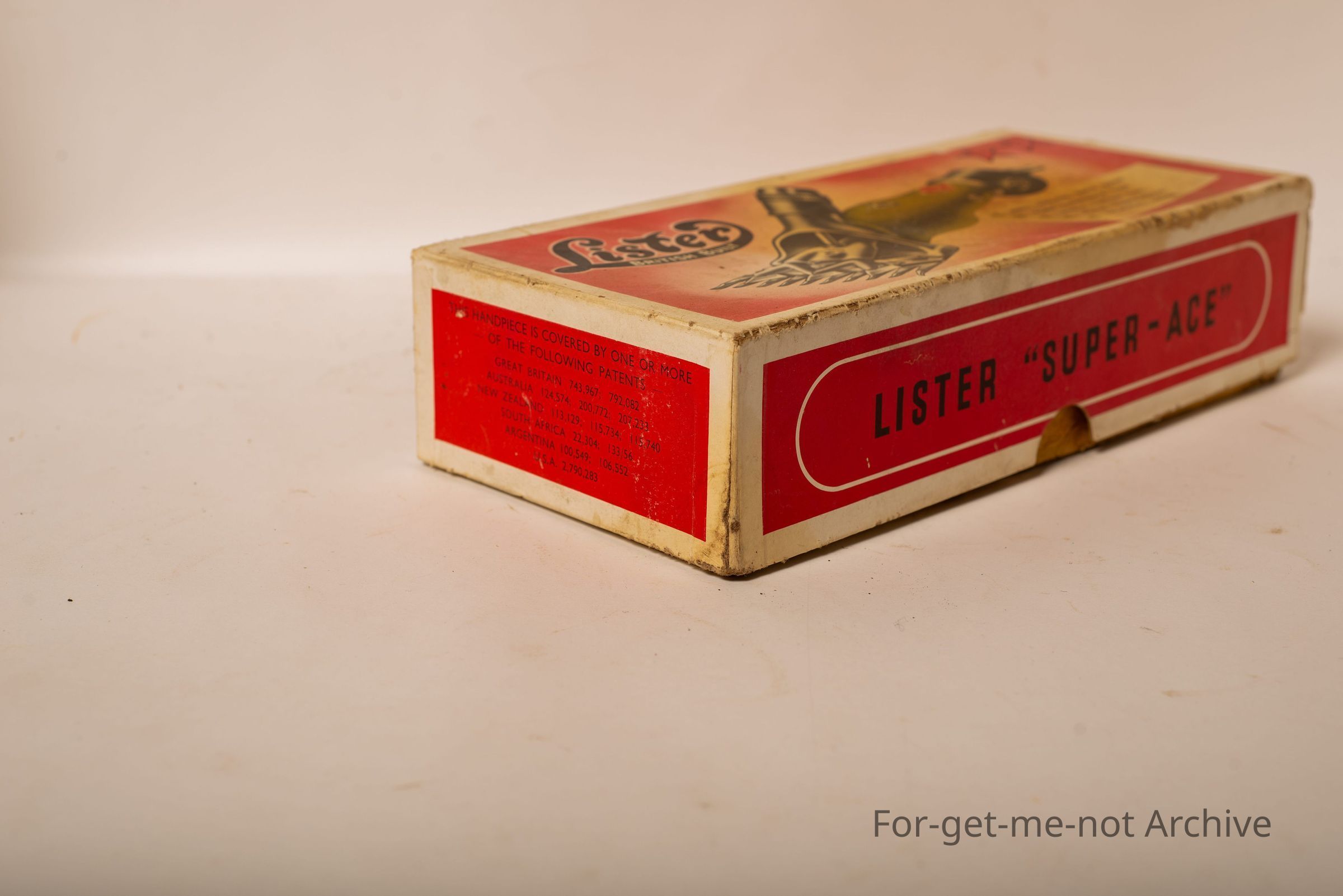Is cardboard box from Lister for the, Lister Super Ace handpiece. This box is in remarkably good condition considering the age of it.