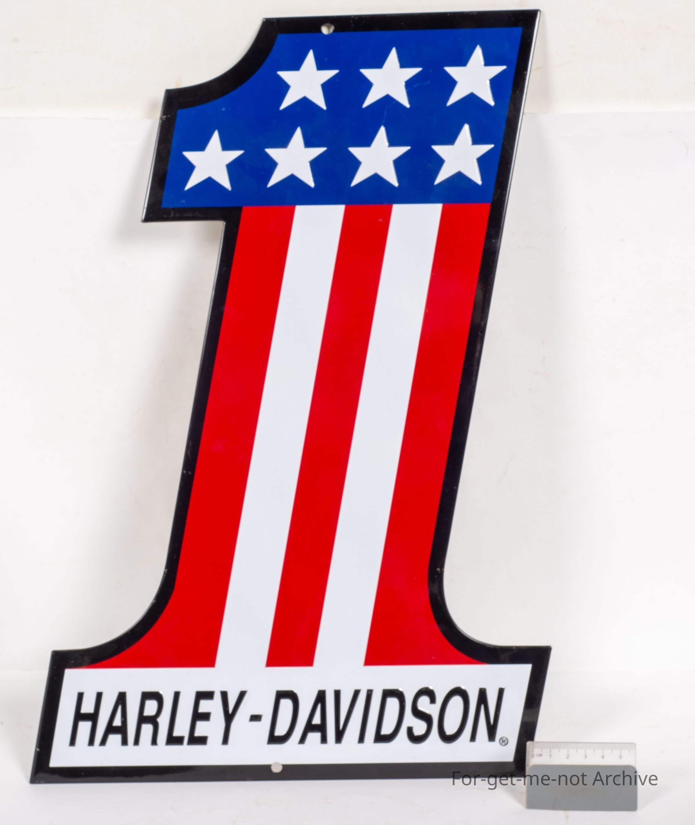 Sangeet Collection. this is a pressed aluminium sign, in the shape of a number one figure. This piece is advertising Harley Davidson motorbikes with the American blue, white and red, to represent their country's colours.Collection