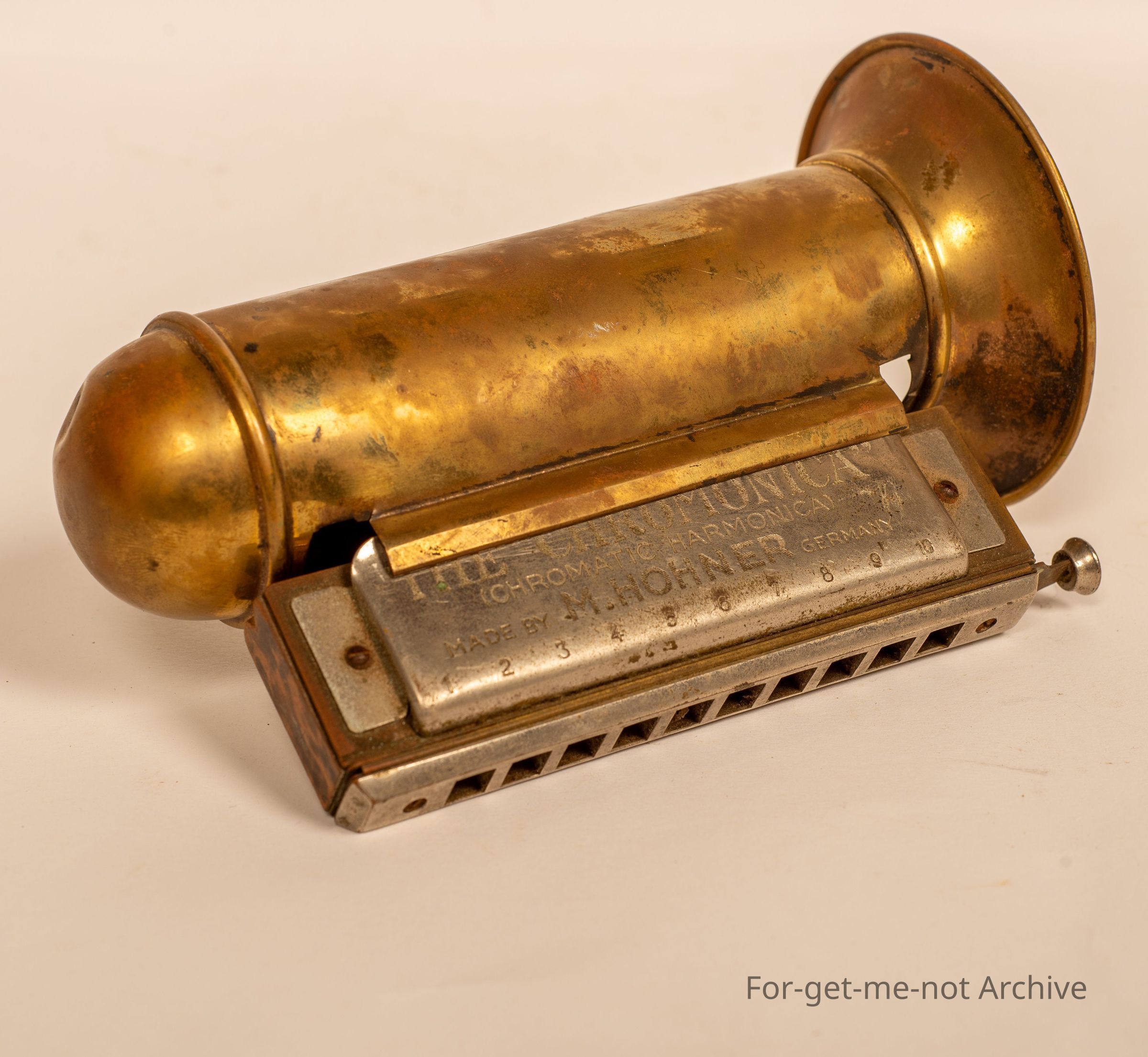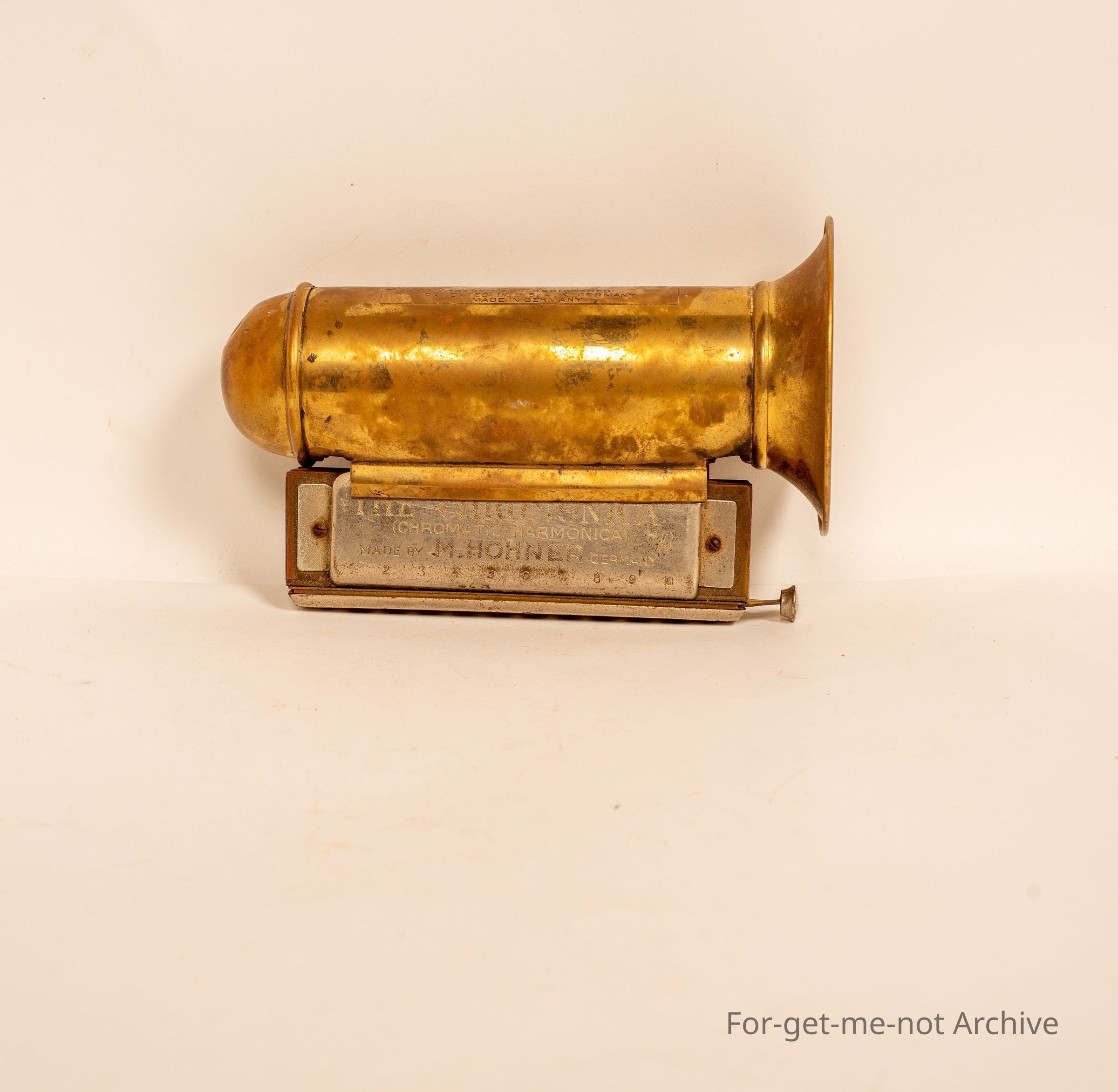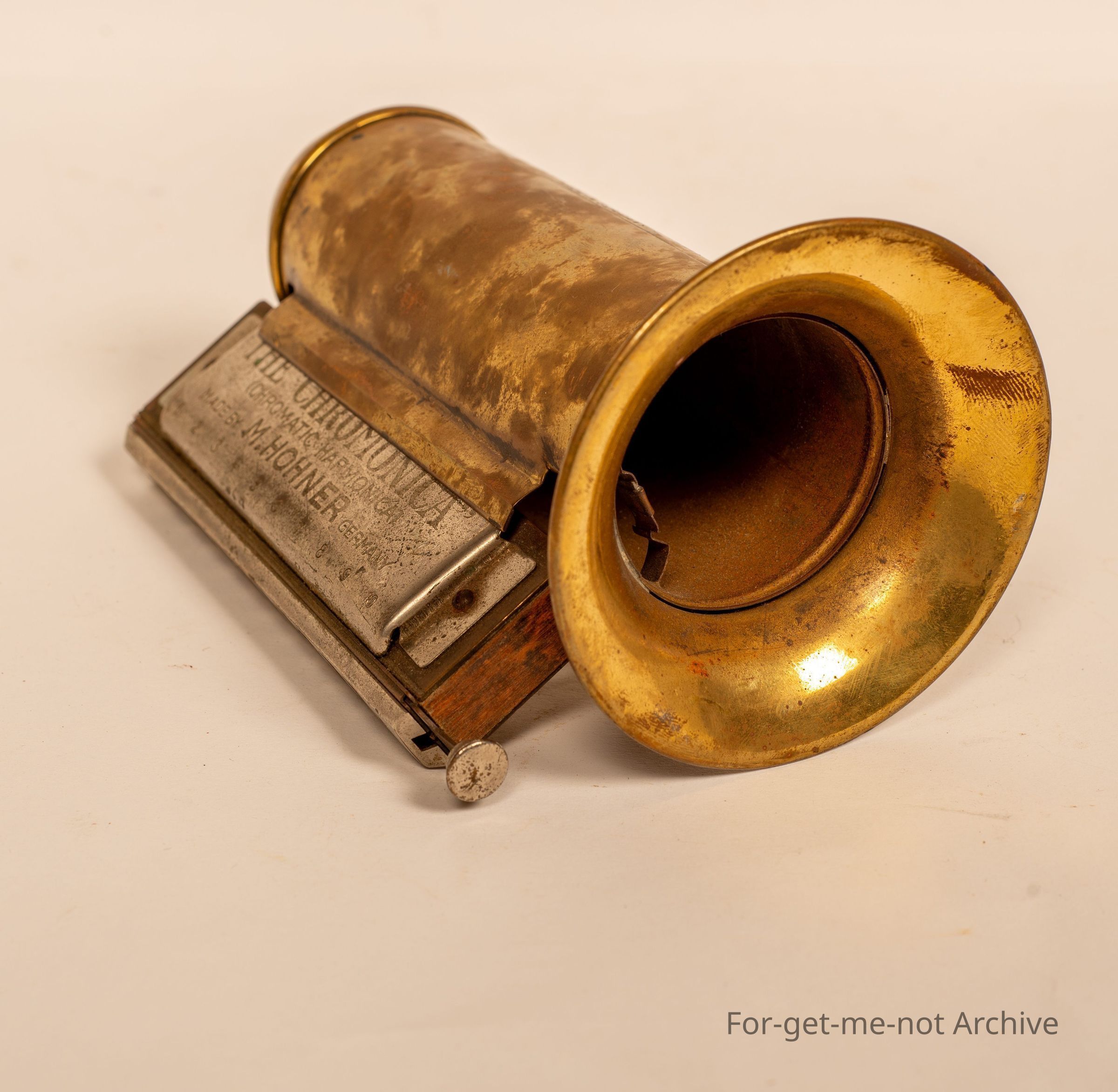 Harmonica with an amplifier on it made by chrome chromon chromonica, a Hohner Germany model. Hohner phone is the name of the amplifier.