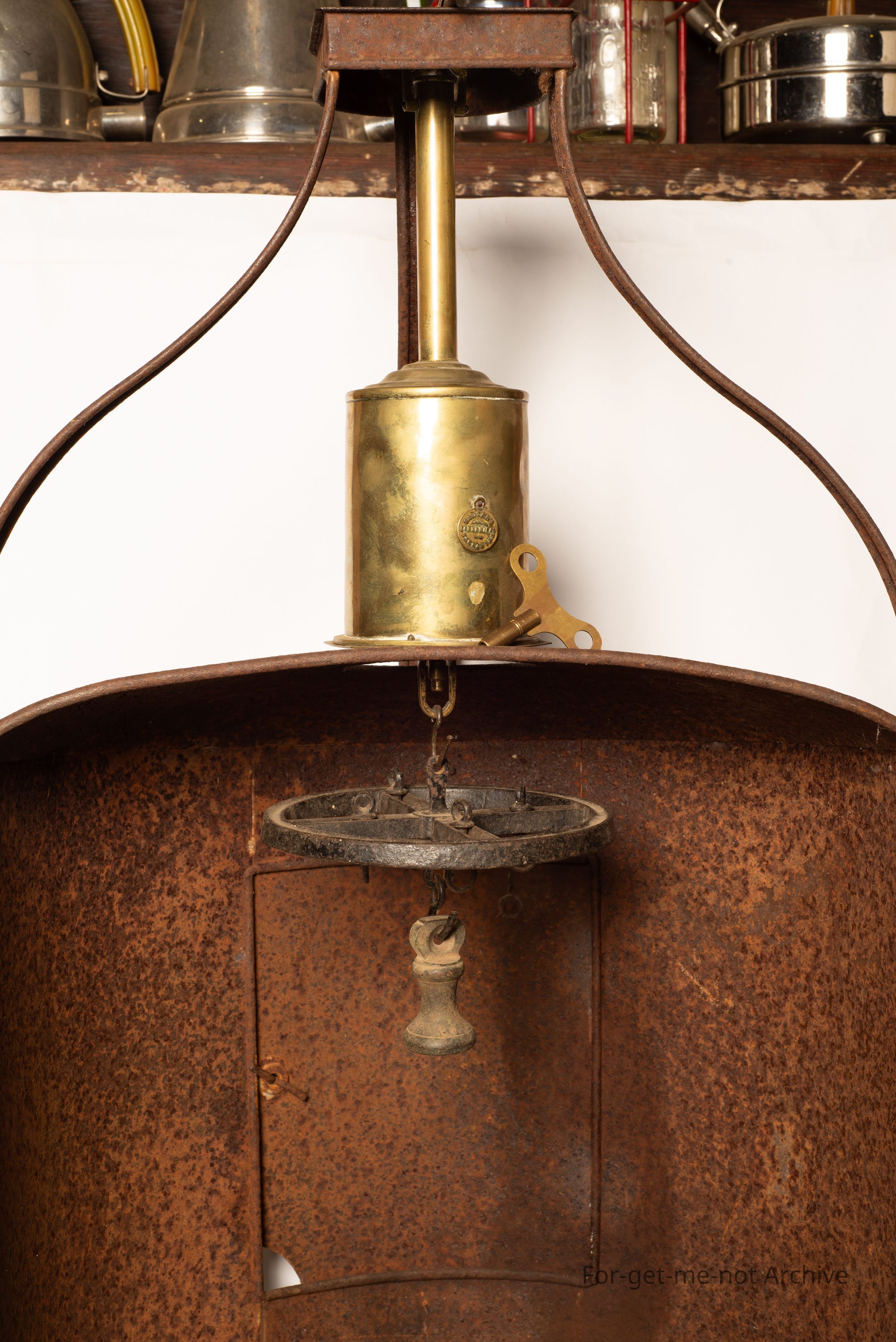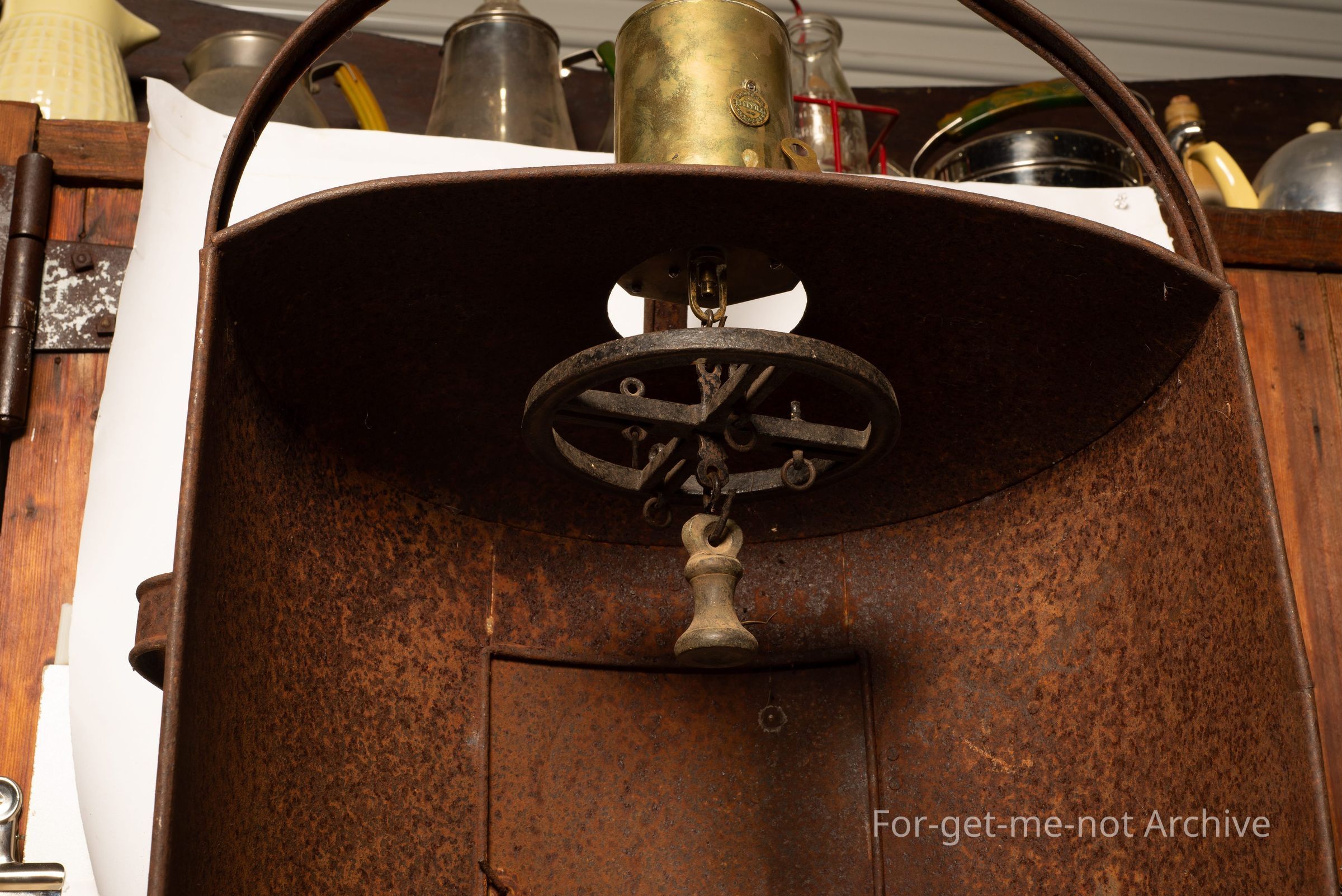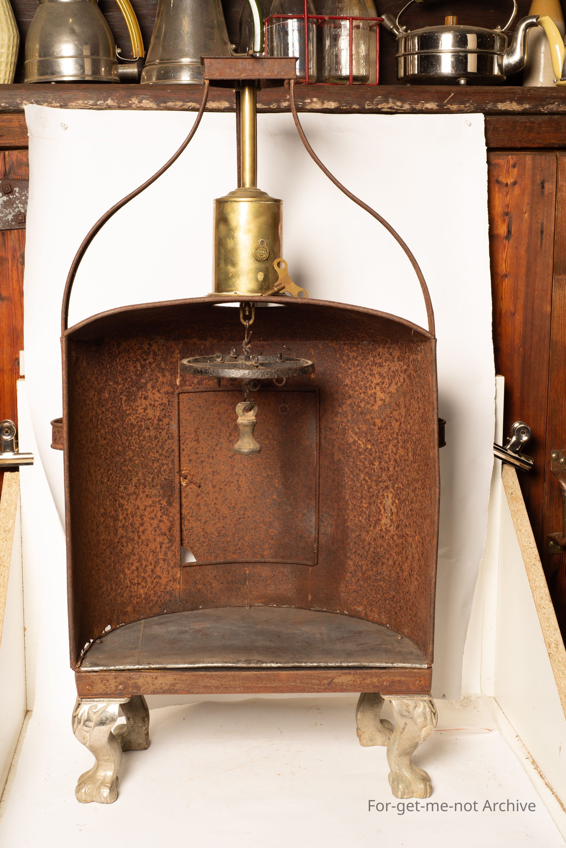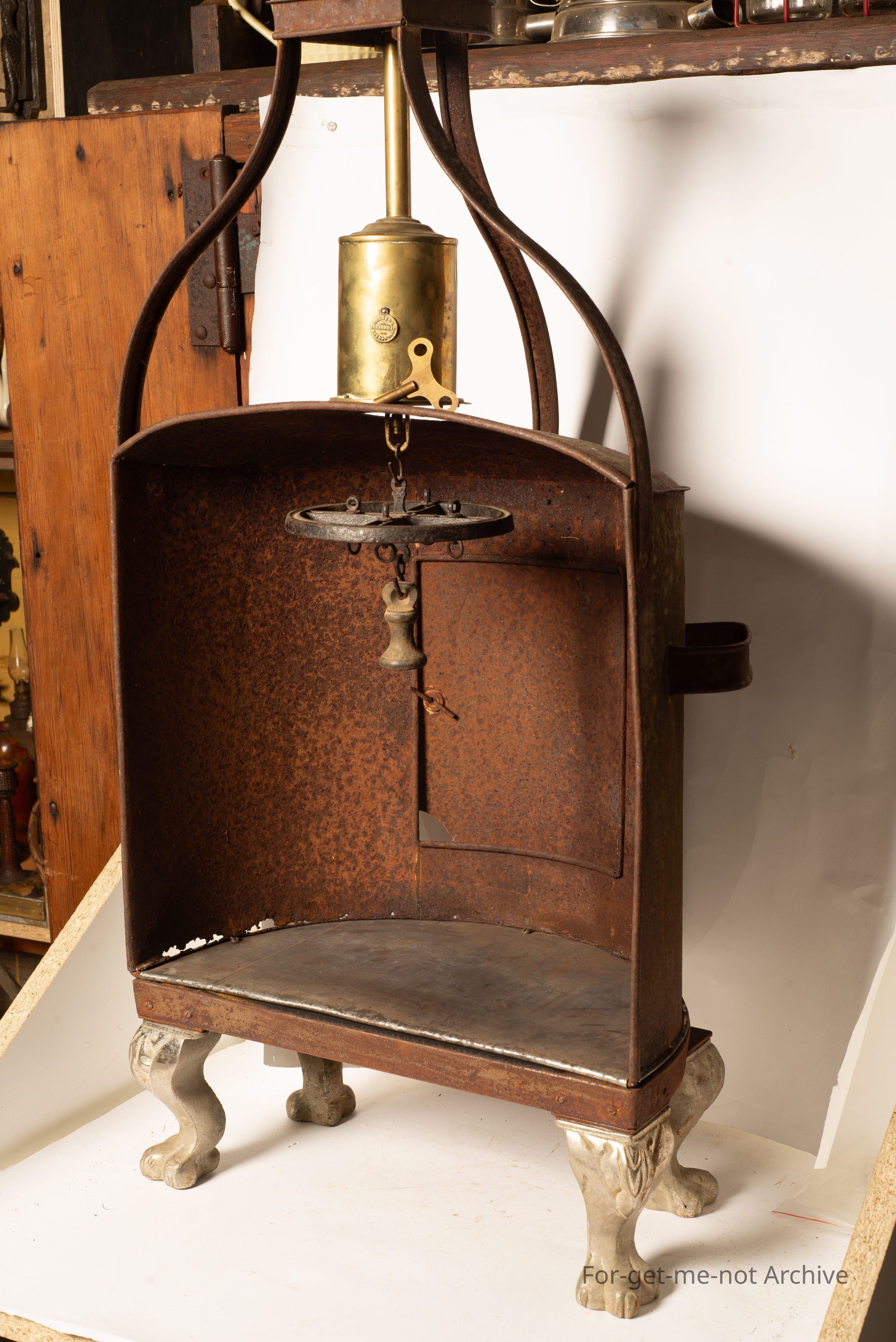 . This piece is called a hastener, standing on 4 legs. It has a fireplace jack, attached to it with the rotating wheel that goes one way then the other. These were made out of tinware and situated in the front of an open fire. They date back to pre cast iron stoves. Quite a rare item and this one is fully equipped and functional. Value Clockwork? The clockwork jack is a part of it which is in working order, with the wheel and the hookers for the meat for roasting. What's the jack do when it's running? It rotates both ways. I've already said that. Oh, yeah. Oh, yeah. Yep.Collection