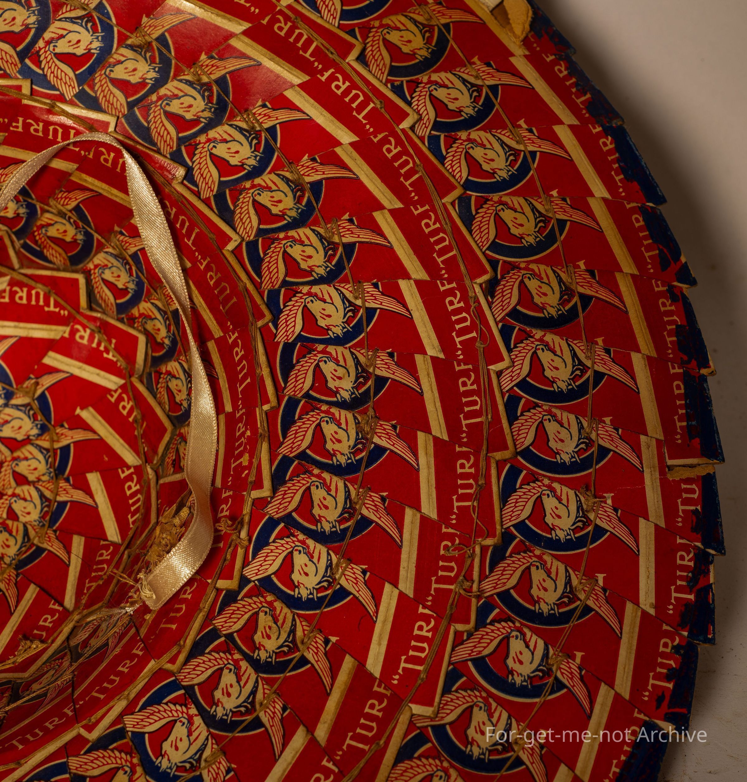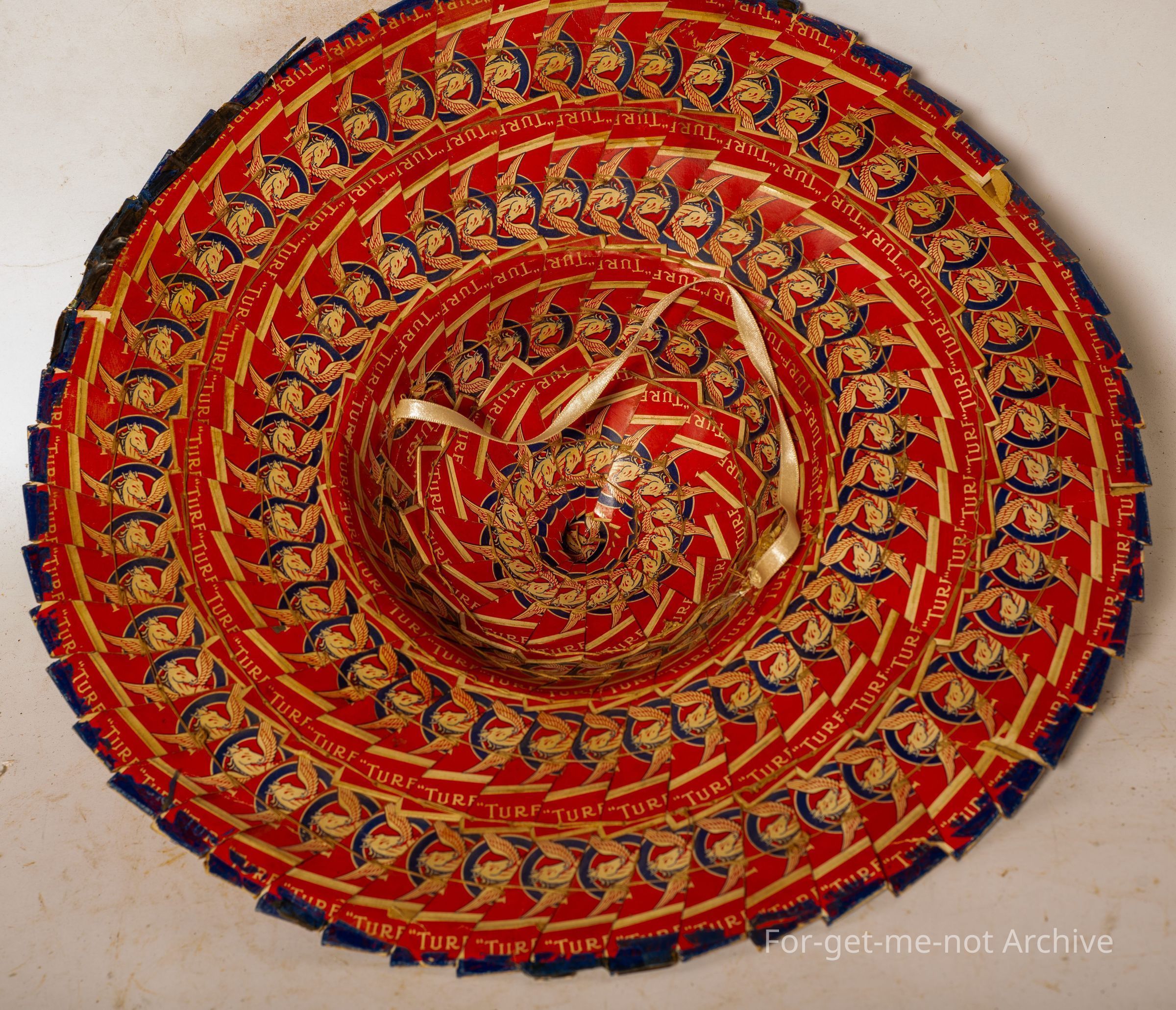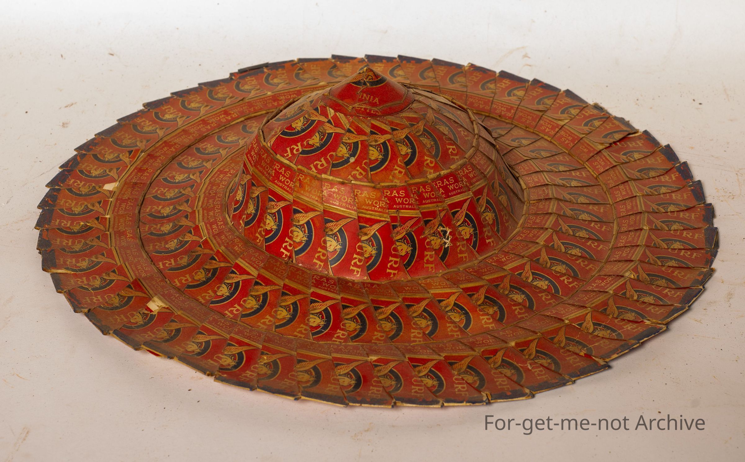 This is a craft piece. This hat is made in traditional Asian design, broad rim, tall, peak. The difference is that this is made from, turf, cigarette packets, the whole lot of it. Beautifully made, very decorative. Whether it's Chinese origin or Japanese origin, it's very hard to tell, but it's a glorious piece at the same time. At the moment, unknown origin,