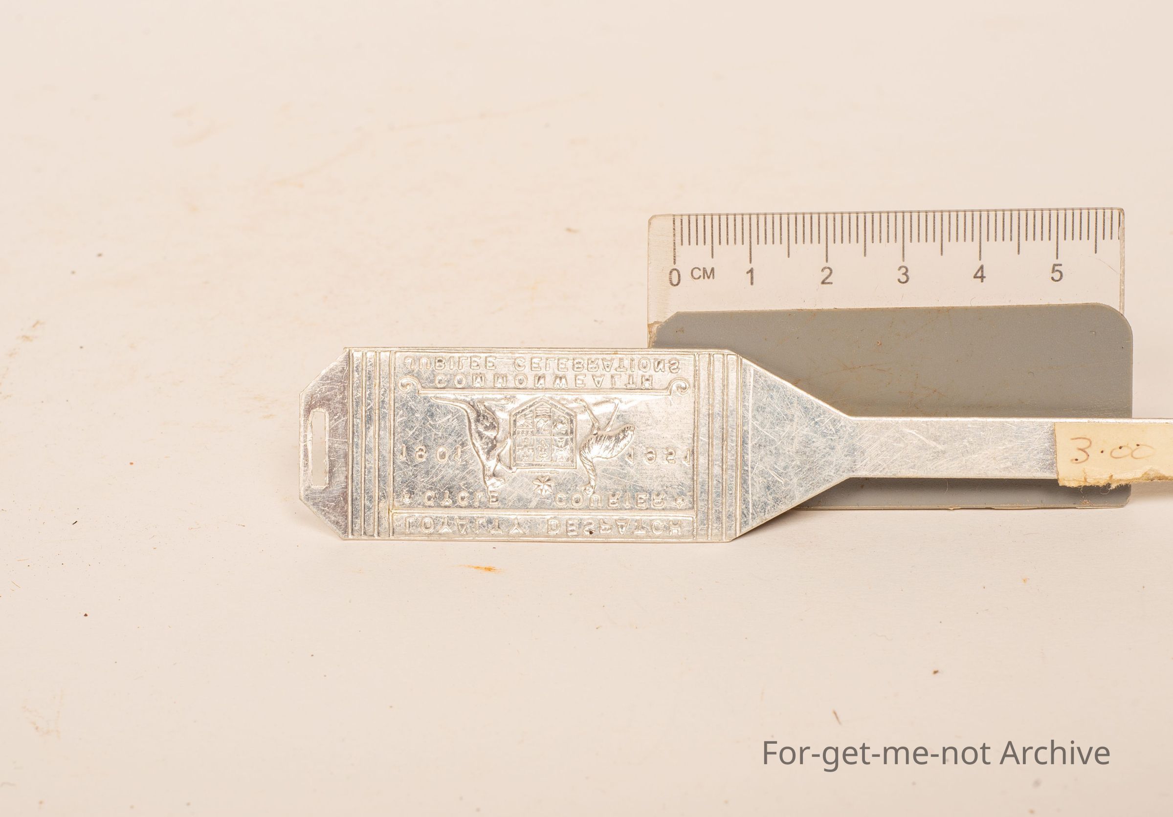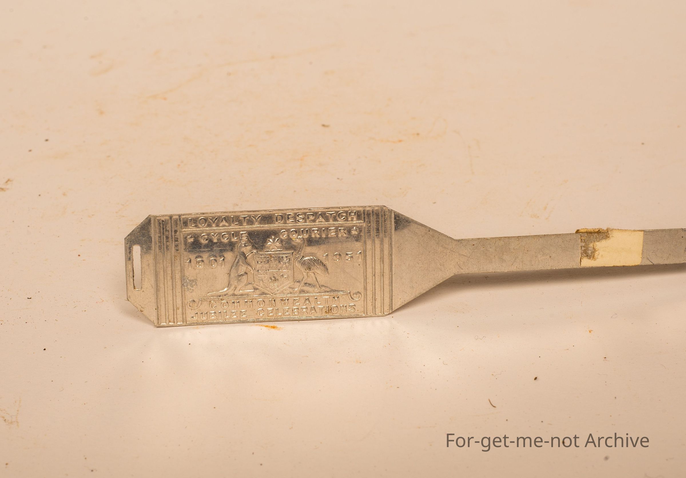A little metal, head stem badge for the pushback. Australian coat of arms, 1901 to 1951 for a bicycle courier. Commonwealth Jubilee celebrations. This one has never been used in excellent condition.Collection