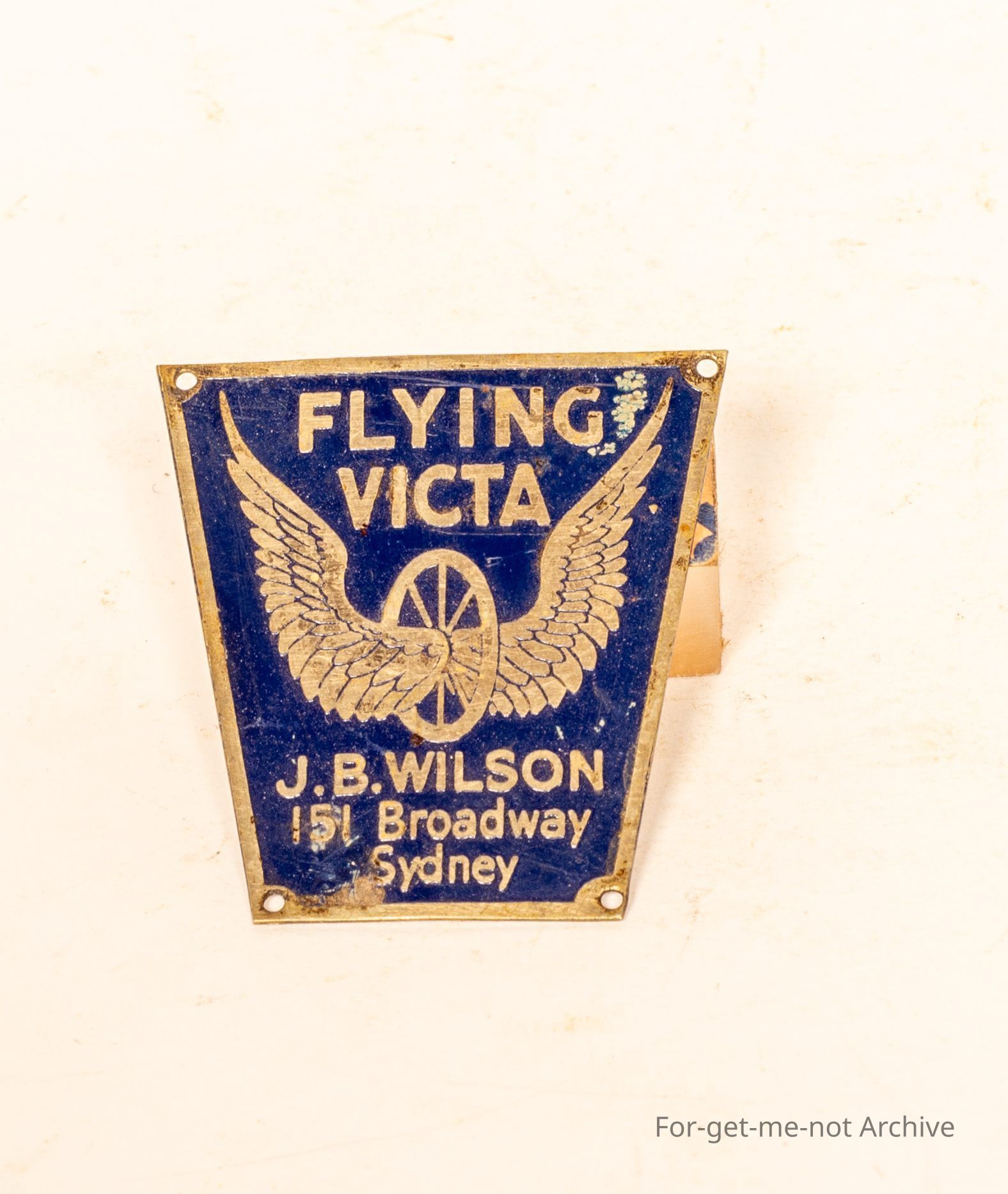 Head stem from push bike. the Flying Victor, J B Wilson. 151 Broadway, Sydney. Image of 2 wings jutting from bicycle wheel. Quite a rare badge.
