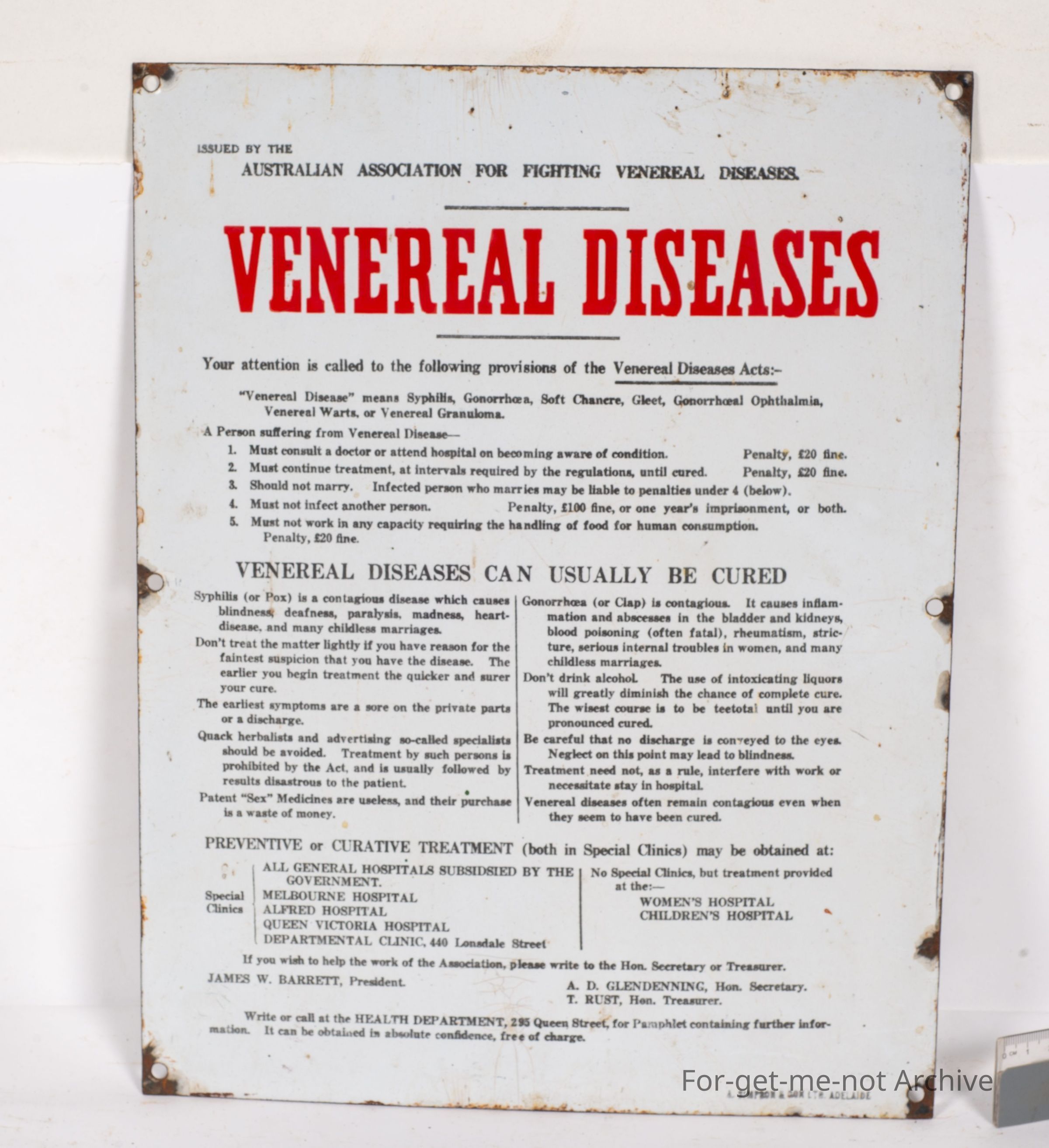 Sangeet Collection. An enamel sign issued by the Australian Association For Fighting Venereal Diseases. Plenty of directions as to, instructions on how to cure, prevent or cure it. This sign has been made by Simpson and Son Adelaide. in good order and very detailed contentCollection