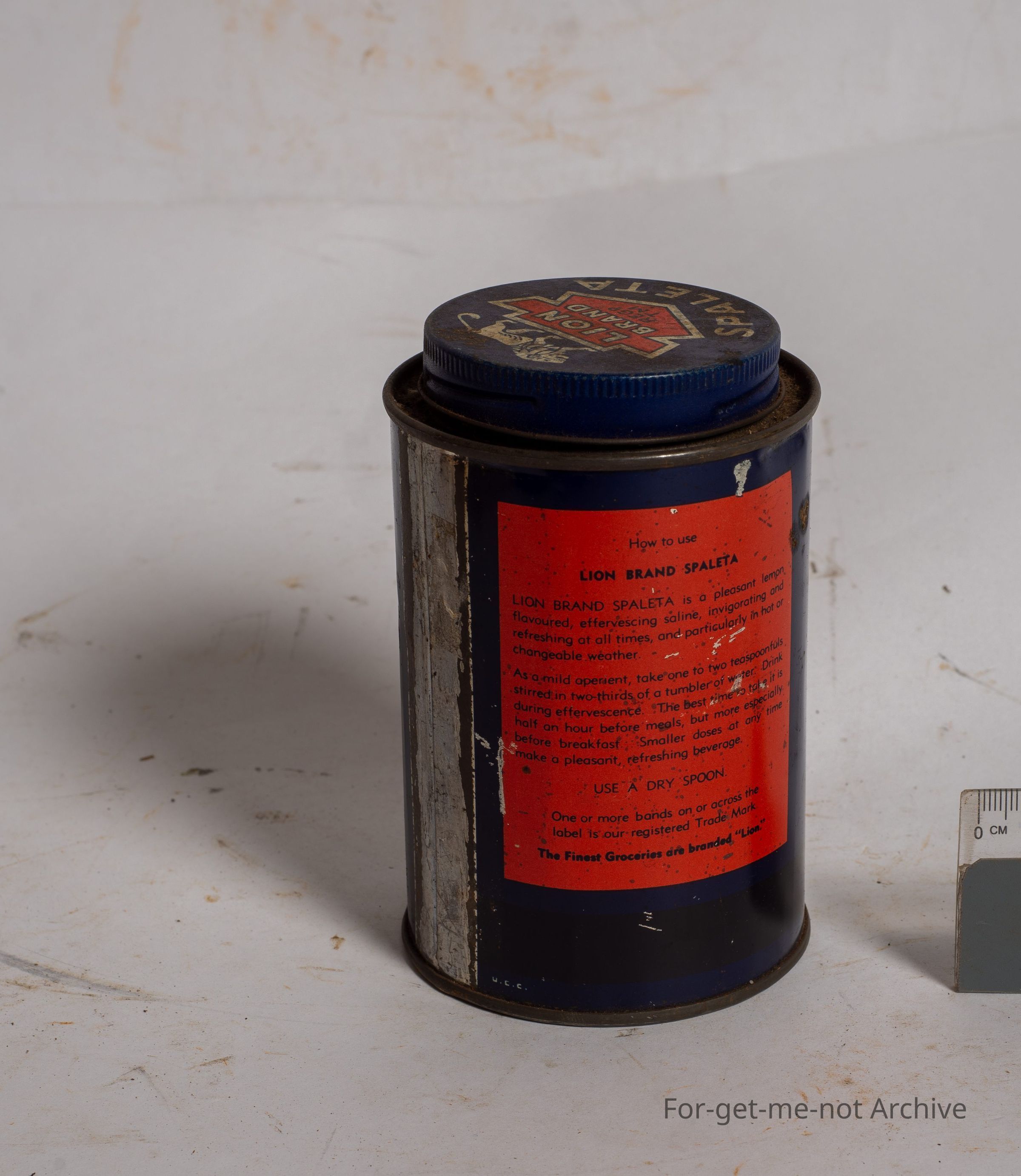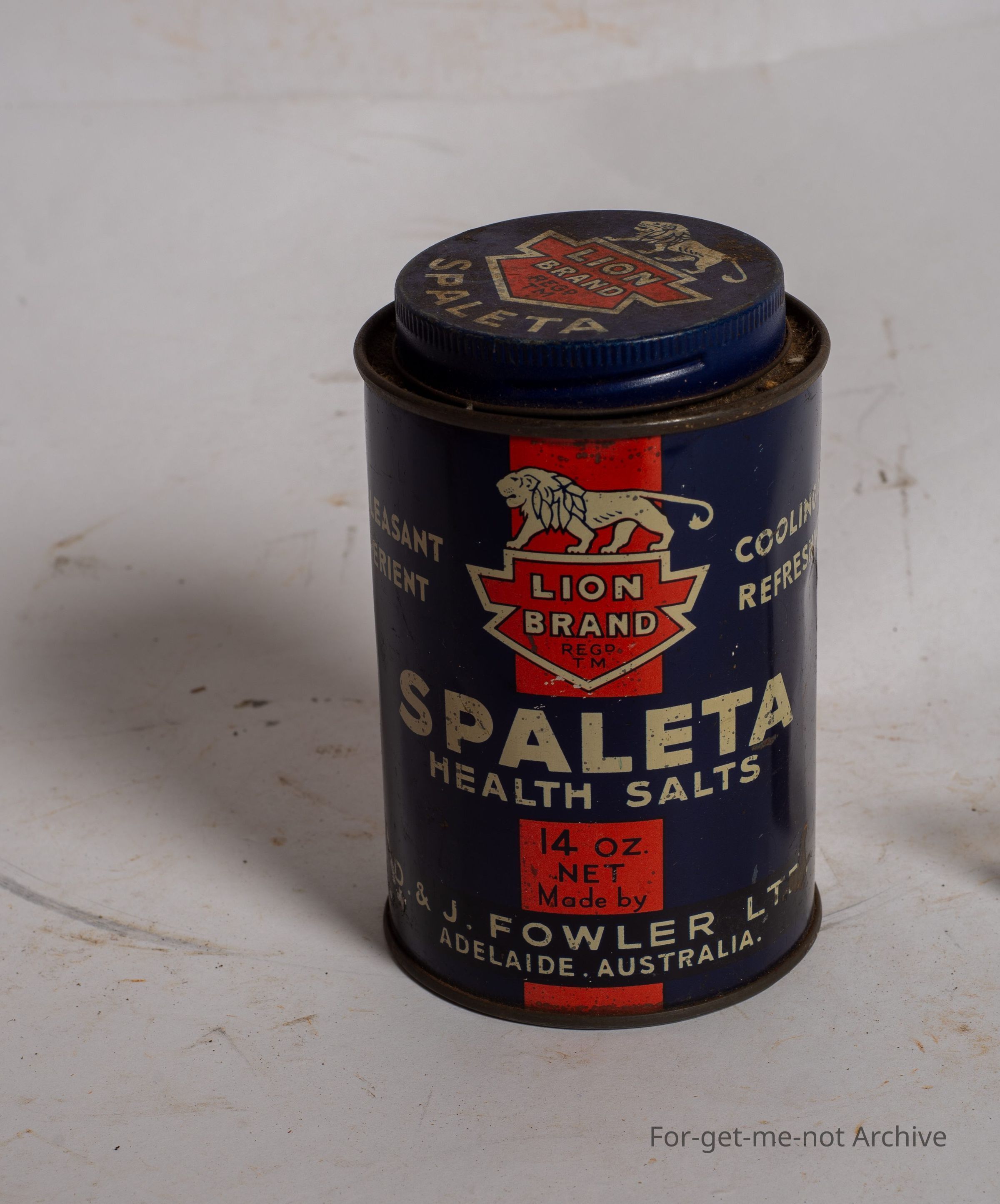 Tin of Lion Brand Spaleta Health Salts, this is from D & J Fowler South Australia, Adelaide, 14 ounce Tin, excellent condition,