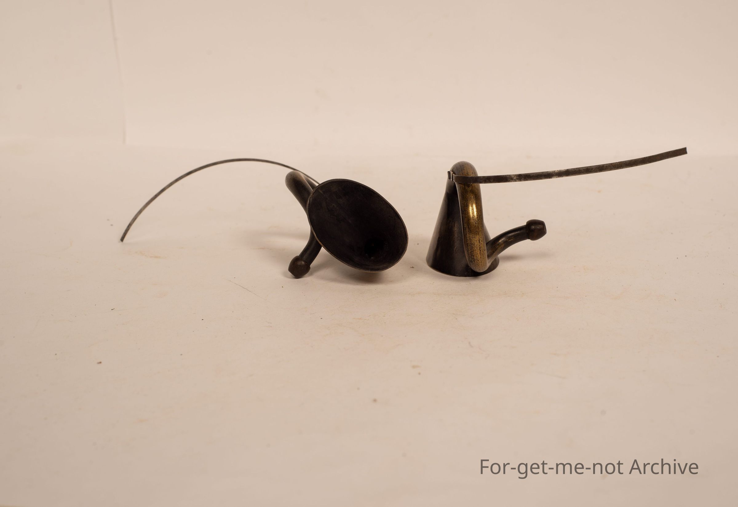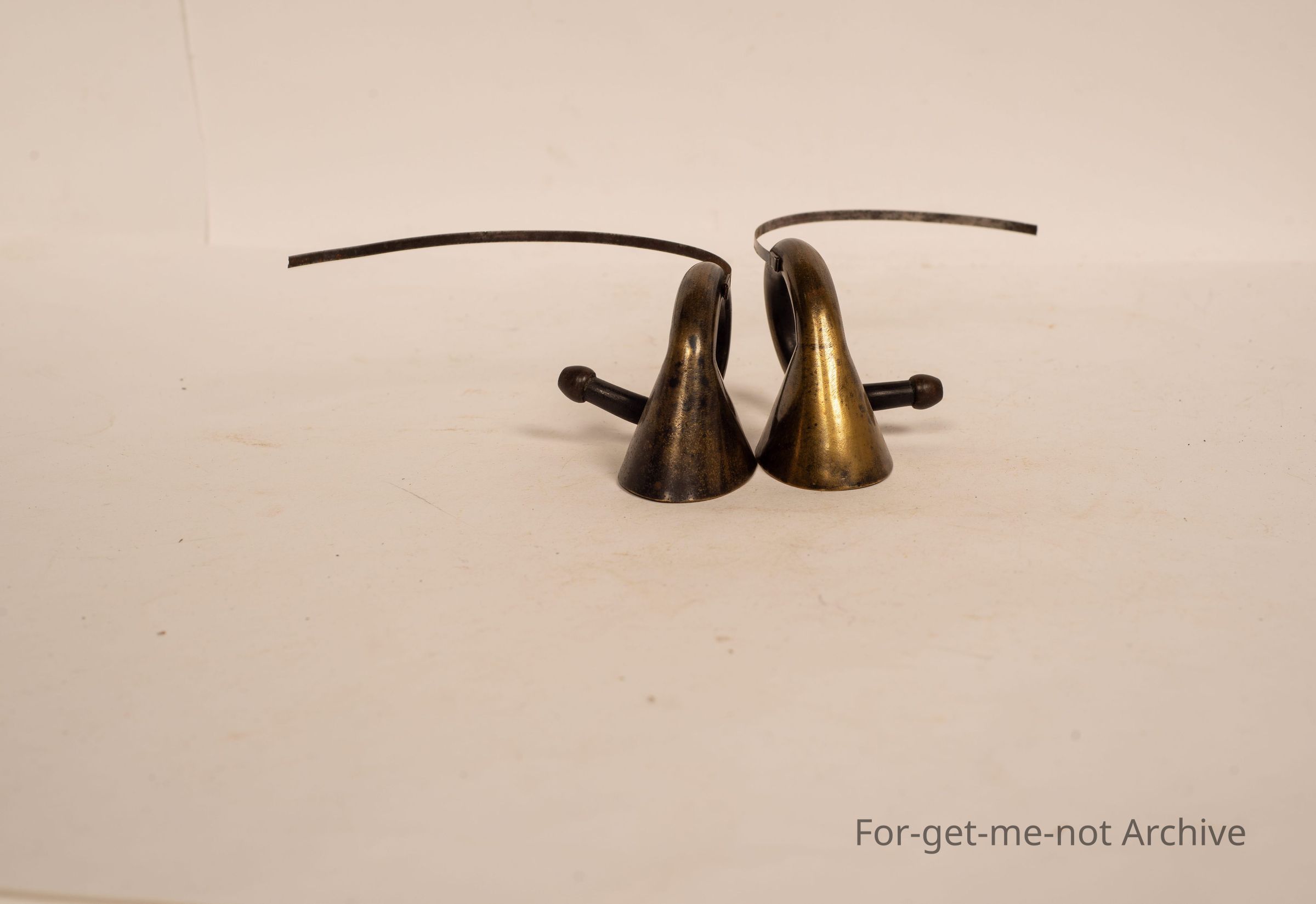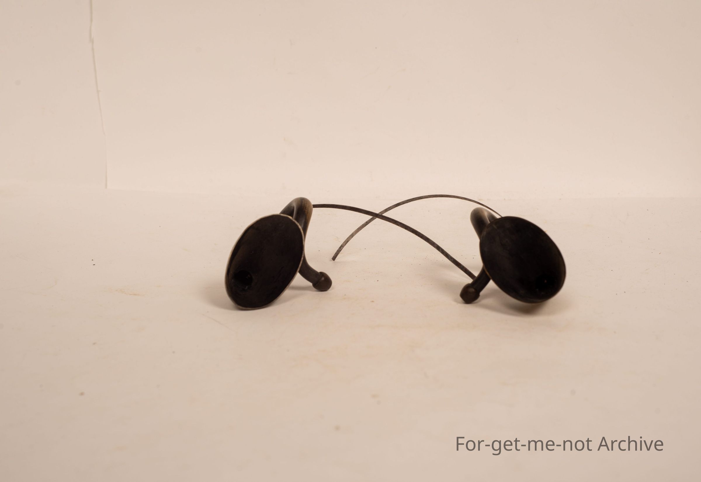 Pair of brass ear trumpets, small ones with leather straps that went over the head. These were held in place by a hat. The use of these was for people hard of hearing. When they went to the Opera, they looked dressed with these on and were able to hear. Very rare piecesCollection