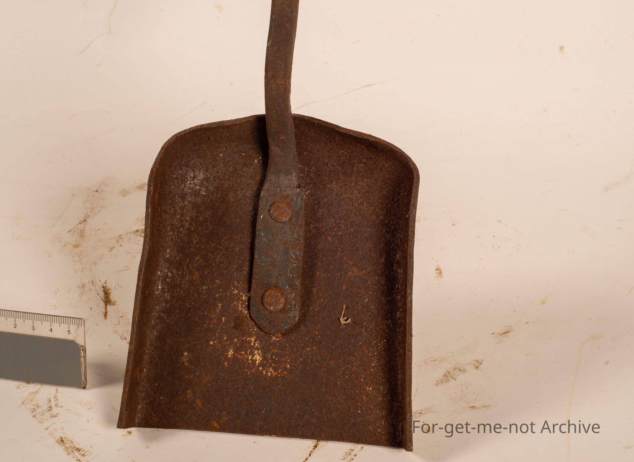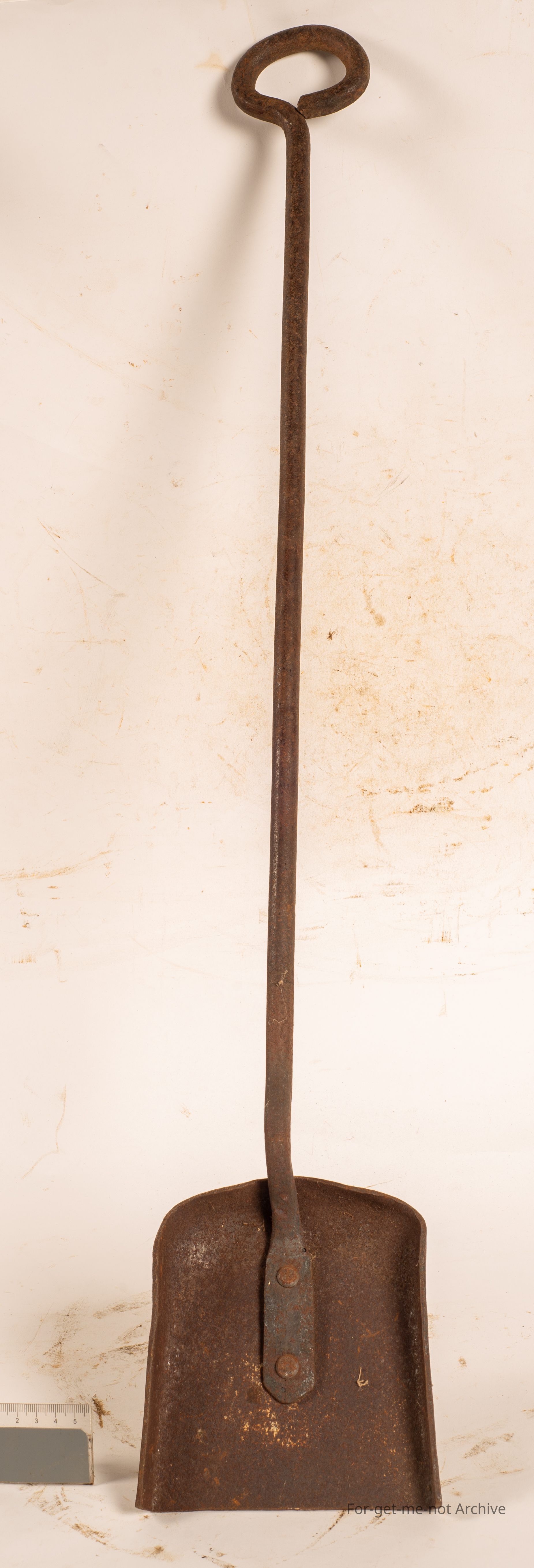 This is the heavy duty shovel that was used for small boilers like the Dixie, both to clean and move coals into respective wanted spots. Blacksmith made, heavily riveted. Lovely little piece.Collection