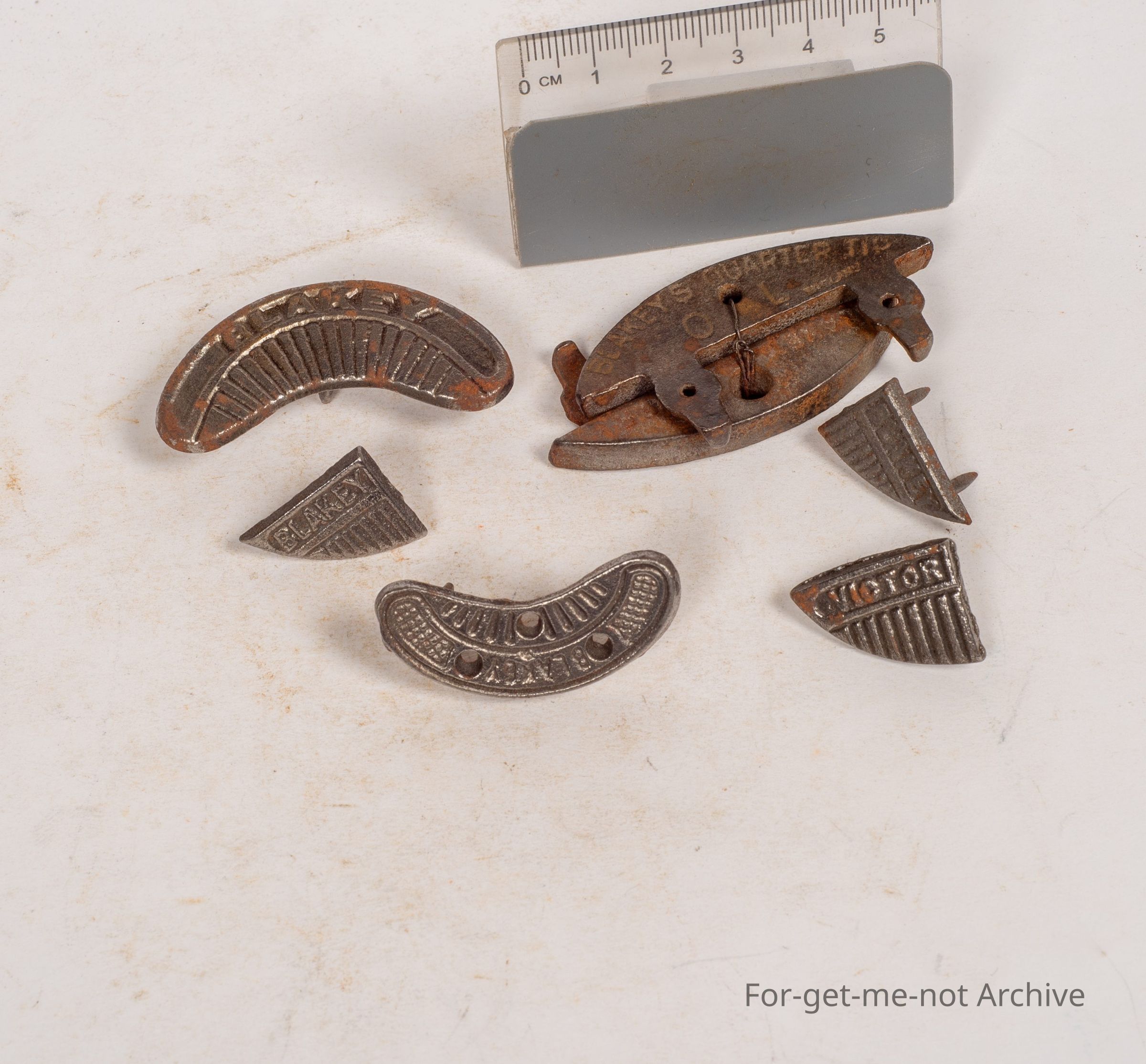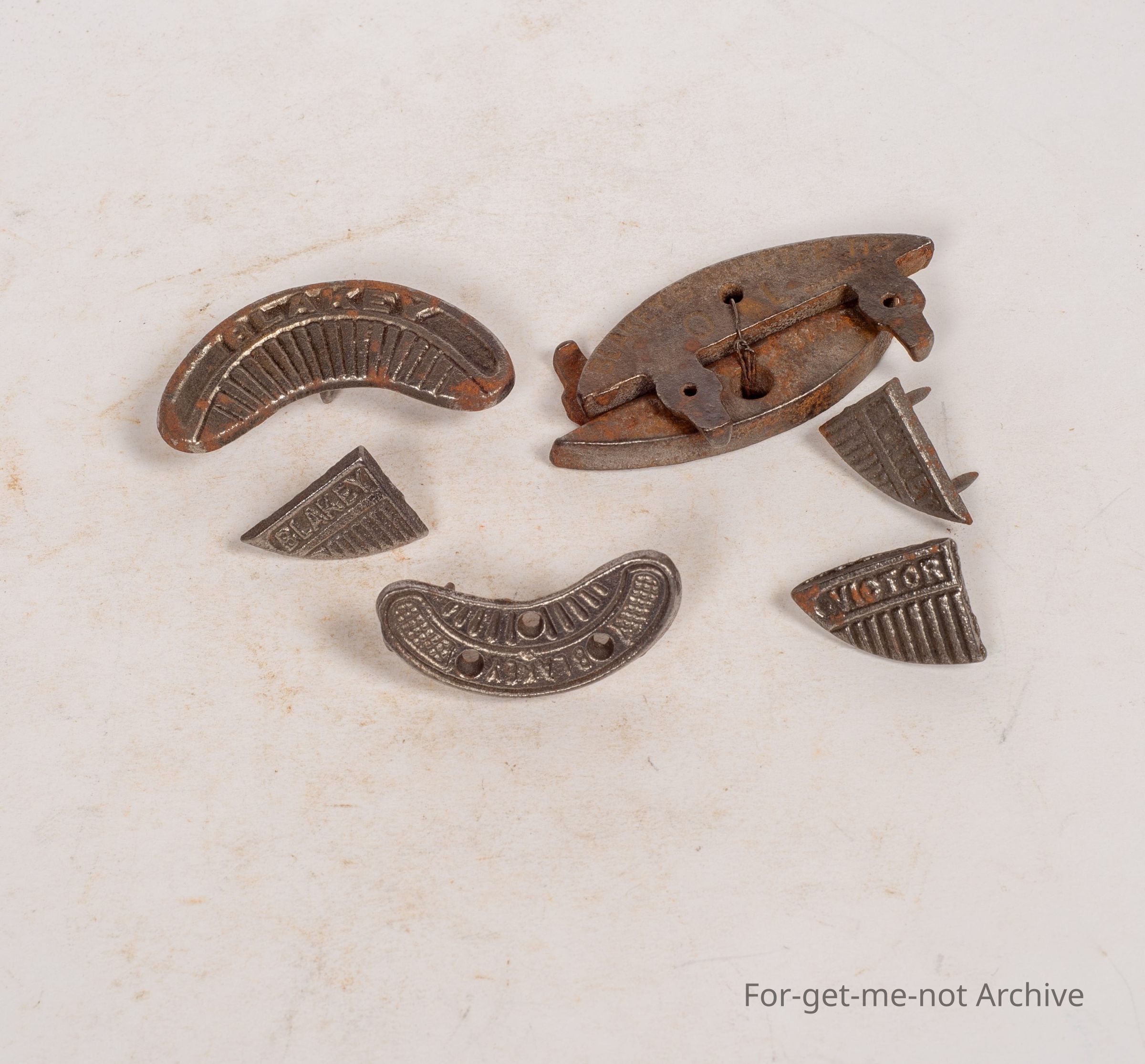 Heels, metal. The group , these are cast heels made by Blakely. All in different shapes, sizes and purposes, all very decorative. 2 of them are made by Victor.