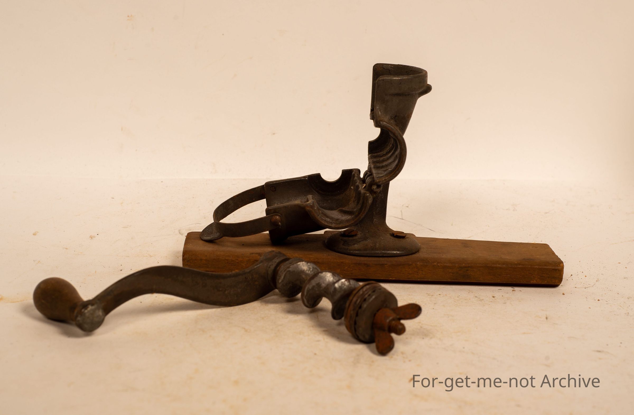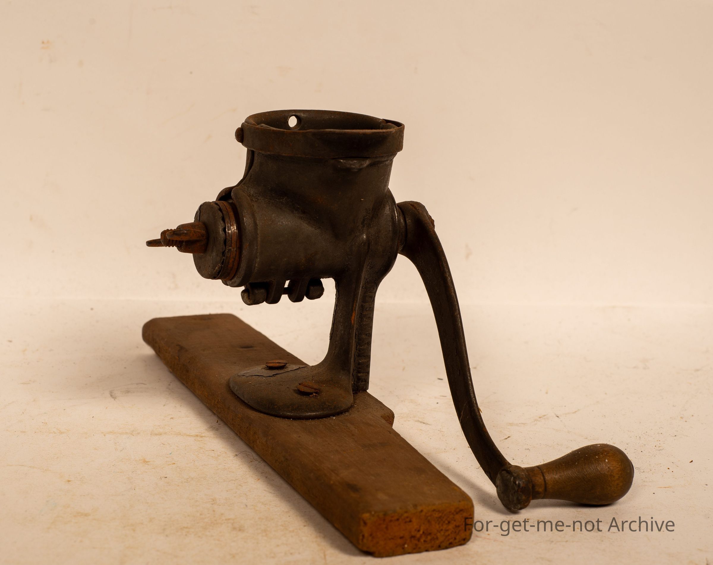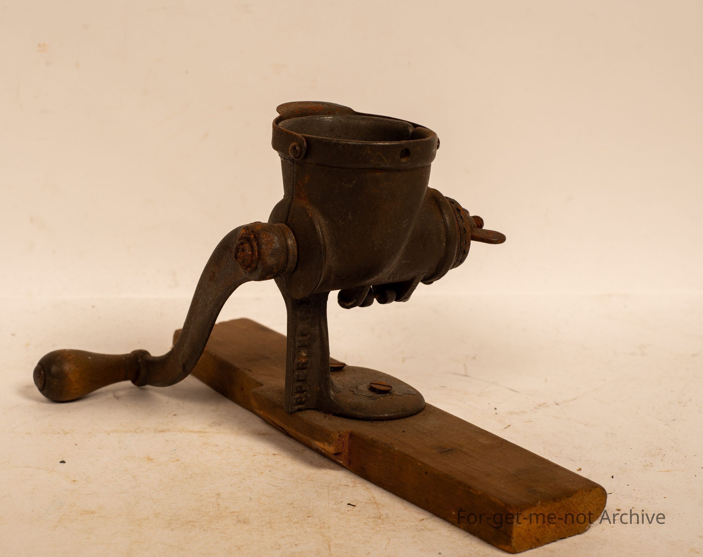 Is a small, herb grinder called Railman, chopper number 12, mounted on a wooden board.