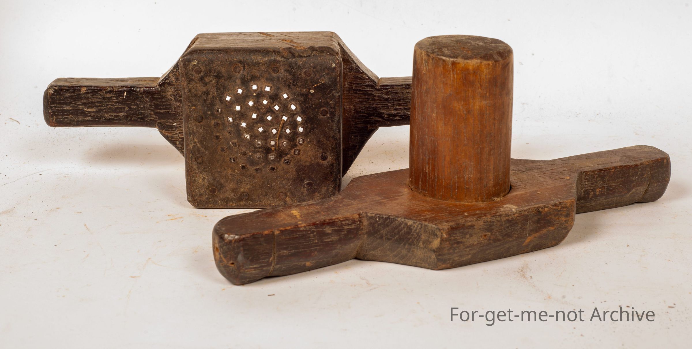 A very homemade looking herb grinder, made from heavy wood. Pretty rough and rustic. Probably would have worked as a piece of tin in the bottom and when you rotate the top, this churns the , herbs up into a powder. A lovely piece that's still functional today.Collection