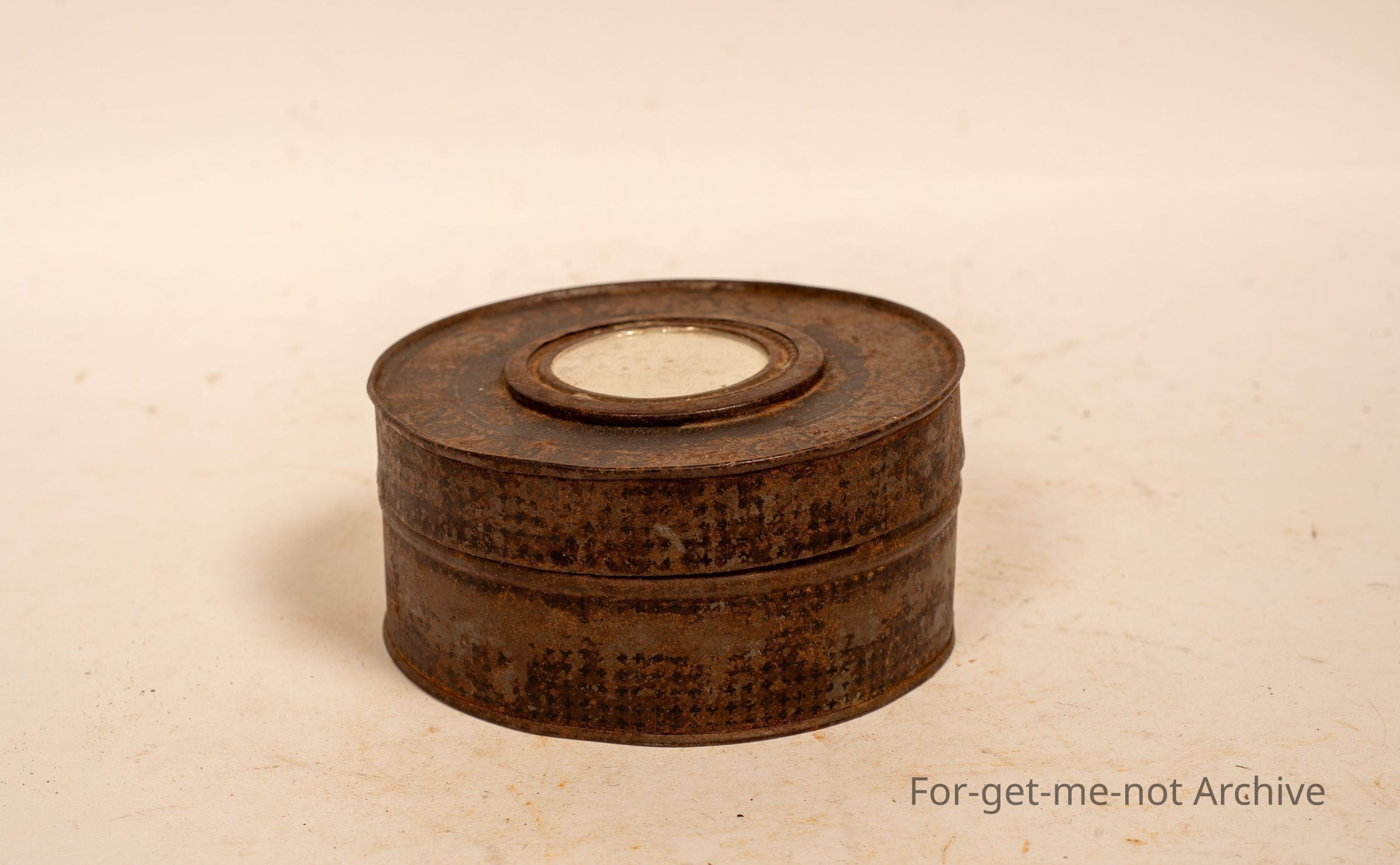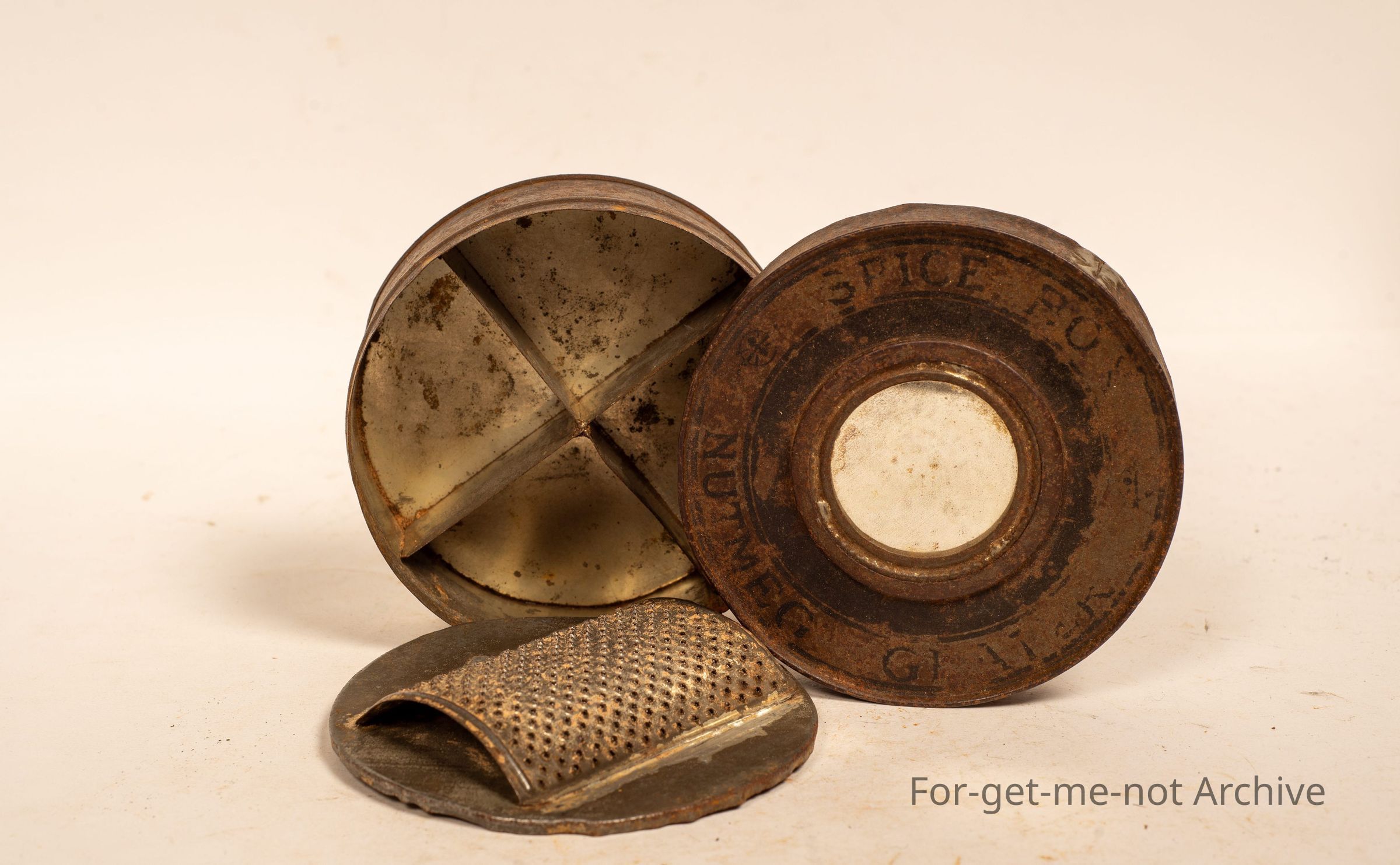 Is a round canister for grating nutmeg and spices with storage capacity of 4 different sections with a little round mirror in the top.