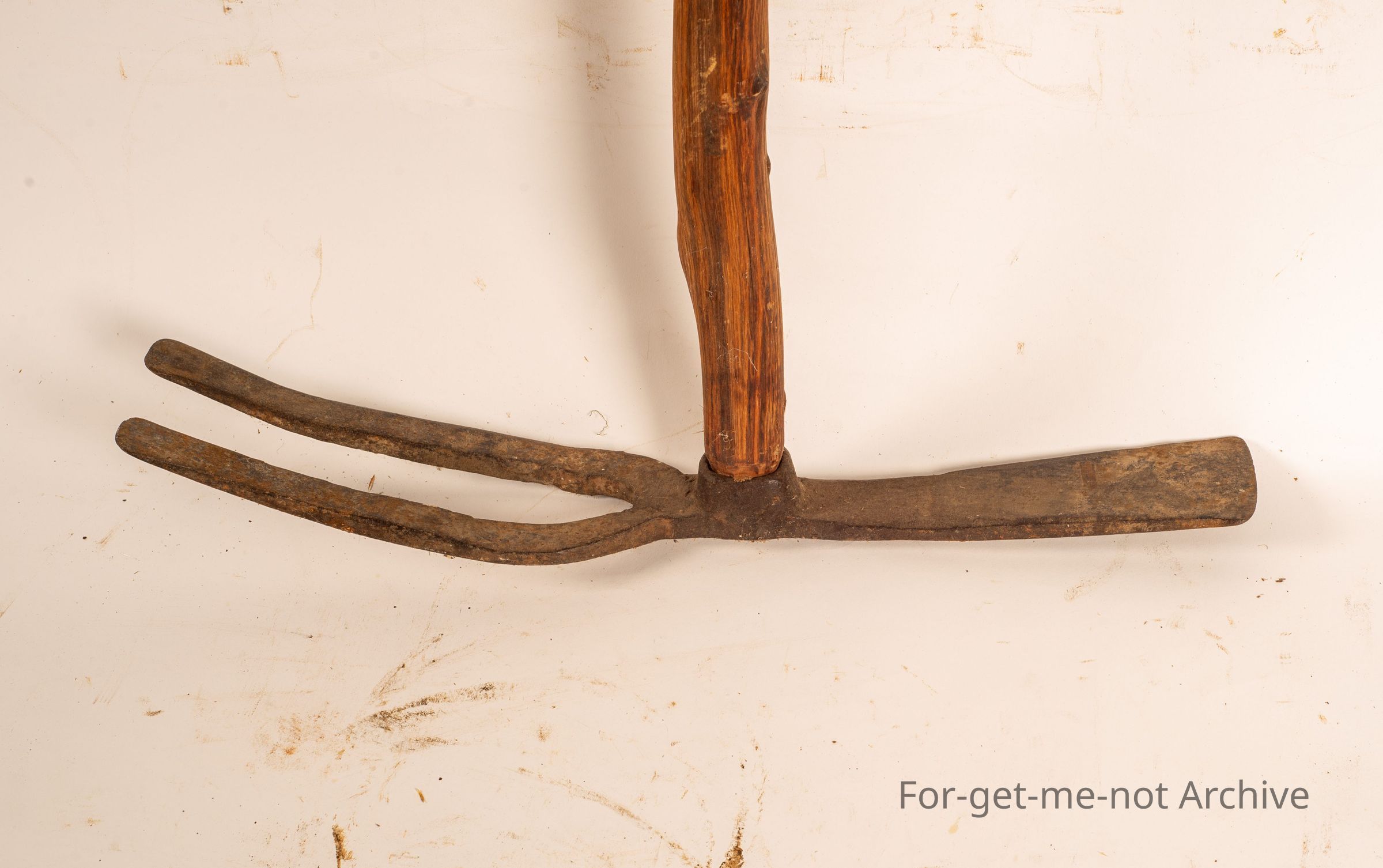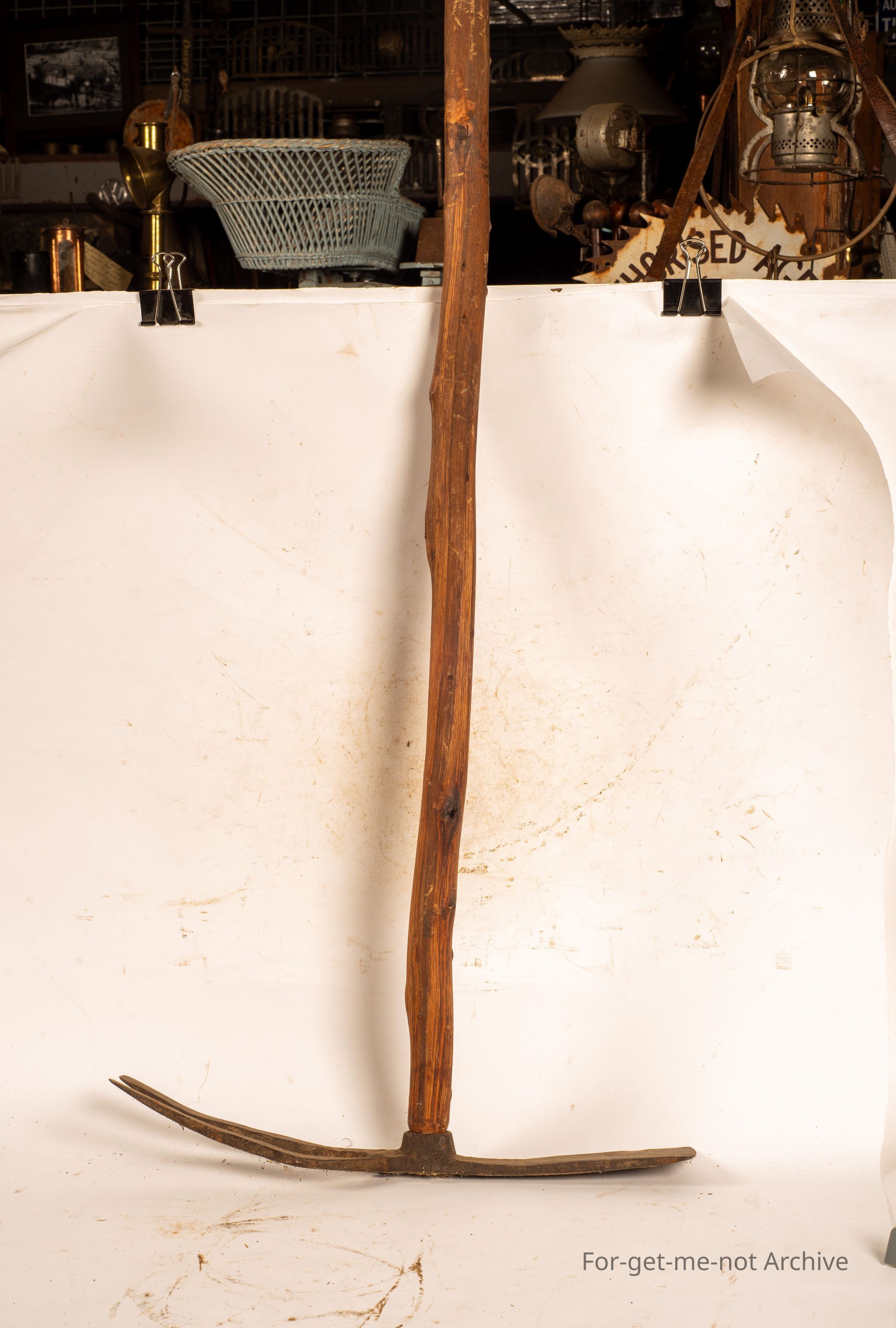 This is hoe, which is a steel ended 2 prong one end and a blade the other, this hoe was, dug up with a rotary hoe from a Chinese market garden area in Ballarat East. I've put a wooden handle into it and it looks really wonderful. Lovely early bit of Chinese history from Ballarat.Collection