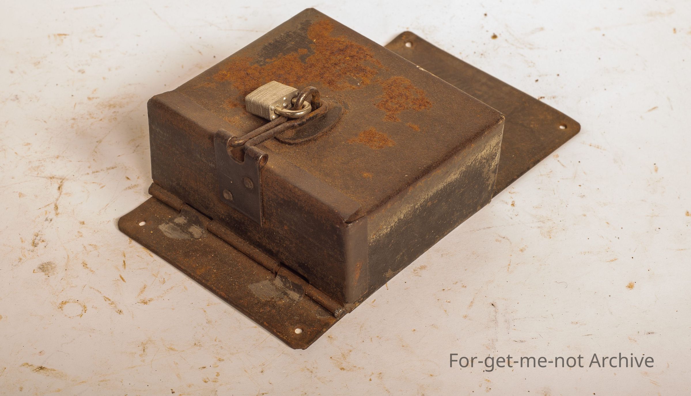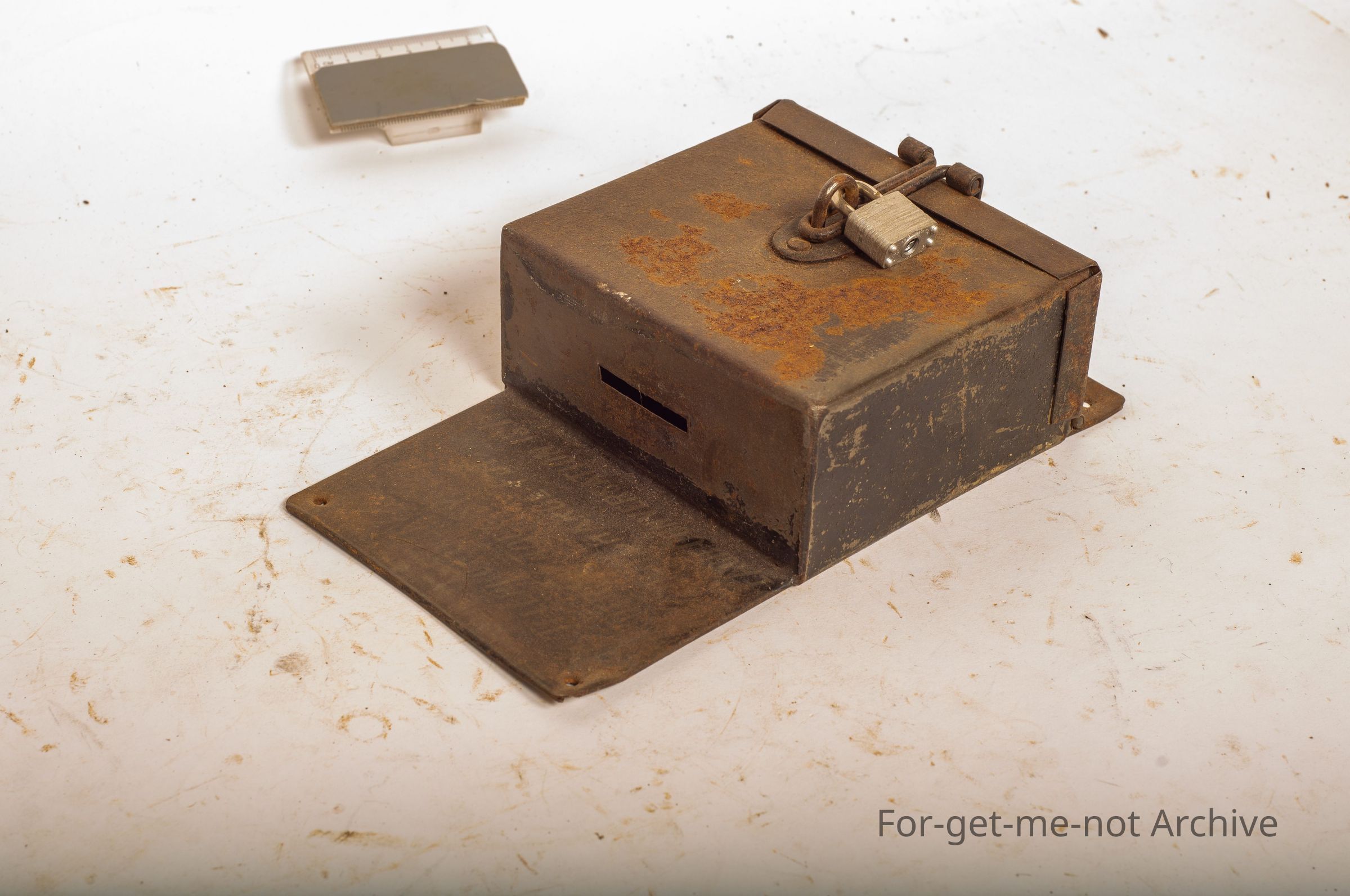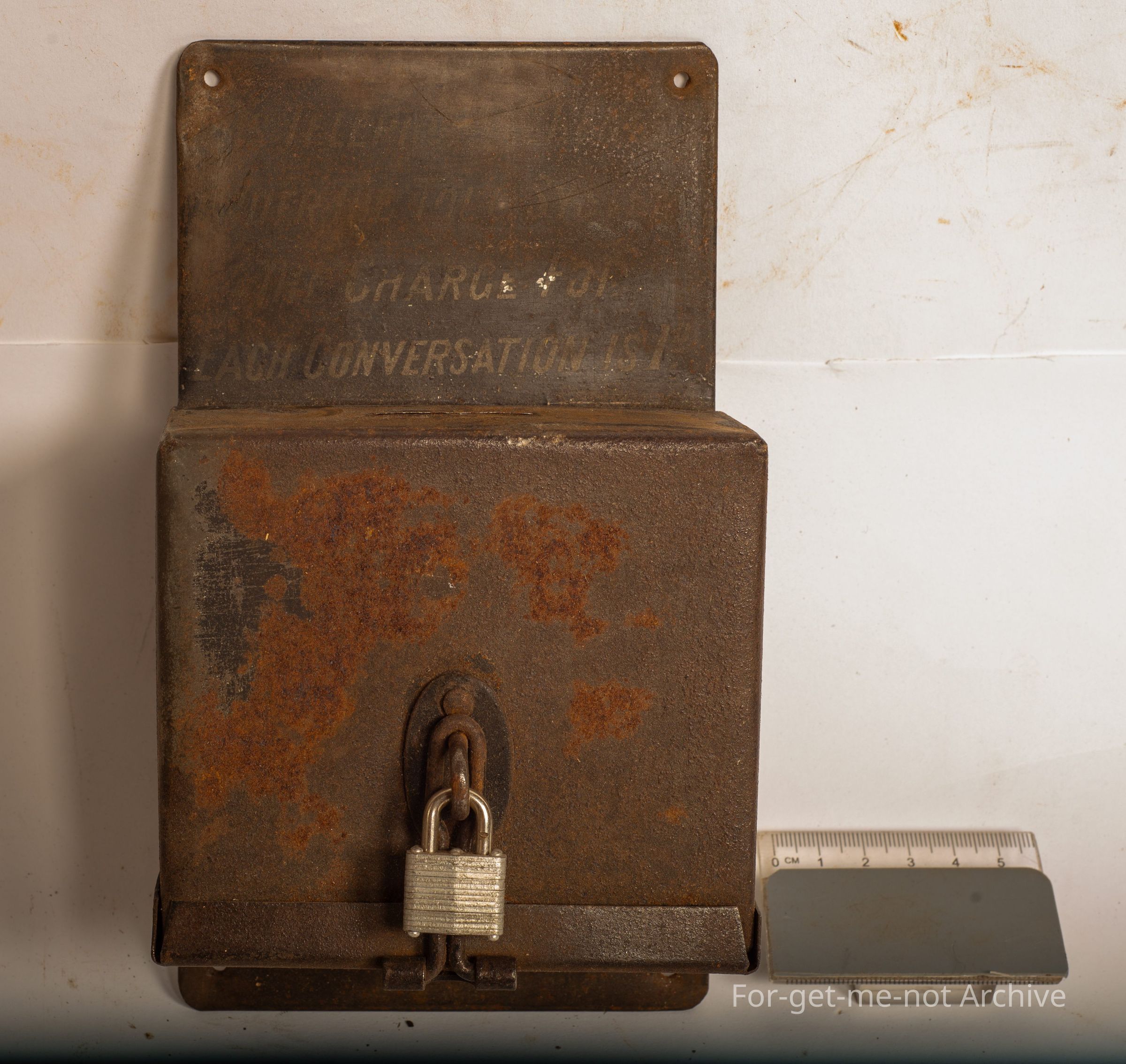 This is a box. For when you if you made a phone call, there had to be a box to put the money into to have your conversation on a telephone. An honesty box for a telephone, with little lock would have been screwed to the wall adjacent to the telephone.Collection