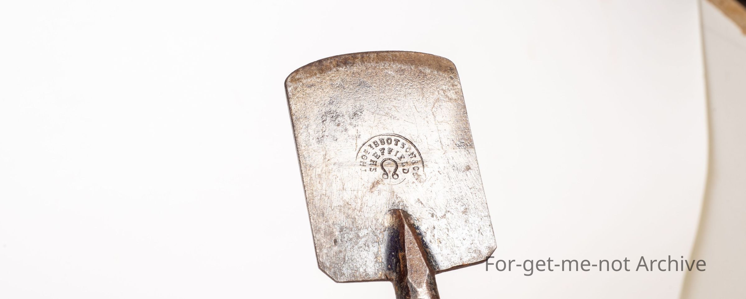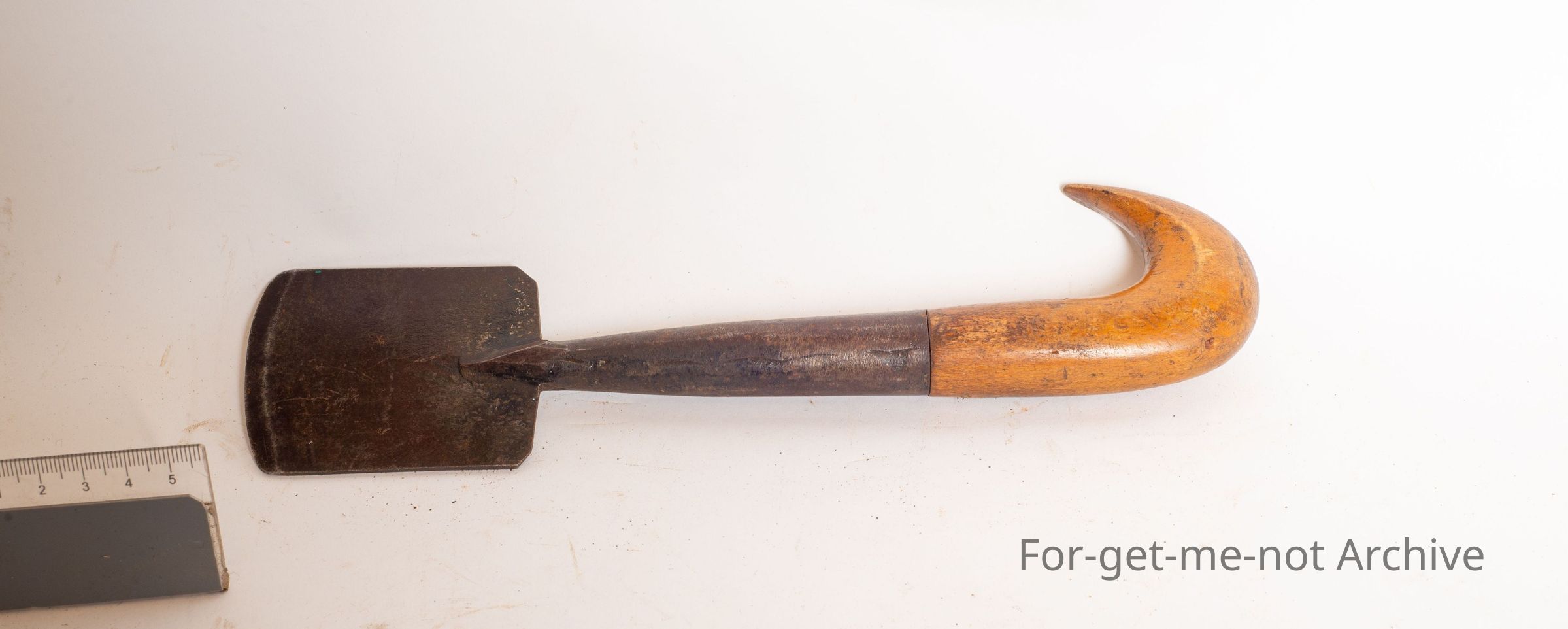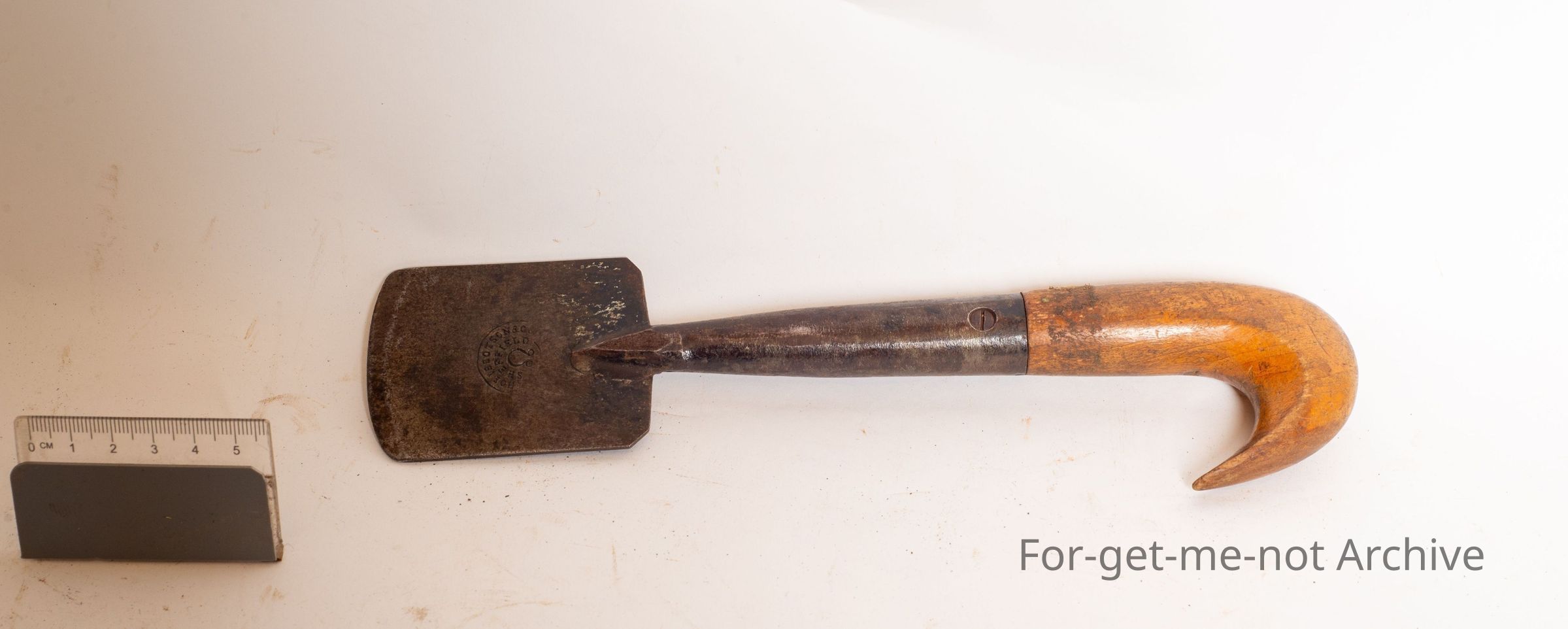 Has a blade, a sharp blade on the front, a stamping of Thomas Ibbotson Sheffield wooden handle with the appearance that it's been used for pulling backwards, not pushing.