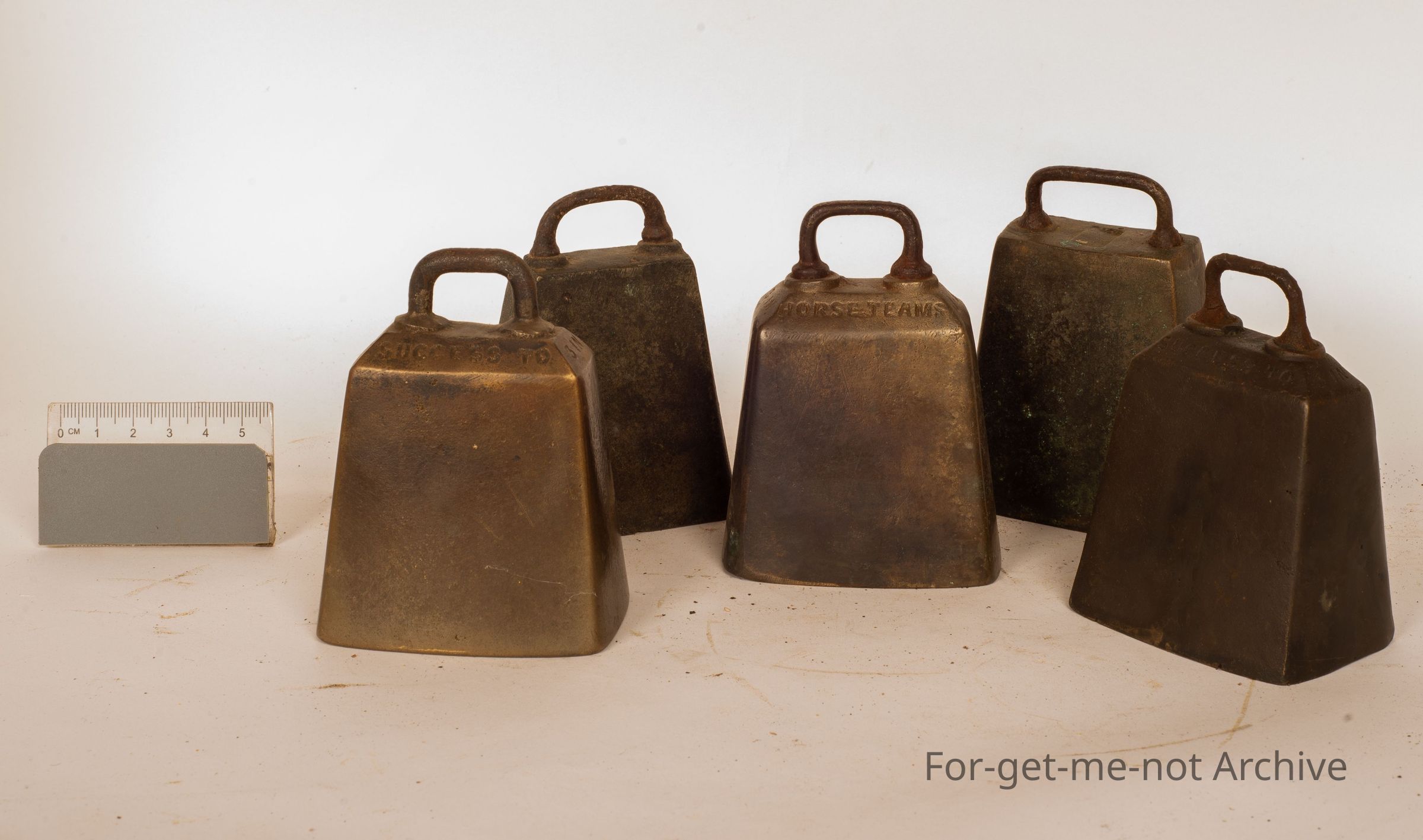 This is a group of 5 horse bells cast brass, with the text of success to horse teams, cast by James Barwell Birmingham