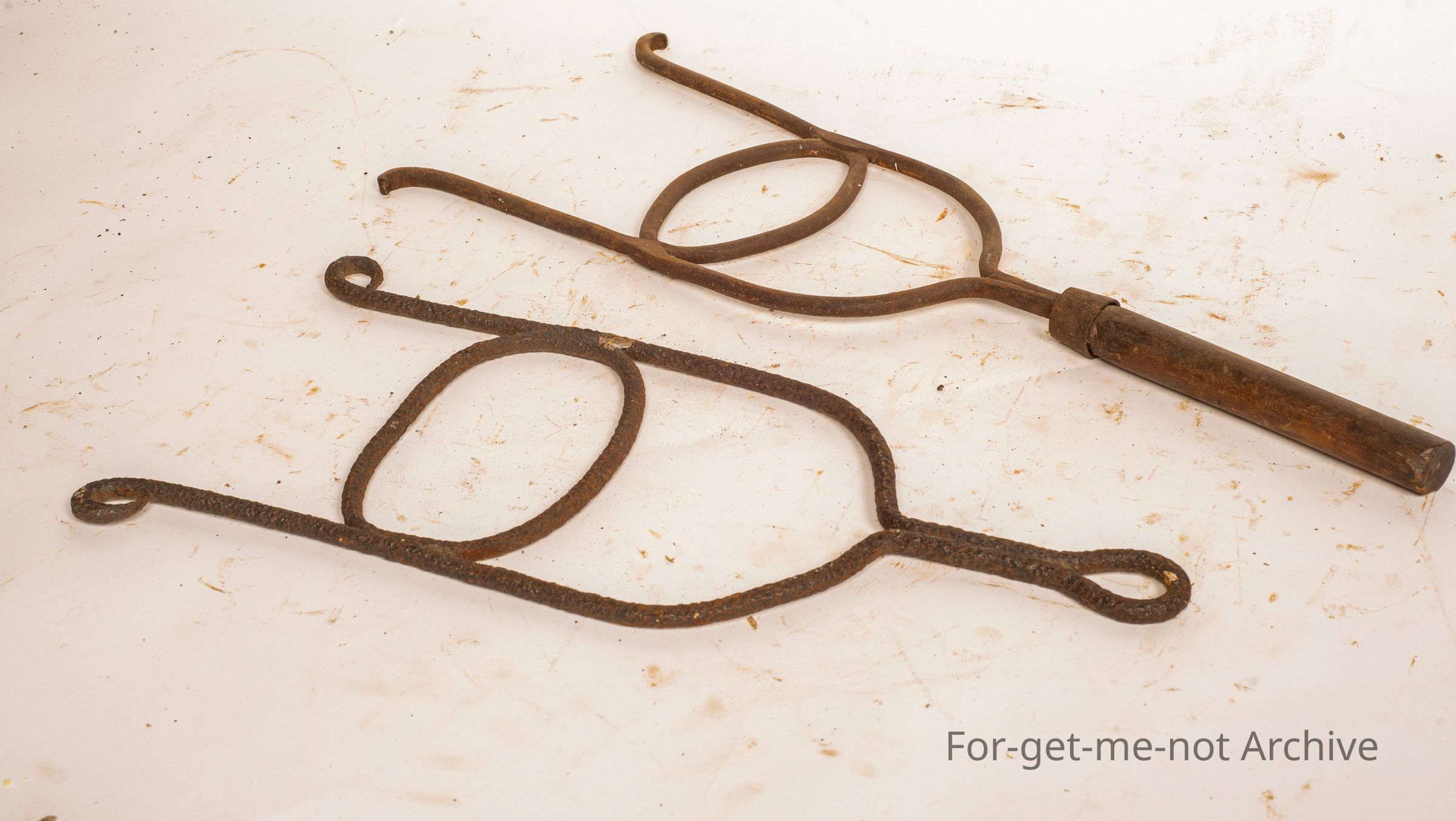 These, 2 tools, relating to horses. Their correct name is bowling iron. They were placed in the mouth of a horse, similar to a bit. The handle was brought down vertical which separated top and bottom jaw allowing horse dentists to safely, put their hand in to assess the condition of the horse's teeth without risk of being bitten, value for the true,Collection