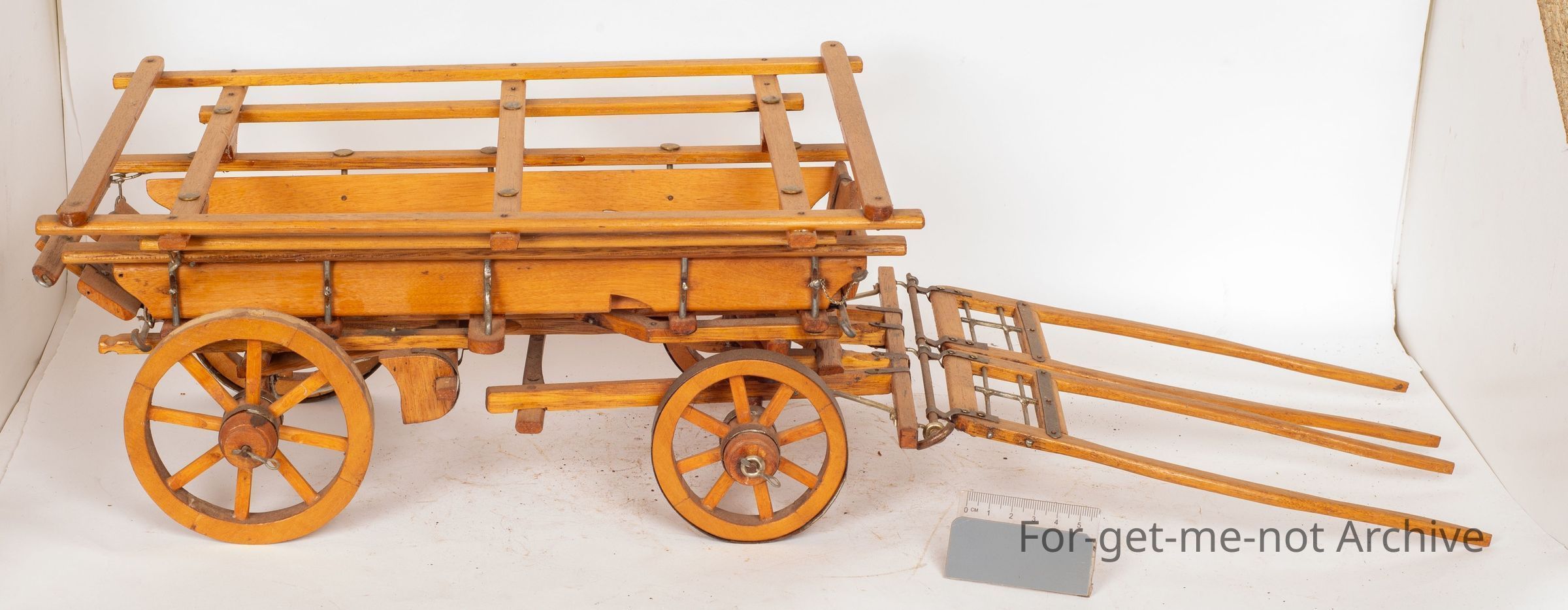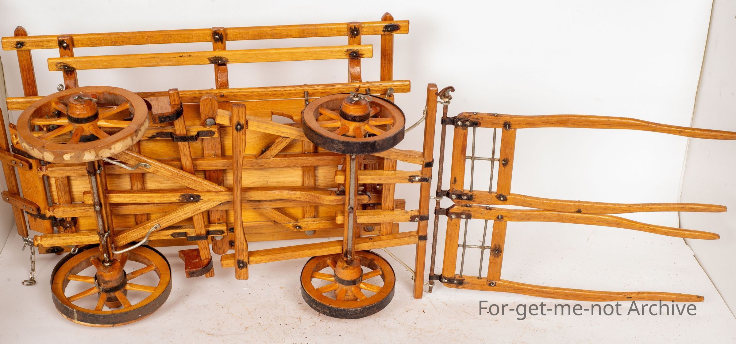 A scale model of a horse drawn wagon, Beautifully done. The wheels, the whole body, shafting, everything, turntable under it., F Bozier. 1985