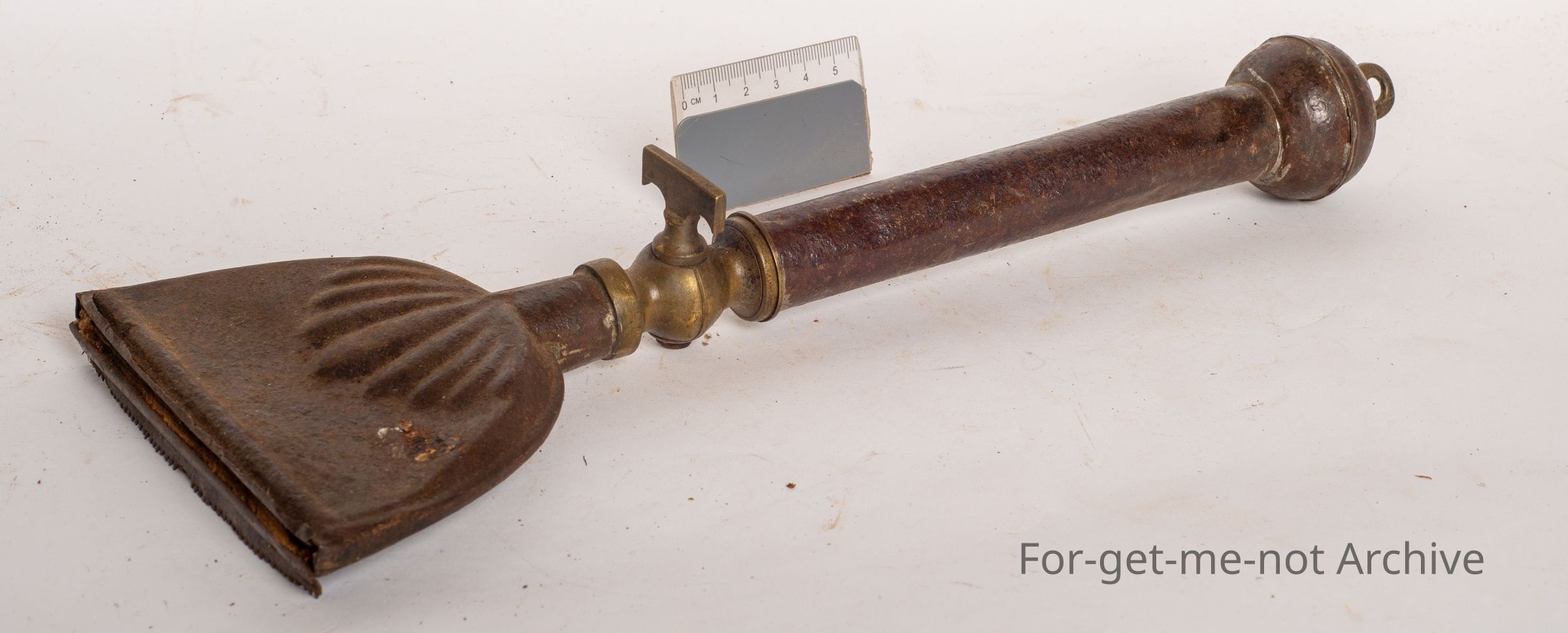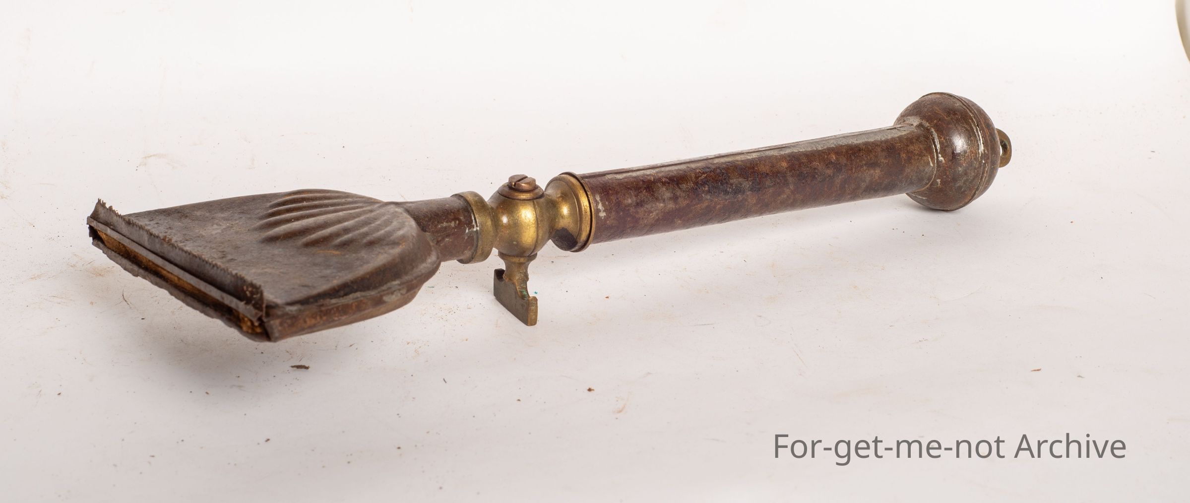 This is a horse singe. The handle was the fuel tank, had a tap to monitor the flow, a large wick. It was to be pushed up against the lie of the horse's hair and would cut the hair off with the burning flame as it went. This is a cheap model one. The more expensive beautiful ones are all made of solid brass.Collection