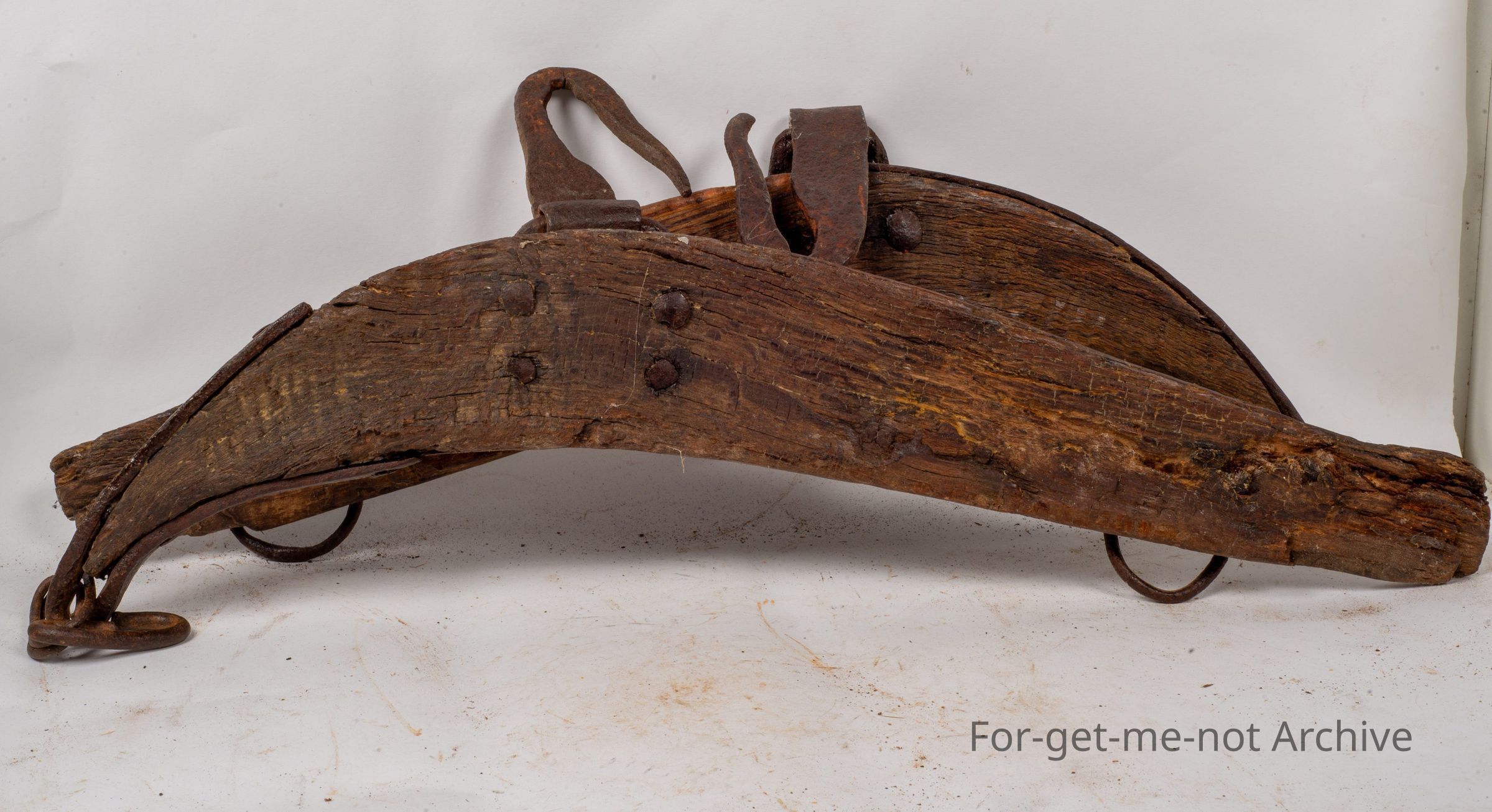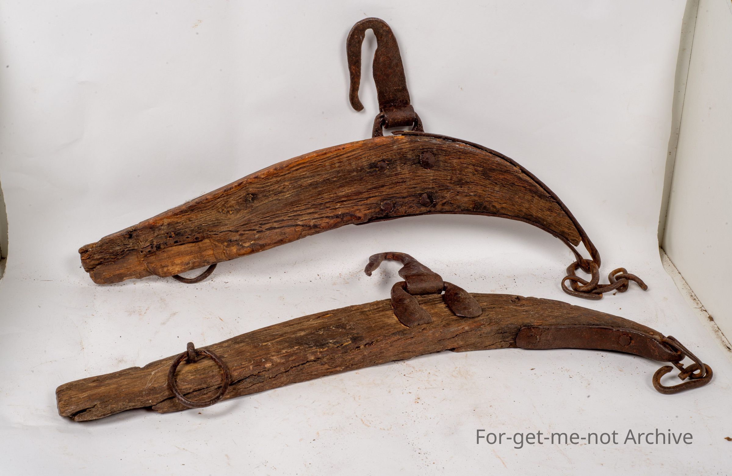 A classic piece of early improvisation. These are a completely homemade set of Haymes that would have got on a horse. All the hooks and loops and the chain are all hand forged. The haymes themselves have iron strappings to keep them in, shape, and the internals are all hardwood. These are a wonderful pair dating back, I would say, well before the Depression. Hard to put an age on them, but all homemade and a lovely bit of Australian ingenuity.Collection