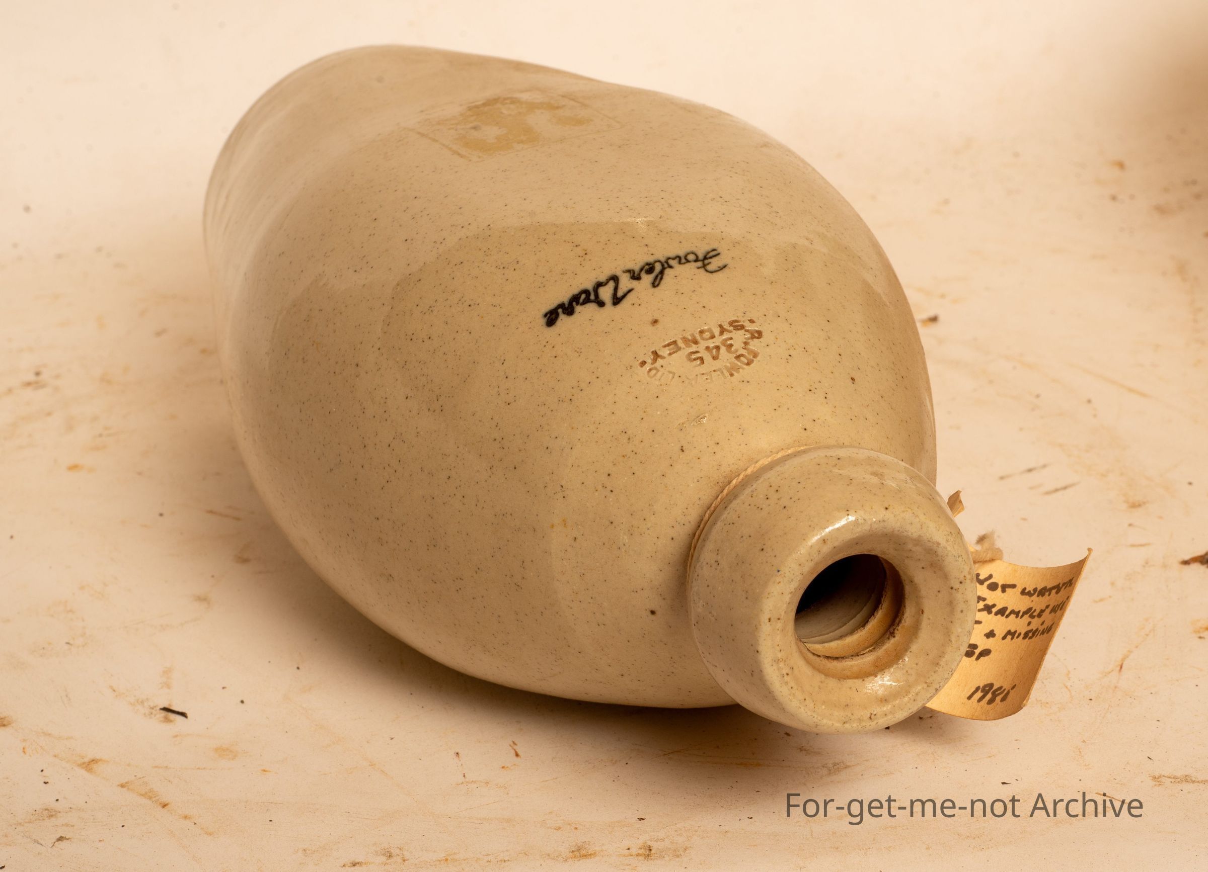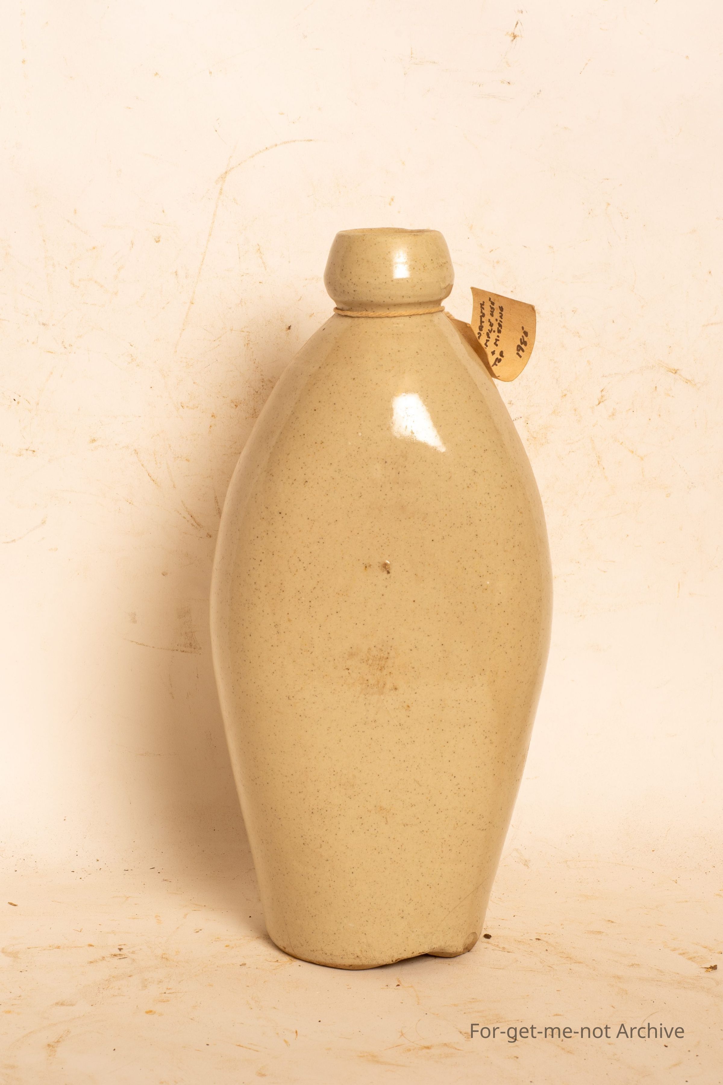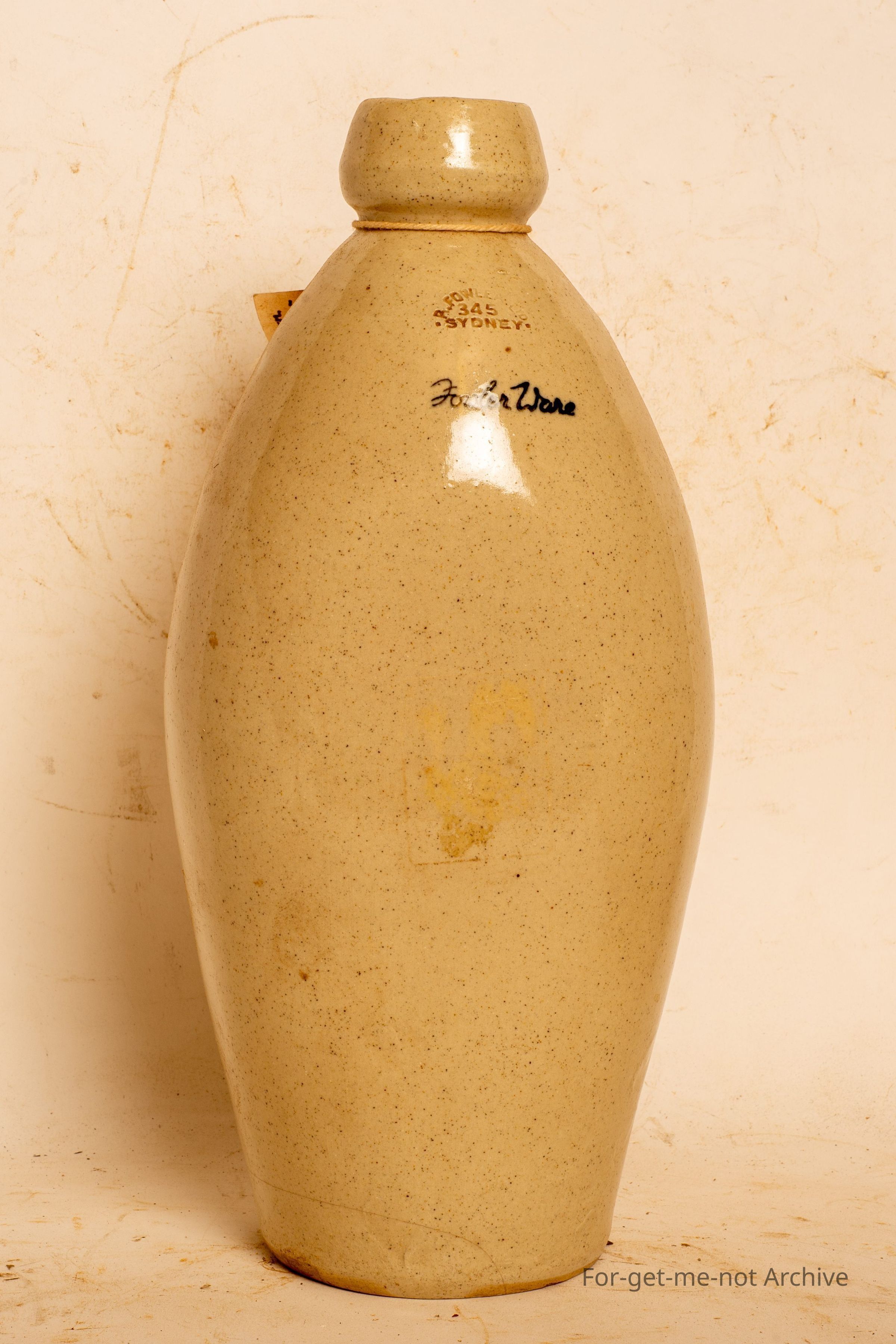 This is an unusual shaped Fowler, hot water bottle. Would have had a cork plugged in the top, stamped Fowler Sydney with an ink stamp of, Fowler there under the, the pottery standCollection