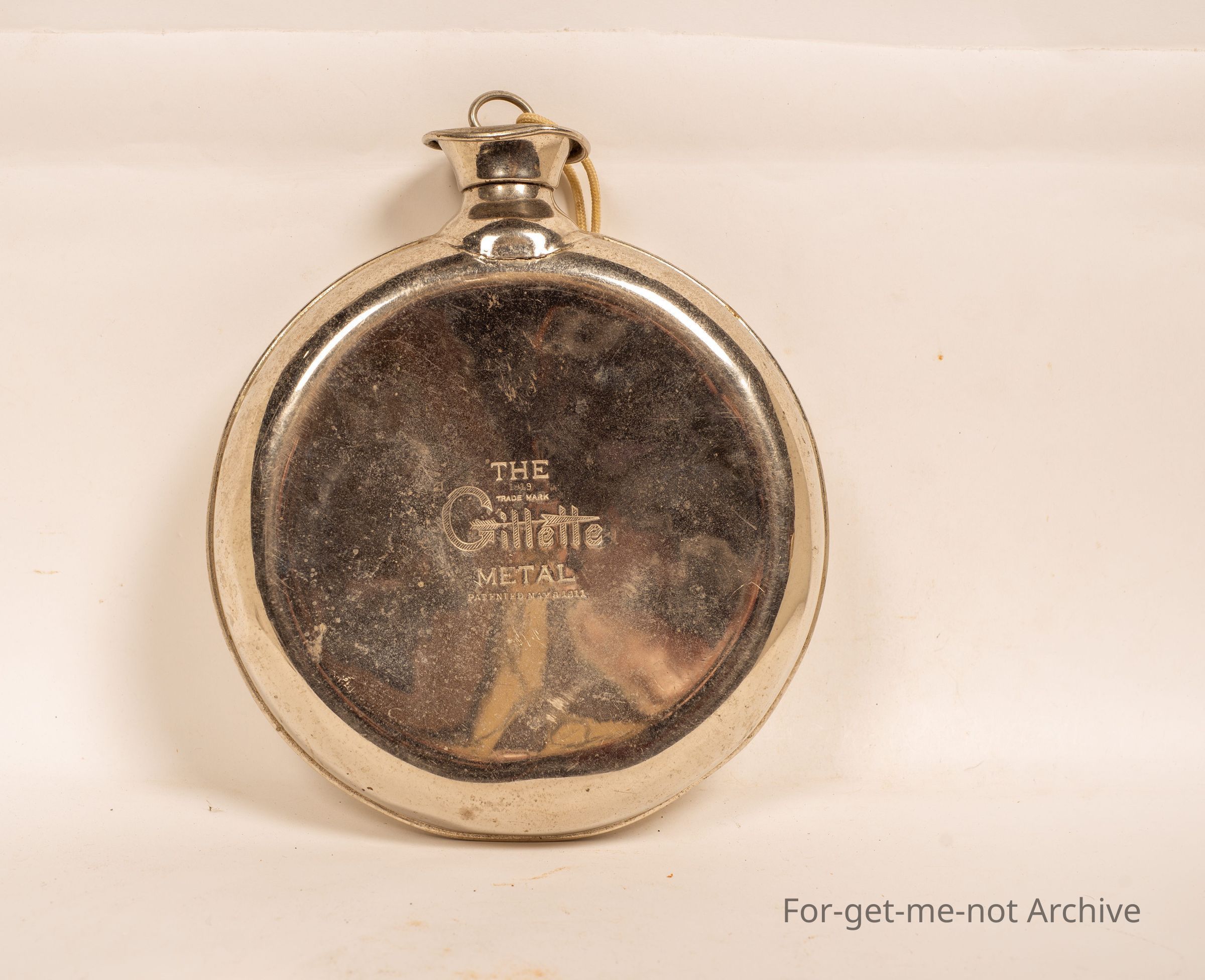A, water bottle hot water bottle, but a metal one made by Gillette, Metal. Patent, 1912, with original stopper in very good condition. A