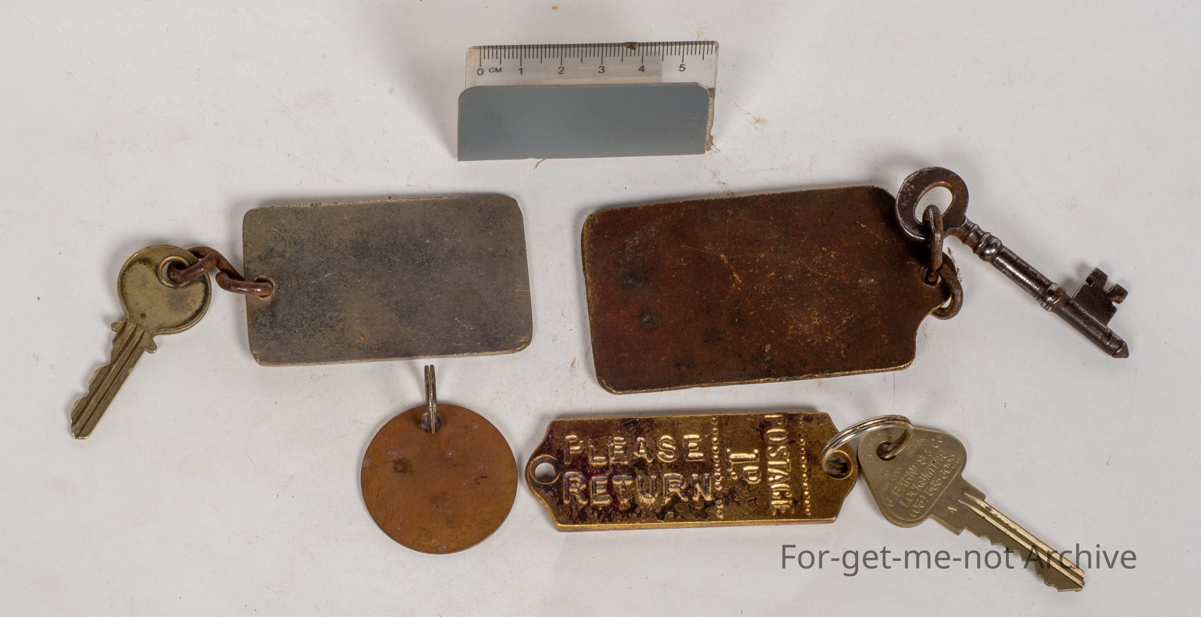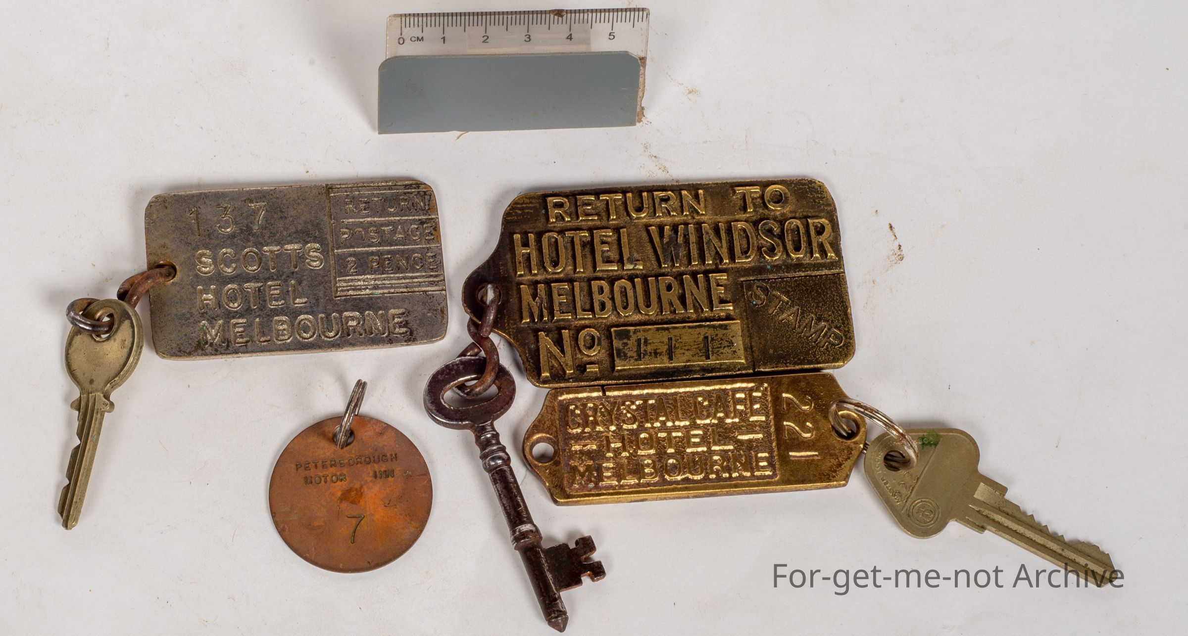 These are a key ring when you booked a room at Scotts Hotel. This was with the key if you forgot to hand it in as an area for return postage which is tuppence, Scotts Hotel Melbourne. The next one is from same thing, if you forgot to give it in, return to Hotel Windsor Melbourne with a stamp with the key. 3rd one, is Crystal Cafe Hotel Melbourne with the key with the return postage 1penny, please return. The next one is, a key ring with a little cheap plaque, Peterborough Motor Inn, room 7. This has never been returned either.Collection